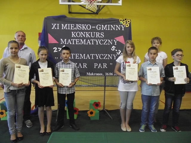 16 czerwca 2014 w Szkole Podstawowej w Mokronosie odbył się XI Miejsko - Gminny Konkurs Matematyczny "Matematyczny Czar Par". Miejce III w kategori uczniów kl. IV zdobyli Maria Malecha oraz Jan Drukarczyk. Gratulujemy!
