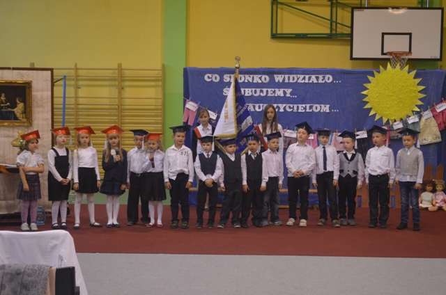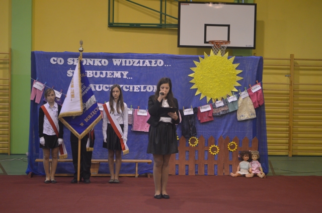 W tym szczególnym dniu, nie mogło też zabraknąć życzeń, wierszy i piosenek dla nauczycieli oraz pracowników szkoły. Dopełnieniem życzeń były słoneczniki. Następnie głos zabrała p. dyrektor Irena Konarczak- Bojanek, która podziękowała uczniom za występy i złożyła życzenia pracownikom szkoły oraz wręczyła nagrody.
