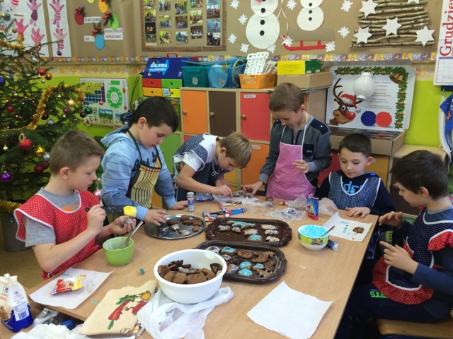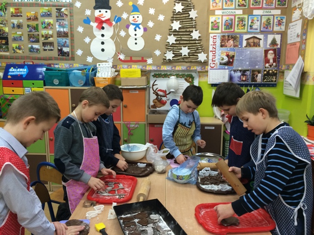 Przez cały adwent przygotowujemy się do Świąt Bożegonarodzenia. Jednym ze zwyczajów bożonarodzeniowych jest pieczenie pierników. 18 grudnia b.r. klasa II piekła pierniki. Mama Ady przygotowała na tę okoliczność ciasto piernikowe. Najpierw przygotowaliśmy stanowiska pracy dla chłopców i dziewczynek. Każda grupa otrzymała ciasto, które rozwałkowała, a następnie różnymi foremkami wykrawała pierniki. Po upieczeniu, pierniki zostały polukrowane i ozdobione. Wszyscy pięknie pracowali,