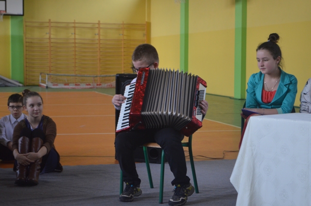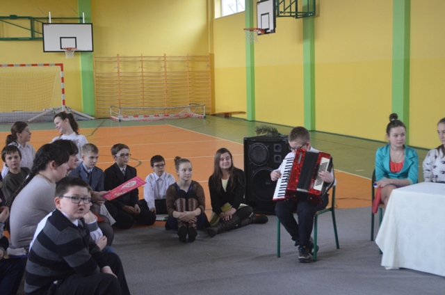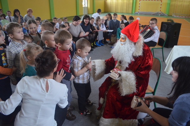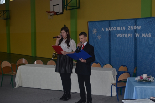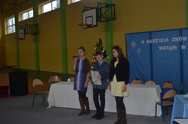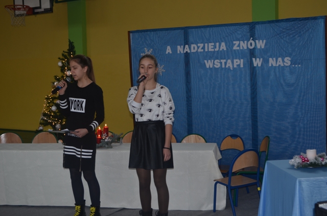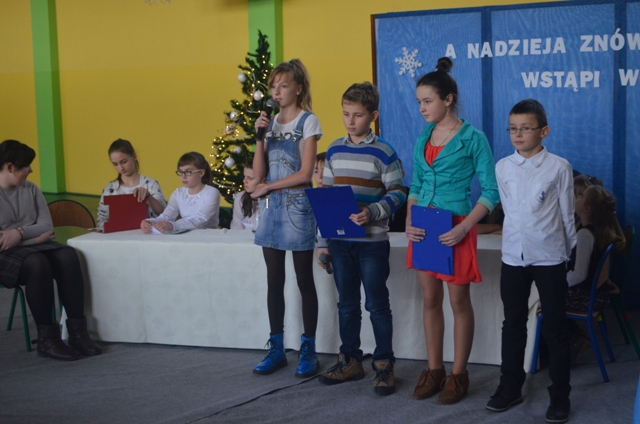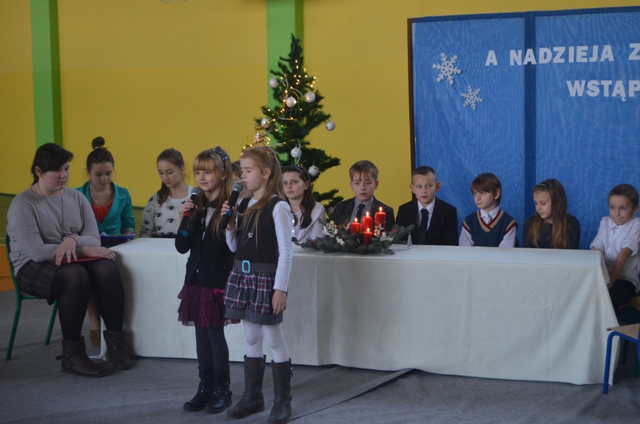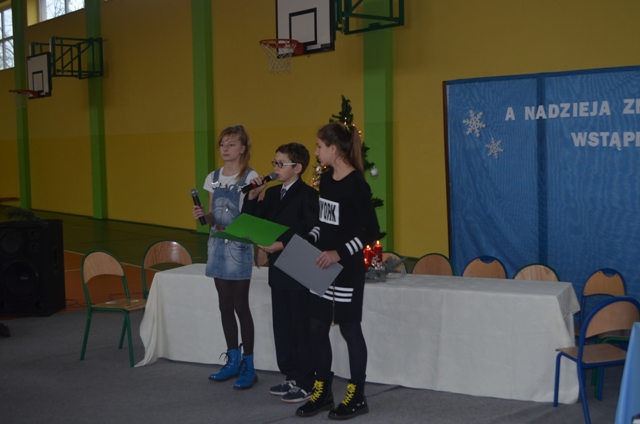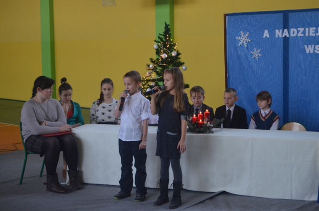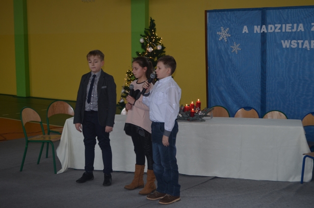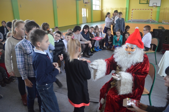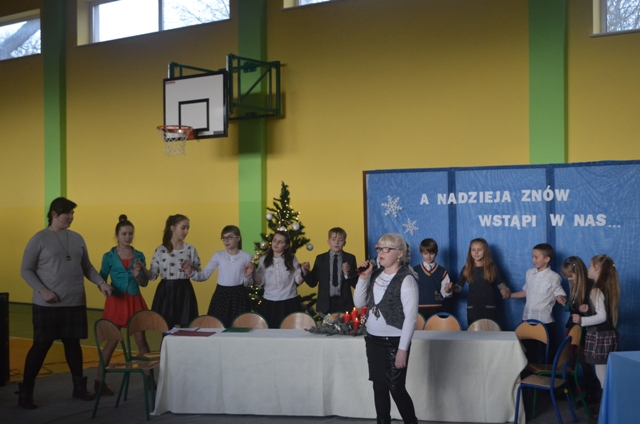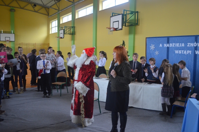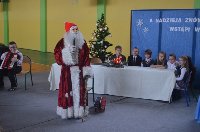 Uczniowie wykonali popularne kolędy i pastorałki, zachęcając wszystkich do wspólnego śpiewu. Dzieci z klasy IV wykonały kolędy grając na instrumentach muzycznych. Na koiec spotkania dotarł gwiazdor, który wręczył dzieciom prezenty.