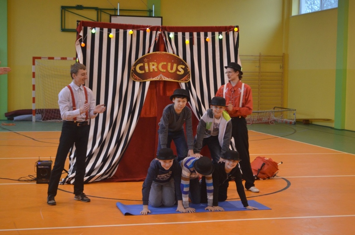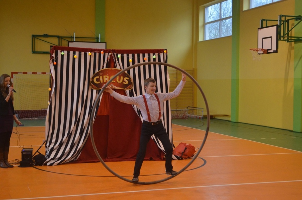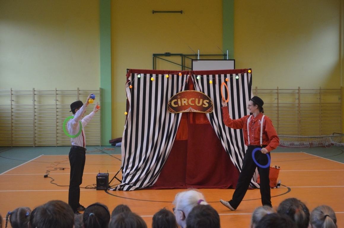 Artyści teatru „Z głową w chmurach” i jednocześnie pedagodzy Szkoły Artystyczno Akrobatycznej w Poznaniu zabrali nas do barwnego świata akrobatyki cyrkowej. W pierwszej części spotkania widzieliśmy niebywałe popisy żonglerskie. Franciszek Leśniewski zaprezentował nam kolejne kroki w nauce żonglowania i podpowiedział, jak możemy sami spróbować tej pożytecznej dla naszego umysłu sztuki. Zobaczyliśmy kilkanaście sposobów żonglowania piłeczkami, jak również obręczami i maczugami.