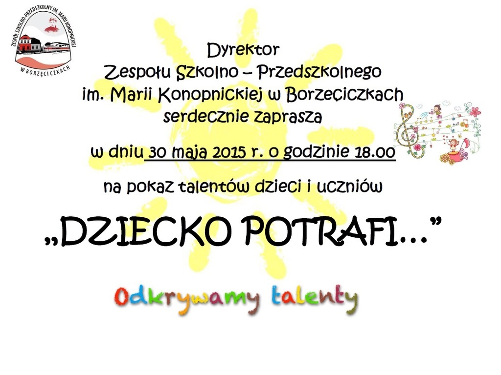 Serdecznie zapraszamy na pokaz talentów dzieci i uczniów naszego Zespołu w dniu 30 maja 2015 r. o godz. 18.00