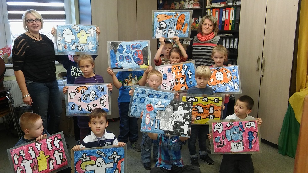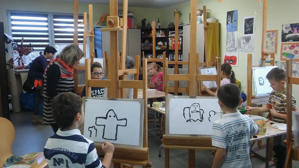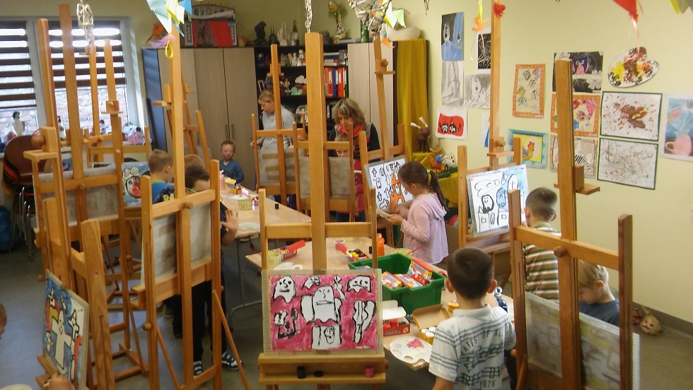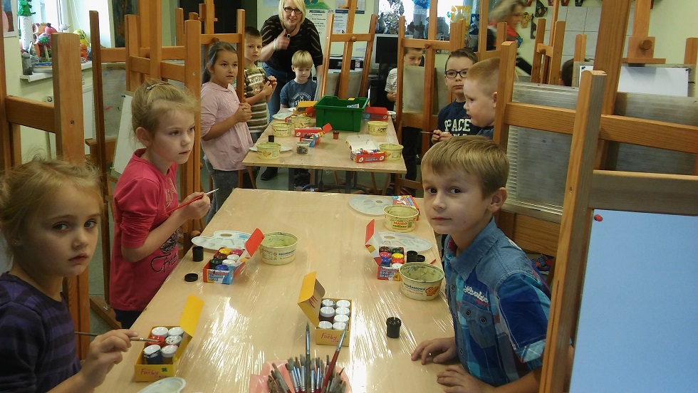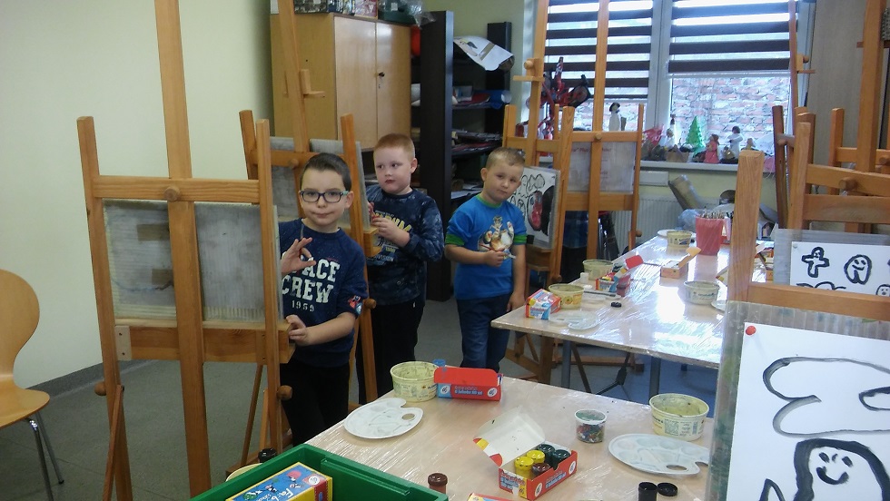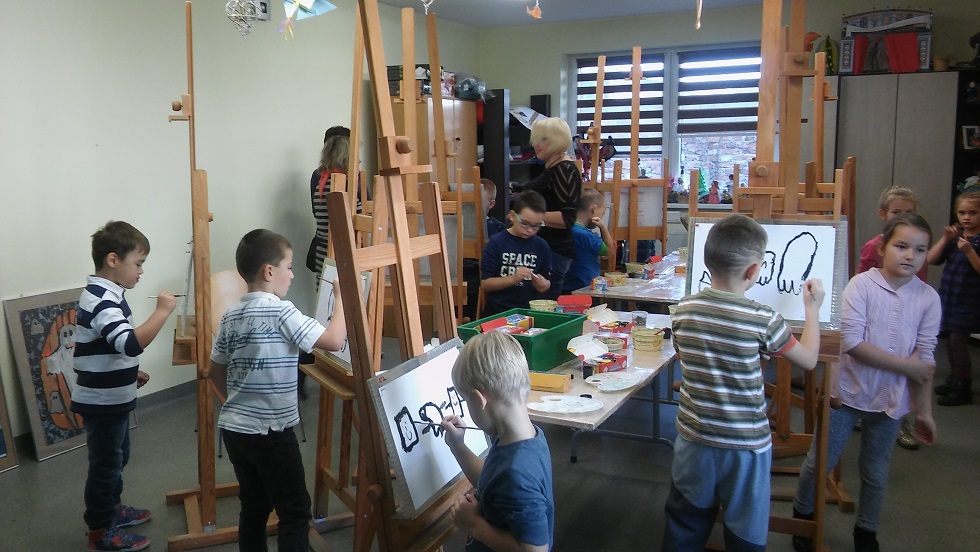 Najpierw uczniowie udali się do Ośrodka Kultury. Tam pod czujnym okiem plastyka p. M. Malinowskiej uczestniczyli w warsztatach plastycznych.