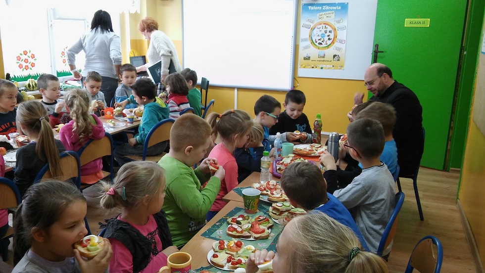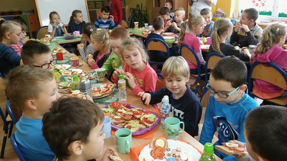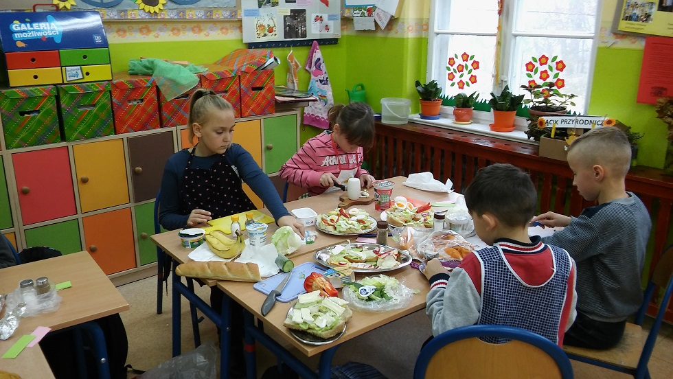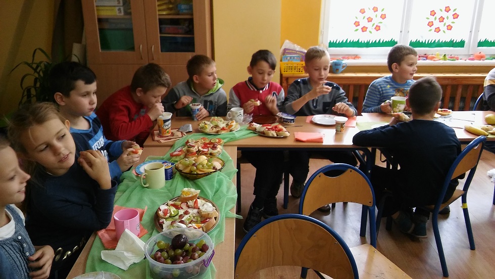 Wyposażeni w niezbędną wiedzę, z ogromnym entuzjazmem przystąpili do zajęć praktycznych. Zajęcia te były formą udziału w ,,Ogólnopolskim Dniu Śniadanie Daje Moc” obchodzonym 6 listopada b.r. Prawdziwym testem umiejętności i sprawdzeniem wiedzy było samodzielne wykonanie pysznych kanapek zawierających moc witamin. Nie zabrakło też jogurtów o różnej gamie smaków i sałatek owocowych. Na koniec dzieci dumne z wykonanej pracy zasiadły do wspólnego – zdrowego śniadania. Spożywały je z apetytem. Mamy nadzieję, że nawyk zdrowego śniadania zagości już na dobre w ich życiu.