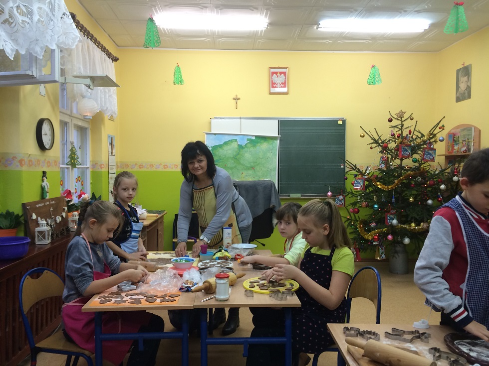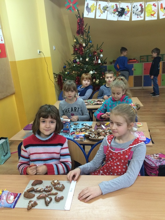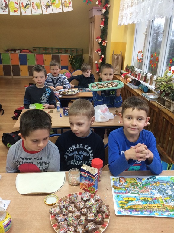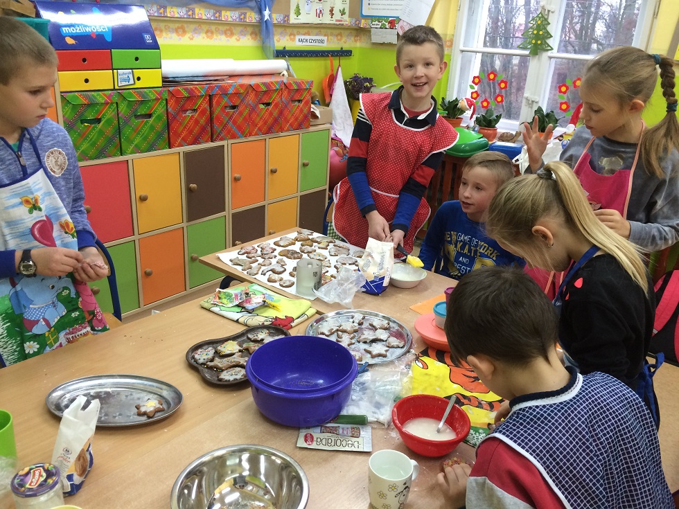 18 grudnia b.r. klasy II i III podtrzymując ten piękny zwyczaj piekły pierniki w szkole. Mama Patryka i tata Weroniki przygotowali z tej okazji ciasto piernikowe. Po przygotowaniu stanowisk pracy każda grupa otrzymała ciasto, które rozwałkowała, a następnie różnymi foremkami wykrawała pierniczki, pomagały im w tym panie wychowawczynie. Po upieczeniu, pierniki zostały polukrowane i ozdobione wg własnych pomysłów i inwencji twórczych. Wszyscy bardzo ładnie pracowali. Gotowe pierniczki uczniowie wspólnie degustowali. Każdy zabrał też pierniczki do poczęstowania swojej rodziny, a najładniejsze zostawiliśmy na Wigilię klasową .