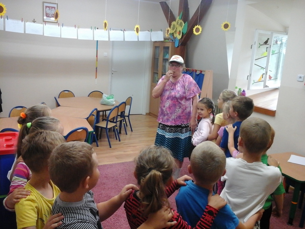 We wtorek 6.września rozpoczęliśmy w naszym Zespole cykl spotkań pt.: „Dziadkowe, odlotowe zabawy podwórkowe”. Chcemy w ten sposób przekazać naszym dzieciom, w co i czym bawili się ich dziadkowie będąc dziećmi. Pierwszą babcią, która przyjęła wyzwanie była babcia Halinka, która z wielką radością rozpoczęła ten cykl zabaw. Opowieści babci Halinki o zabawkach i zabawach z jej dzieciństwa, przerywane były przez zabawy „Jedzie pociąg z daleka”, „Chodzi lisek koło drogi” czy „Mam chusteczkę haftowaną.