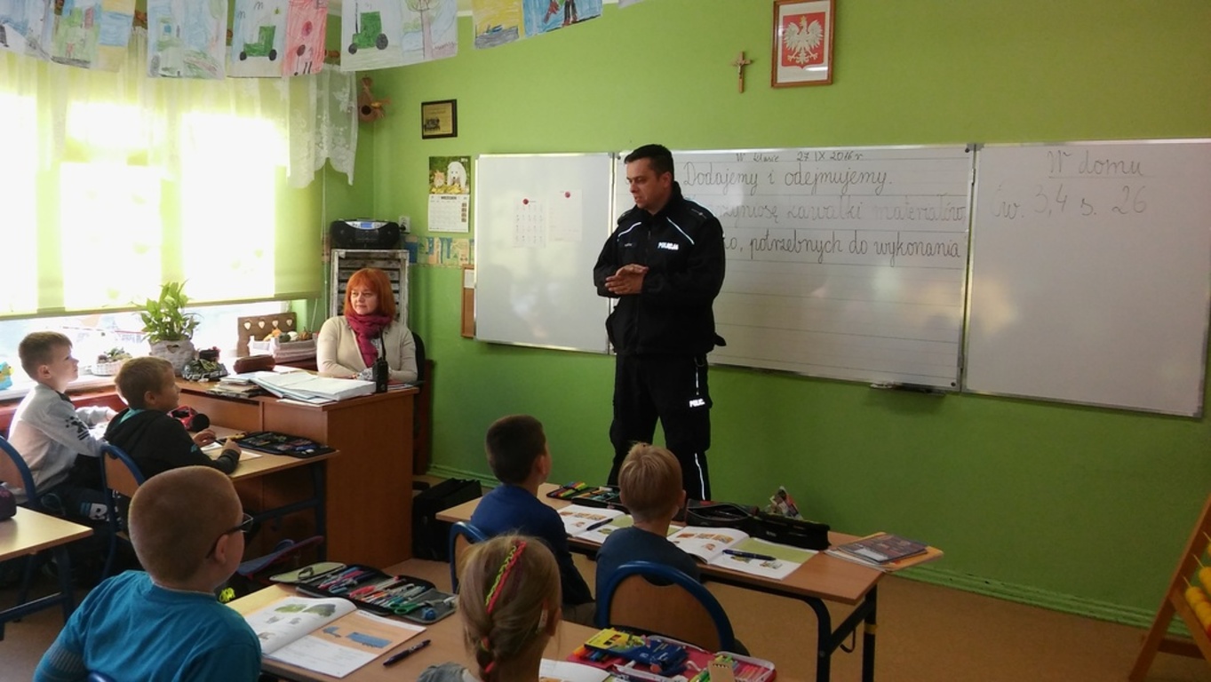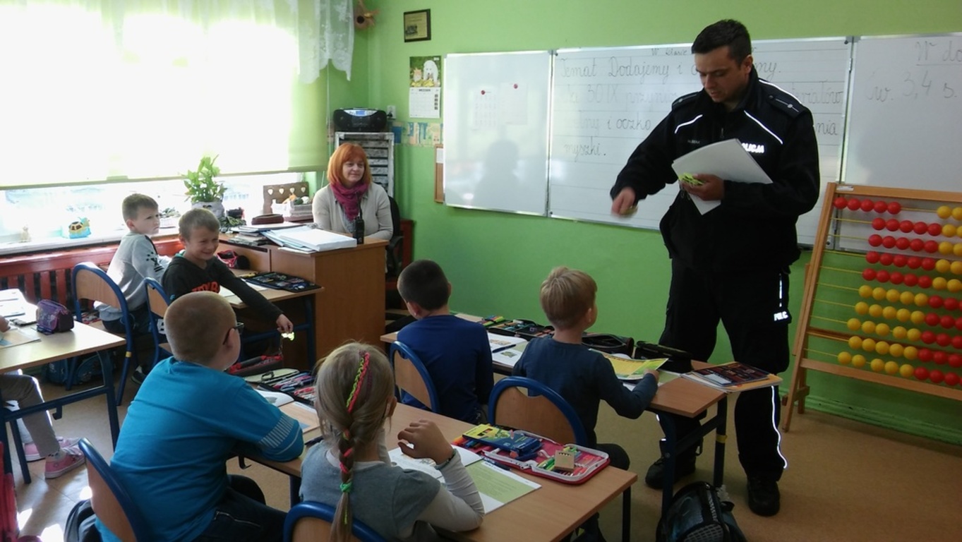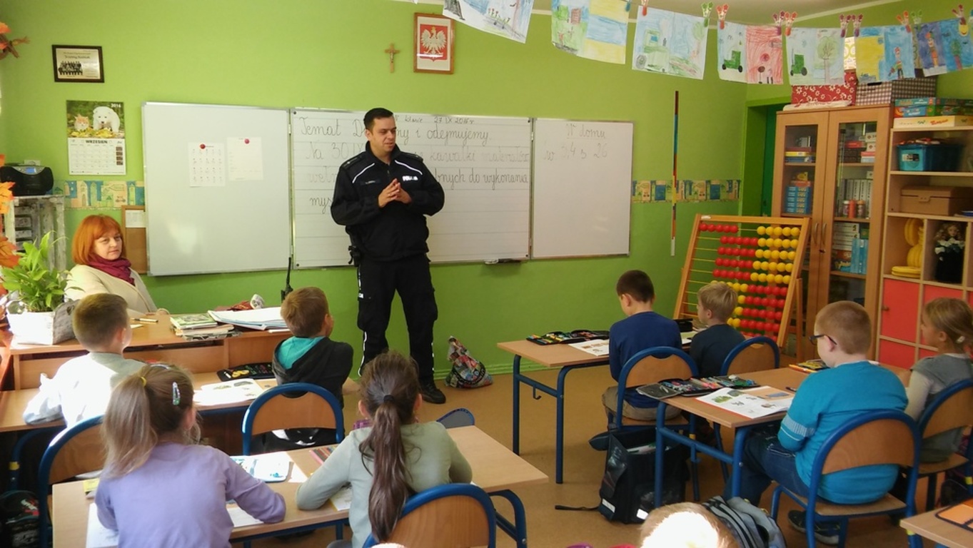 Dnia 27 września uczniowie klas I i II uczestniczyli w spotkaniu z mł. aspirantem Michałem Ciszakiem. Tematem pogadanki była „Bezpieczna droga do szkoły”. Pan policjant przypomniał zasady bezpiecznego poruszania się po drodze, zachęcał do wyposażenia ubiorów i plecaków w elementy odblaskowe. Przestrzegał również najmłodszych przed rozmowami z nieznajomymi. Uczniowie aktywnie uczestniczyli w spotkaniu, zadawali wiele pytań dotyczących bezpieczeństwa. Wykazywali się też dobrą znajomością numerów alarmowych.