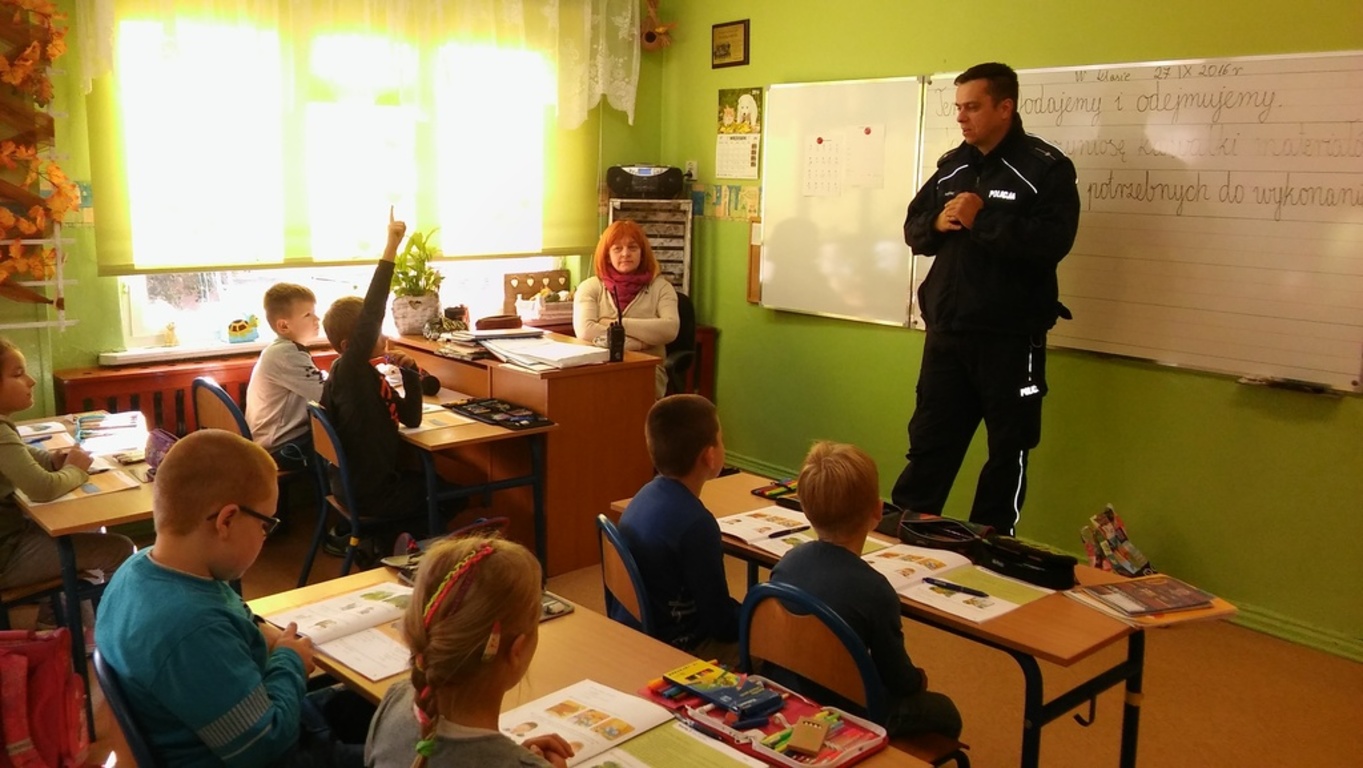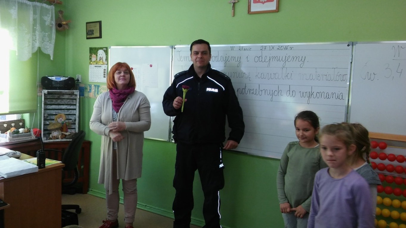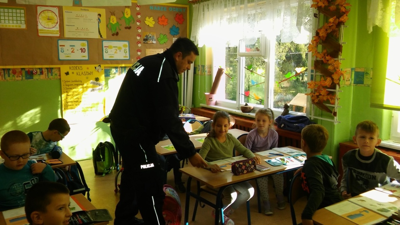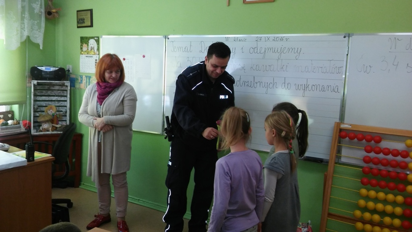 Dnia 27 września uczniowie klas I i II uczestniczyli w spotkaniu z mł. aspirantem Michałem Ciszakiem. Tematem pogadanki była „Bezpieczna droga do szkoły”. Pan policjant przypomniał zasady bezpiecznego poruszania się po drodze, zachęcał do wyposażenia ubiorów i plecaków w elementy odblaskowe. Przestrzegał również najmłodszych przed rozmowami z nieznajomymi. Uczniowie aktywnie uczestniczyli w spotkaniu, zadawali wiele pytań dotyczących bezpieczeństwa. Wykazywali się też dobrą znajomością numerów alarmowych.