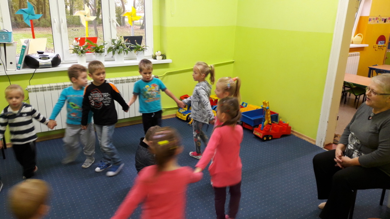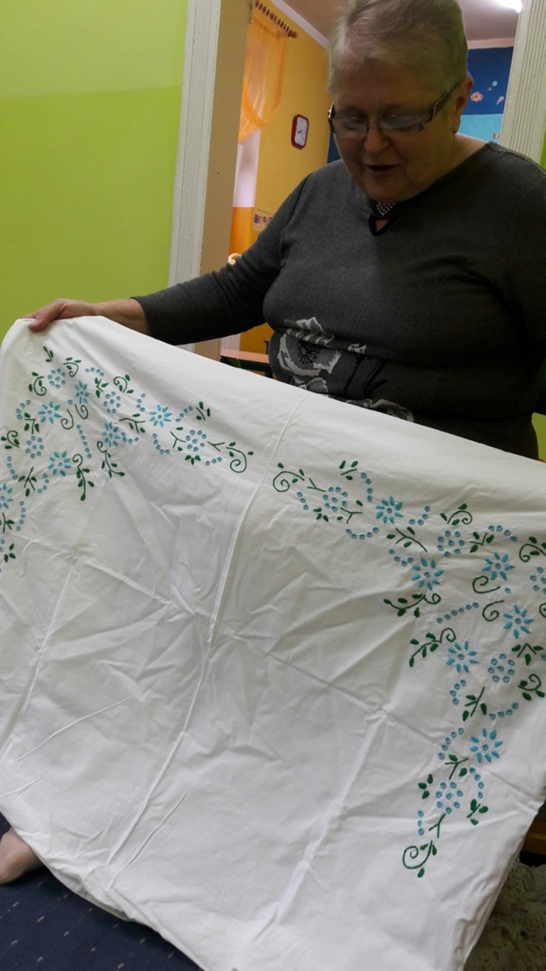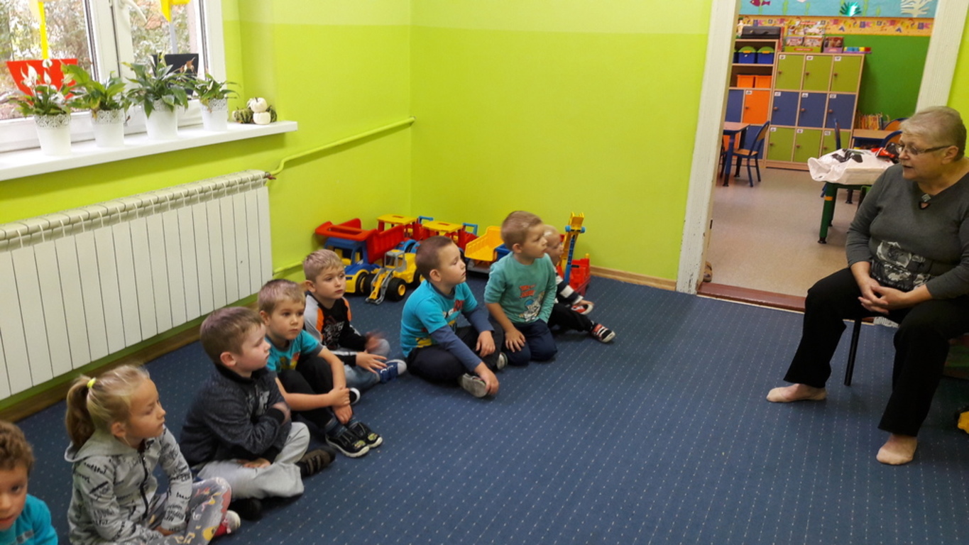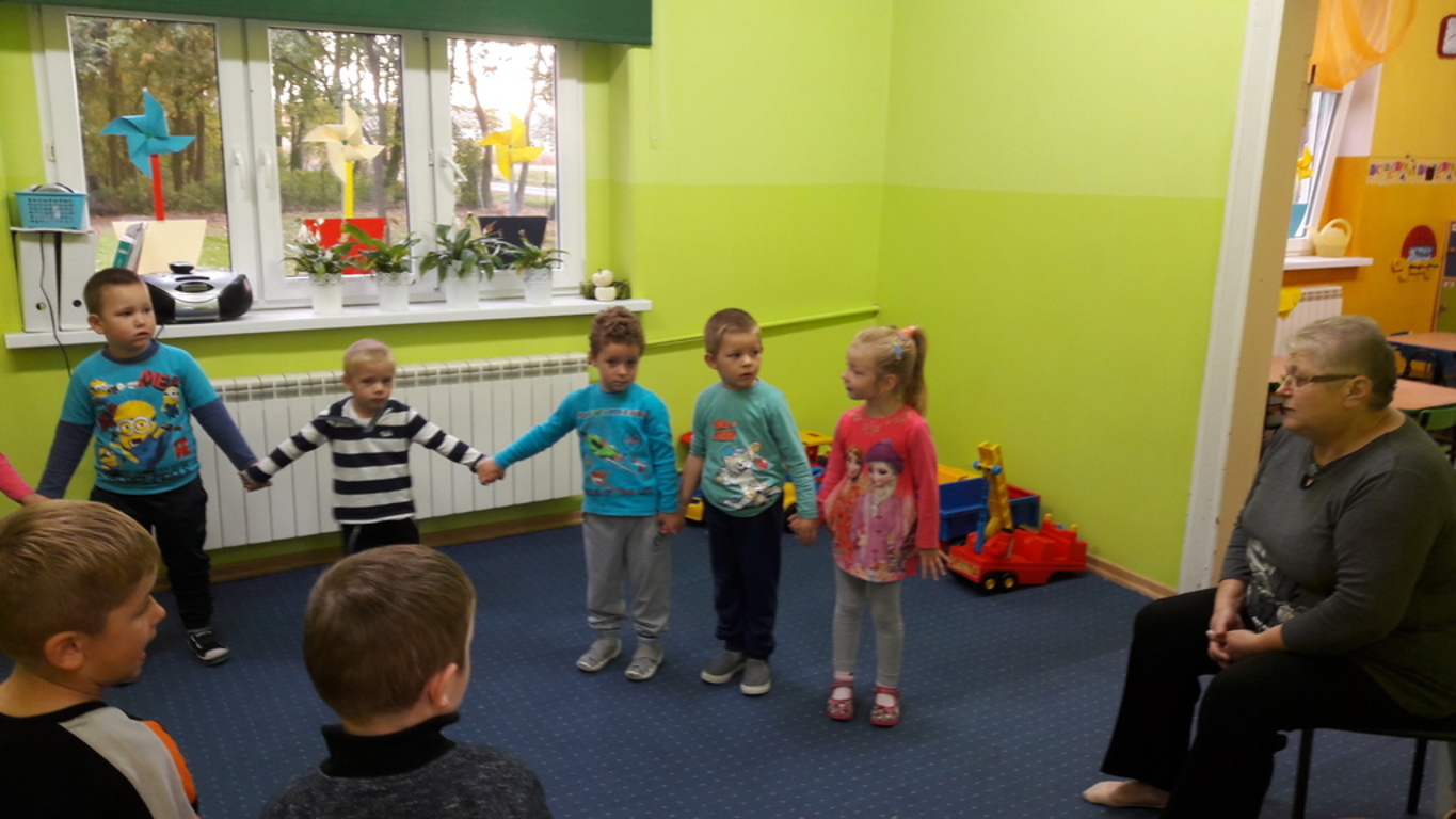 W piątek 30 września z samego rana odwiedziła nas babcia Pawełka-jednego z naszych przedszkolaków. Celem jej wizyty było przedstawienie dzieciom zabaw, w których uczestniczyła, kiedy była w wieku przedszkolnym. Dzieci chętnie słuchały jak babcia bawiła się w „Mam chusteczkę”, „Chodzi lisek”, „Gąski, gąski do domu” oraz inne, w które bawiliśmy się wspólnie. Babcia zaprezentowała również chusty, które własnoręcznie wykonywała w wolnym czasie będąc starszą dziewczyną. Największym zainteresowaniem okazała się zabawa w „gąski”, w którą dzieci chciały się bawić cały dzień.