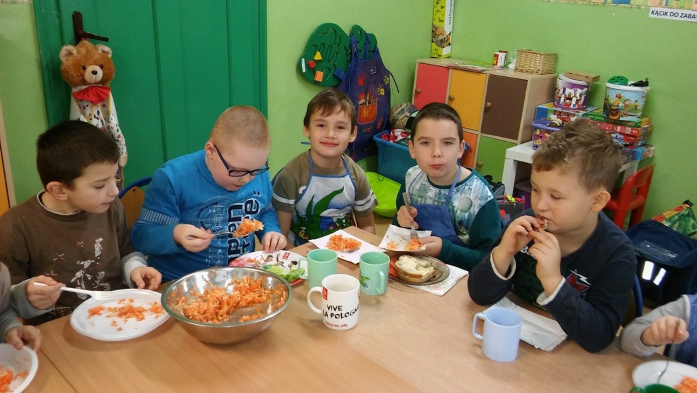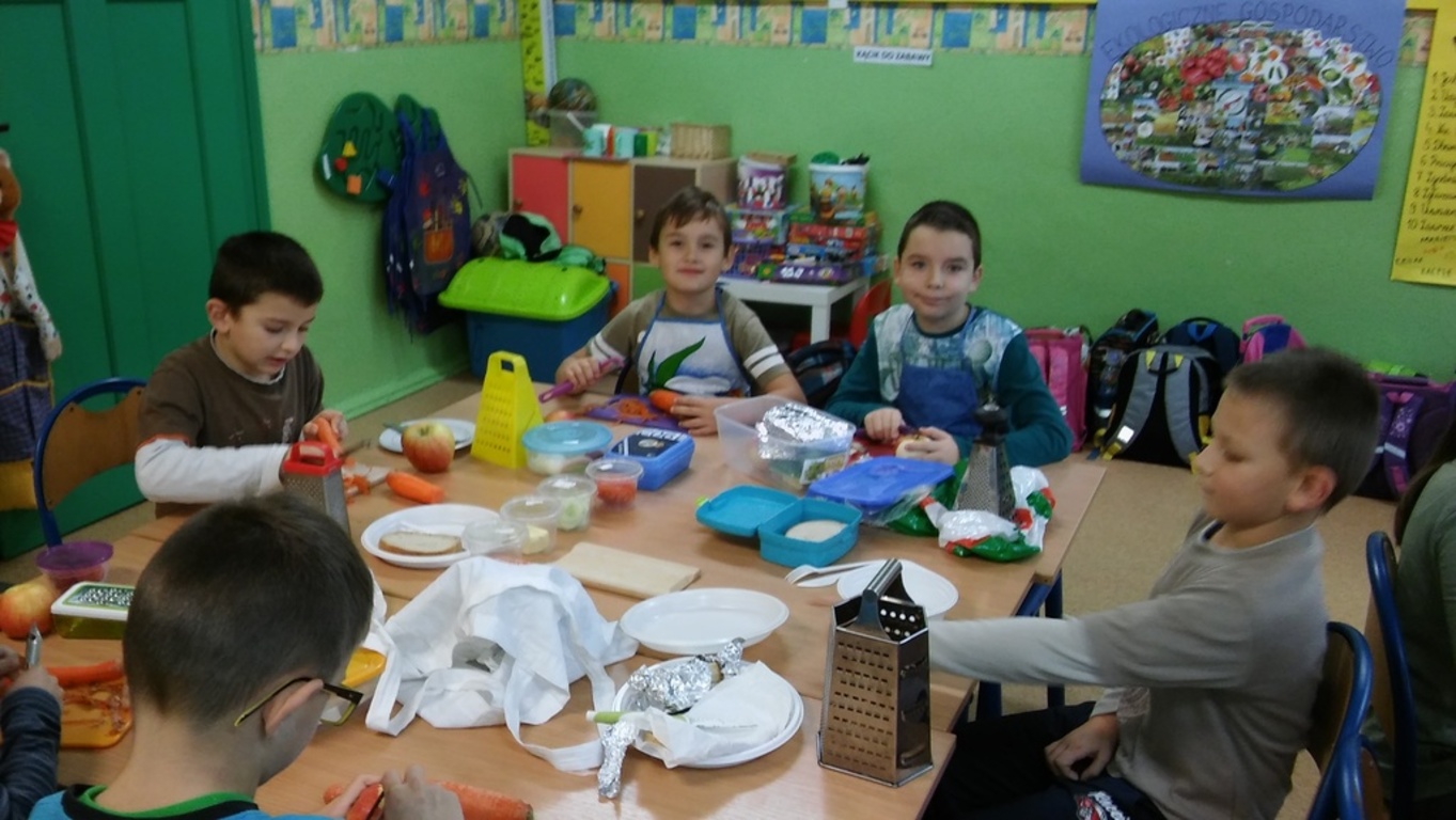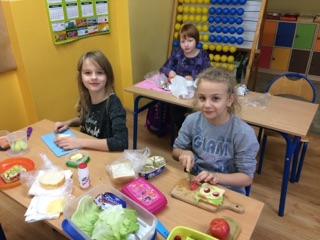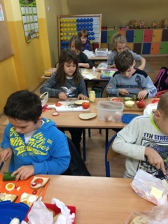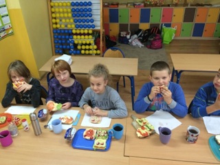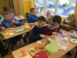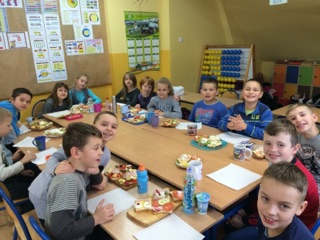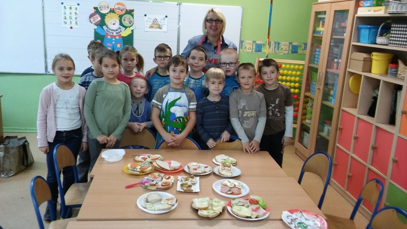 8 listopada uczniowie klas I-III w ramach programu edukacyjnego obchodzili Dzień Śniadanie Daje Moc. Pierwszym etapem były zajęcia edukacyjno – dydaktyczne, podczas których najmłodsi poznali m.in. 12 zasad zdrowego i prawidłowego żywienia oraz rolę śniadania w życiu człowieka. Prawdziwym testem umiejętności i sprawdzeniem wiedzy było samodzielne wykonanie pysznych kanapek zawierających moc witamin. Nie zabrakło też jogurtów o różnej gamie smaków i sałatek owocowych. Na koniec dzieci dumne z wykonanej pracy zasiadły do wspólnego – zdrowego śniadania. Spożywały je z apetytem. Mamy nadzieję, że nawyk zdrowego śniadania zagości już na dobre w ich życiu.