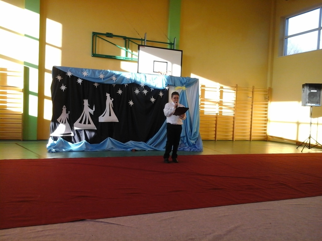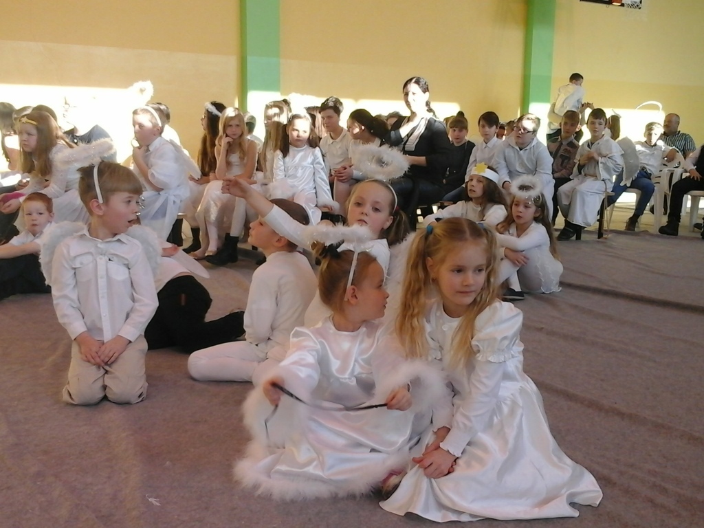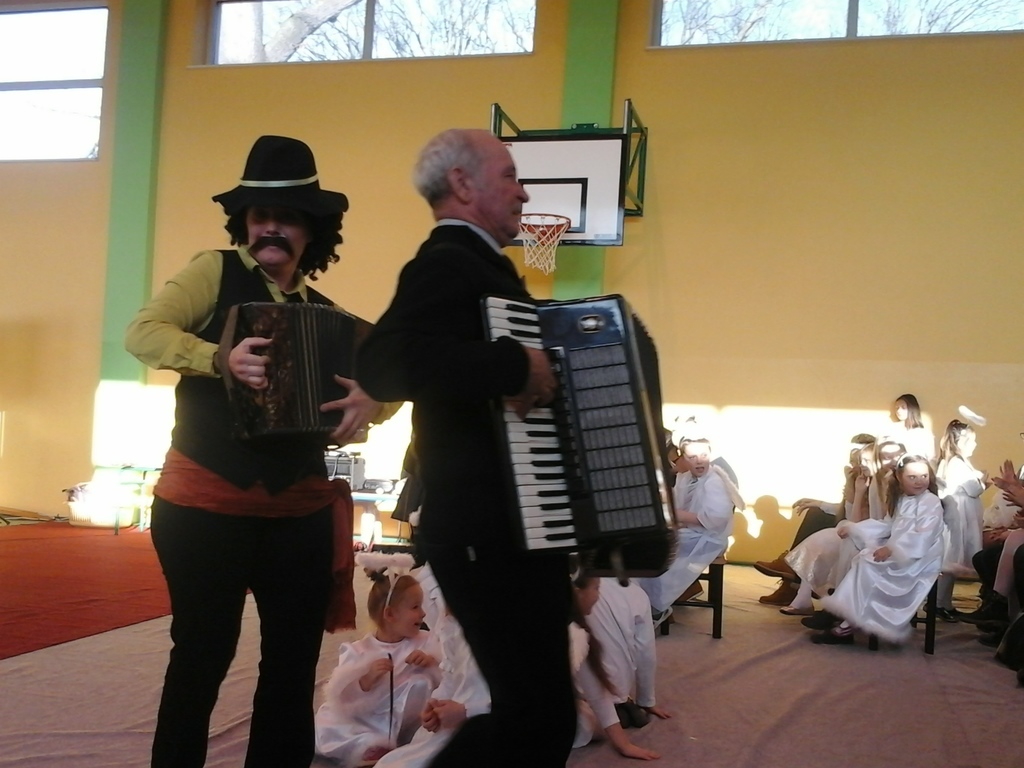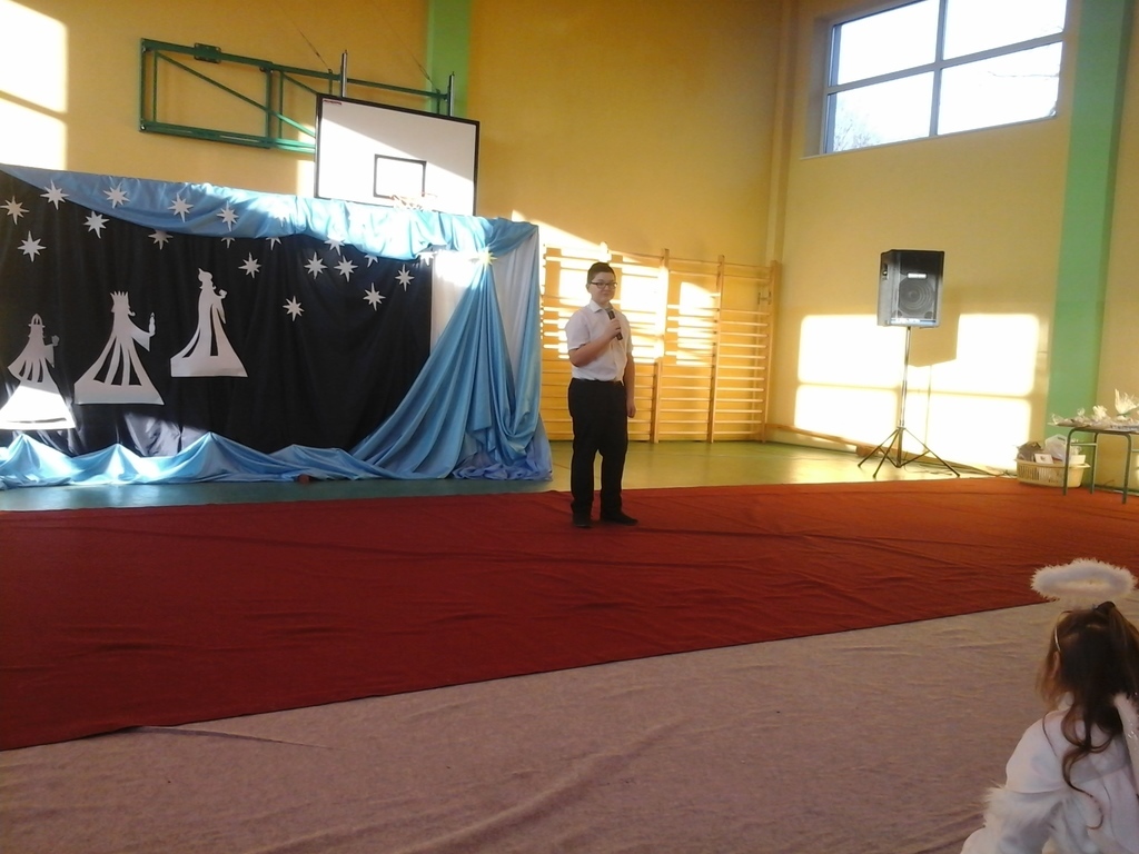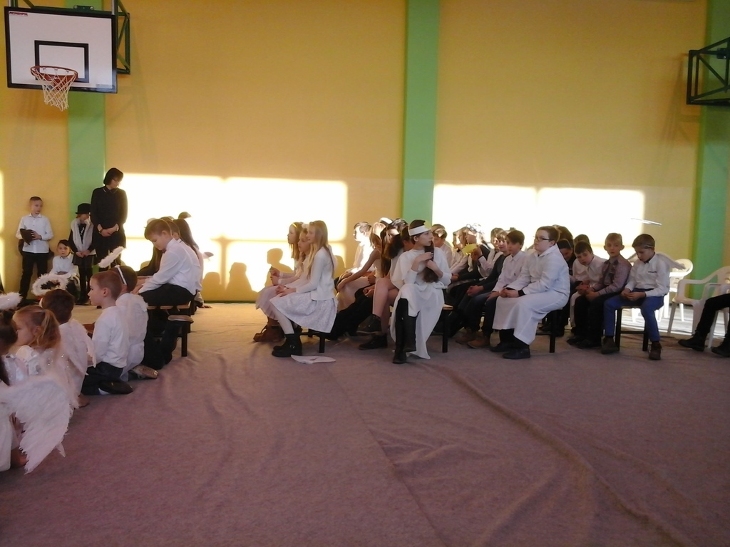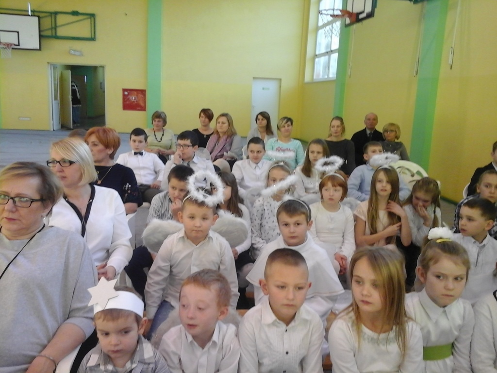 22 grudnia w naszej szkole panował świąteczny nastrój. Dominował w tym dniu kolor biały, gdyż nasze dzieci przebrane były za aniołki. O godz. 10.00 wraz z naszymi zaproszonymi gośćmi zebraliśmy się na sali gimnastycznej, aby obejrzeć część artystyczną w wykonaniu naszych dzieci i rodziców. Gościliśmy w tym dniu ks. Proboszcza Macieja Krulaka, który rozpoczął naszą uroczystość przeczytaniem fragmentu z Pisma św. mówiącego o narodzeniu się Pana Jezusa. Gościliśmy również radnych pana Wojciecha Dykcika oraz Leszka Chojnickiego i sołtysa wsi Pogorzałki Wielkie pana Leszka Wawrzyniaka. Po wysłuchaniu przepięknych kolęd i pastorałek przyszedł czas na Herody, czyli ludowe przedstawienie bożonarodzeniowe, które wykonali rodzice należący do grupy teatralnej działającej w szkole oraz dzieci. Po krótkiej przerwie w oddali usłyszano zbliżający się śpiew. Jak się okazało byli to przezabawni Zapustnicy, którym przygrywał na akordeonie p. Eugeniusz Drukarczyk.