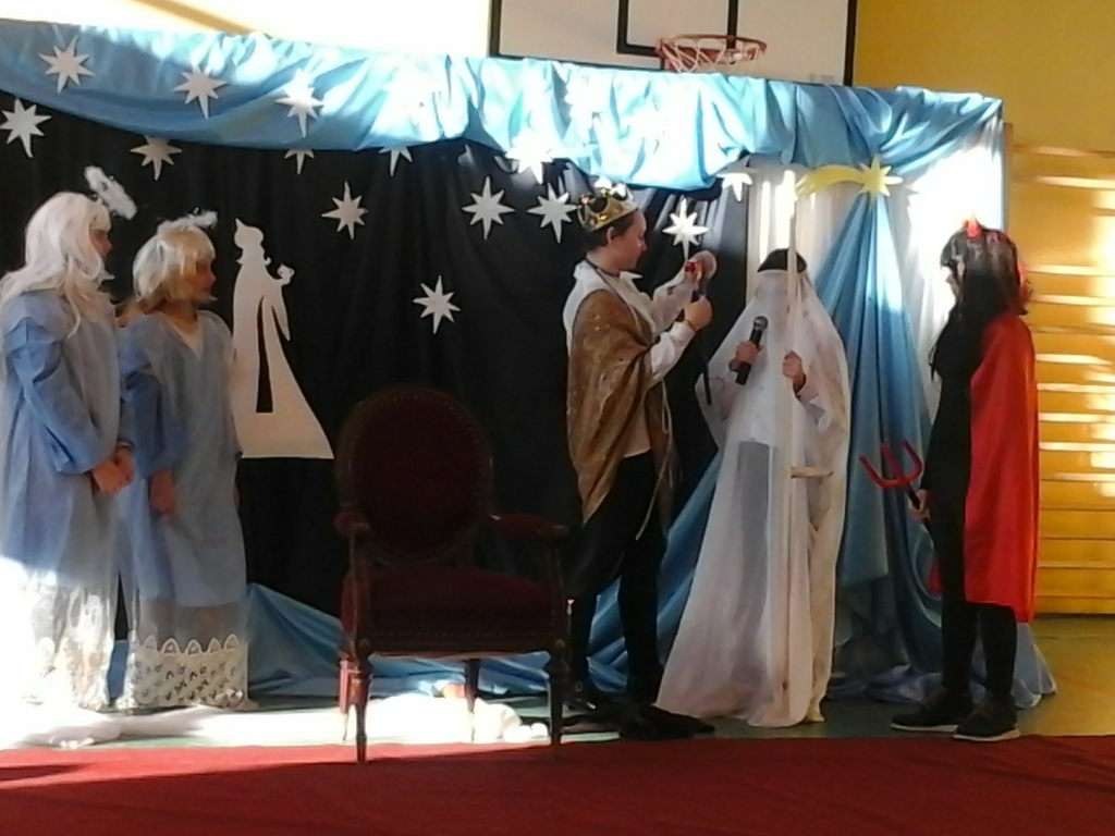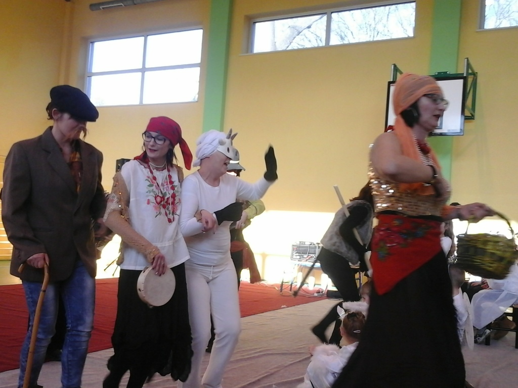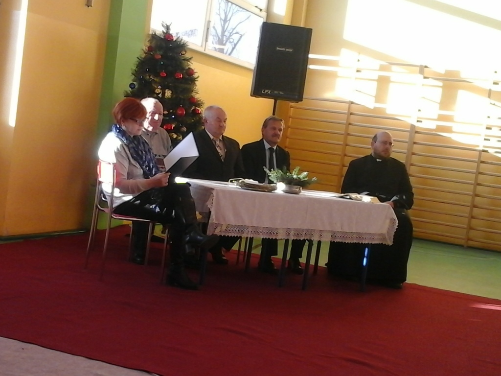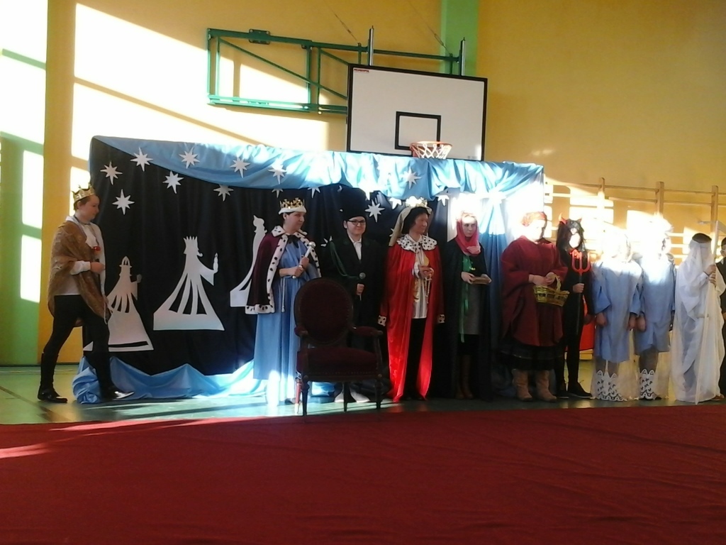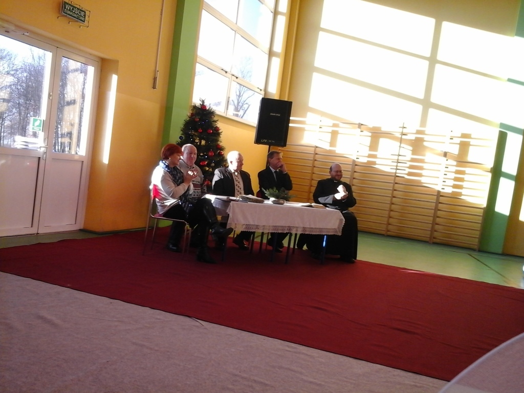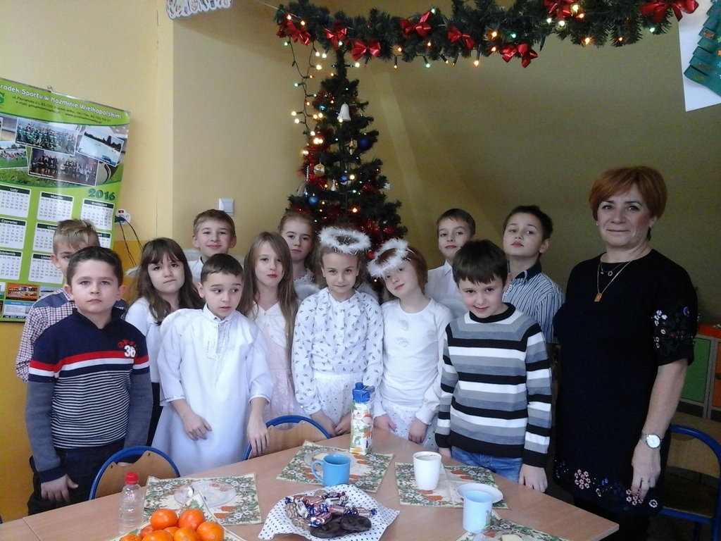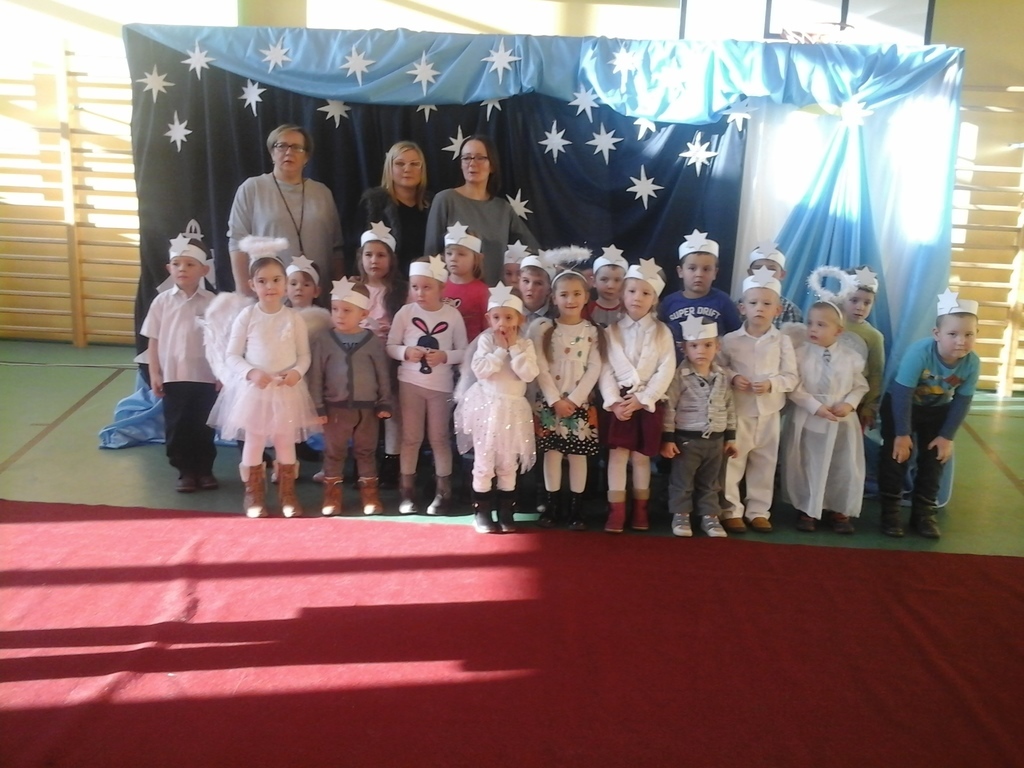 22 grudnia w naszej szkole panował świąteczny nastrój. Dominował w tym dniu kolor biały, gdyż nasze dzieci przebrane były za aniołki. O godz. 10.00 wraz z naszymi zaproszonymi gośćmi zebraliśmy się na sali gimnastycznej, aby obejrzeć część artystyczną w wykonaniu naszych dzieci i rodziców. Gościliśmy w tym dniu ks. Proboszcza Macieja Krulaka, który rozpoczął naszą uroczystość przeczytaniem fragmentu z Pisma św. mówiącego o narodzeniu się Pana Jezusa. Gościliśmy również radnych pana Wojciecha Dykcika oraz Leszka Chojnickiego i sołtysa wsi Pogorzałki Wielkie pana Leszka Wawrzyniaka. Po wysłuchaniu przepięknych kolęd i pastorałek przyszedł czas na Herody, czyli ludowe przedstawienie bożonarodzeniowe, które wykonali rodzice należący do grupy teatralnej działającej w szkole oraz dzieci. Po krótkiej przerwie w oddali usłyszano zbliżający się śpiew. Jak się okazało byli to przezabawni Zapustnicy, którym przygrywał na akordeonie p. Eugeniusz Drukarczyk.