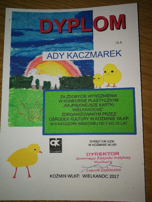 20 kwietnia Ada Kaczmarek oraz Maciej Ciepły odebrali z rąk Jarosława Ratajczaka, zastępcy burmistrza oraz Leszka Ziętkiewicza, dyrektora Gminnego Zespołu Instytucji Kultury w Koźminie Wielkopolskim nagrody przyznane w konkursie na najpiękniejszą kartkę wielkanocną. Maciej zdobył nagrodę w II kategorii wiekowej 7-10 lat, natomiast Ada zdobyła wyróżnienie. Serdecznie gratulujemy.