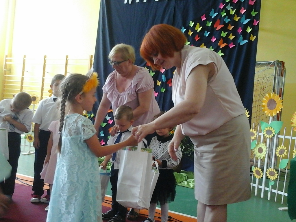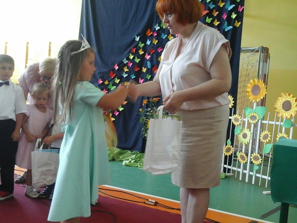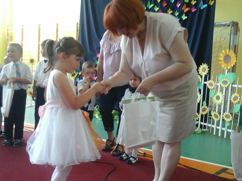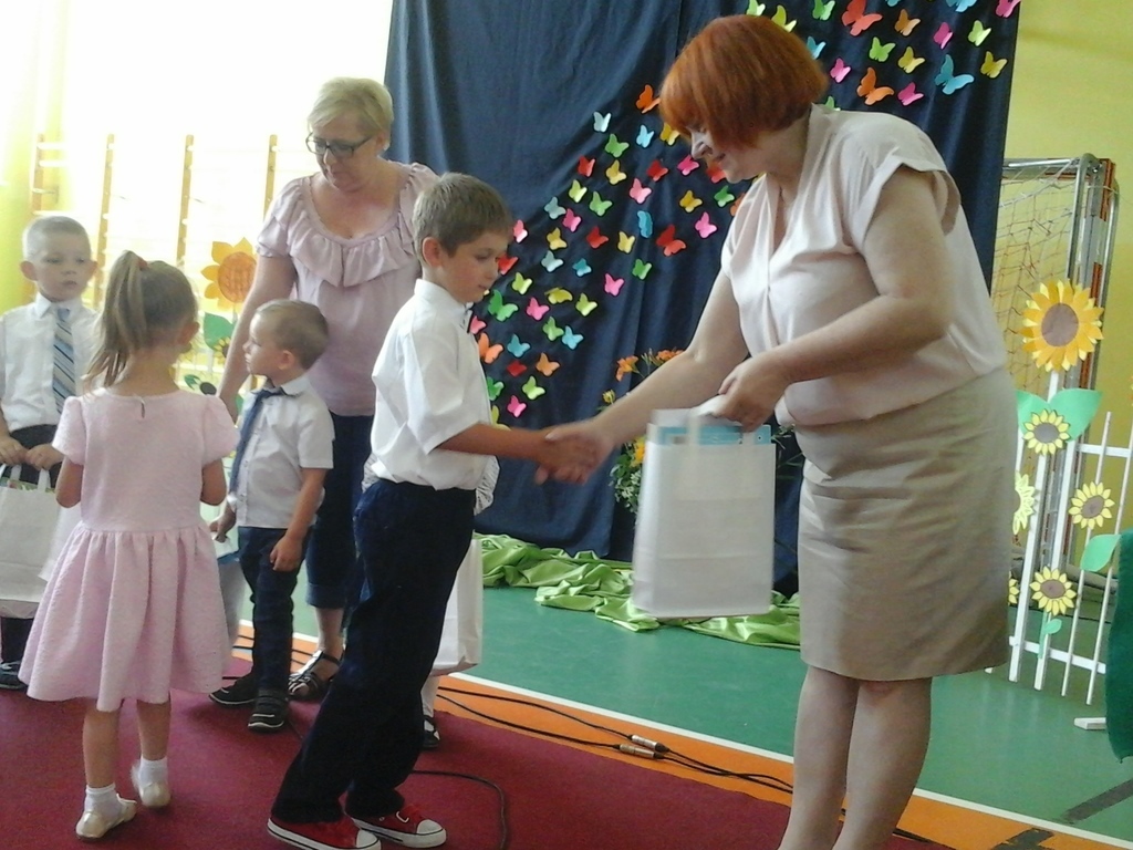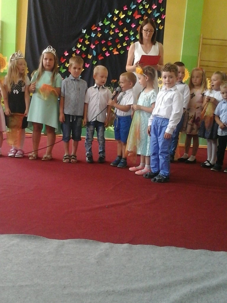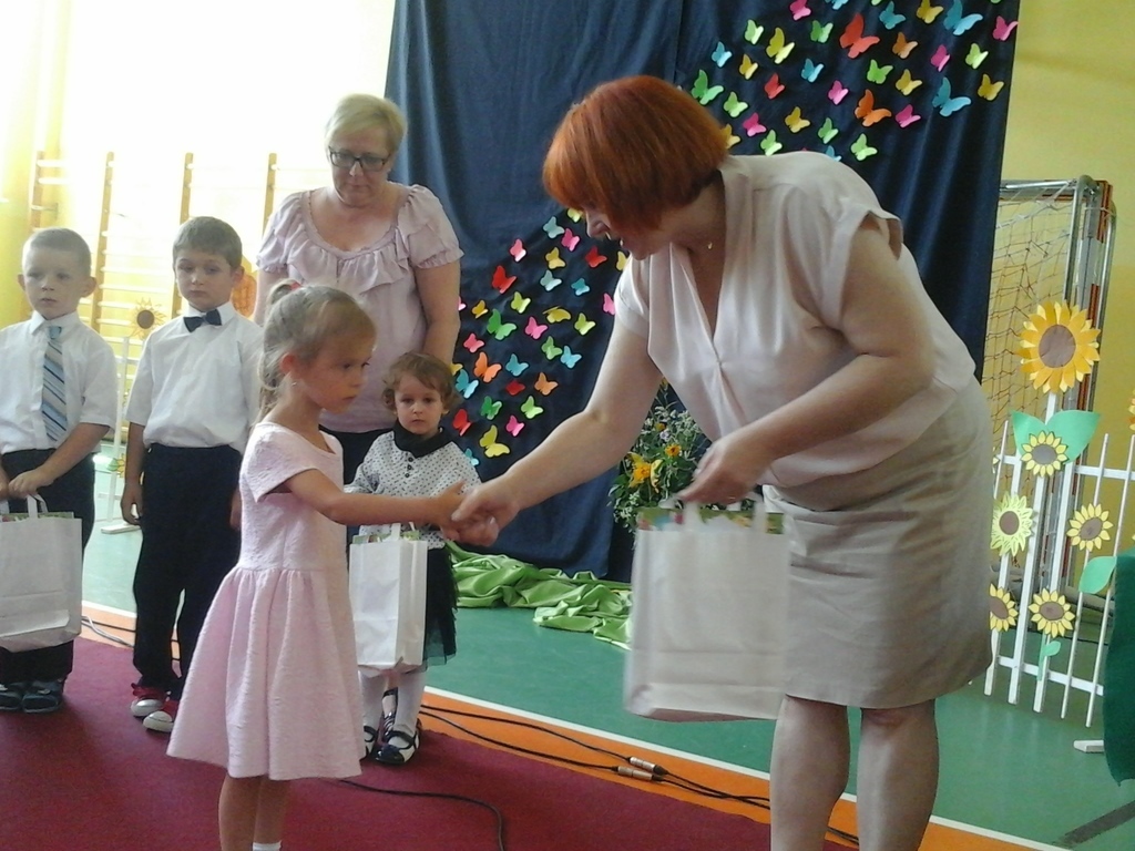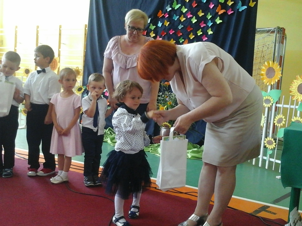 Przedszkolaki wierszykiem i piosenką podziękowały za cały rok w przedszkolu. Dzieci młodsze pożegnały się ze swoimi starszymi kolegami i koleżankami, którzy w nowym roku szkolnym rozpoczną już naukę w klasie pierwszej. Wszystkie dzieci otrzymały pamiątkowe dyplomy oraz zostały nagrodzone za udział w akcjach zbierania nakrętek, baterii oraz kasztanów.
