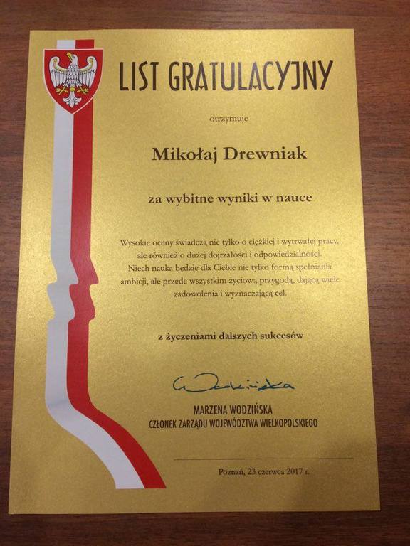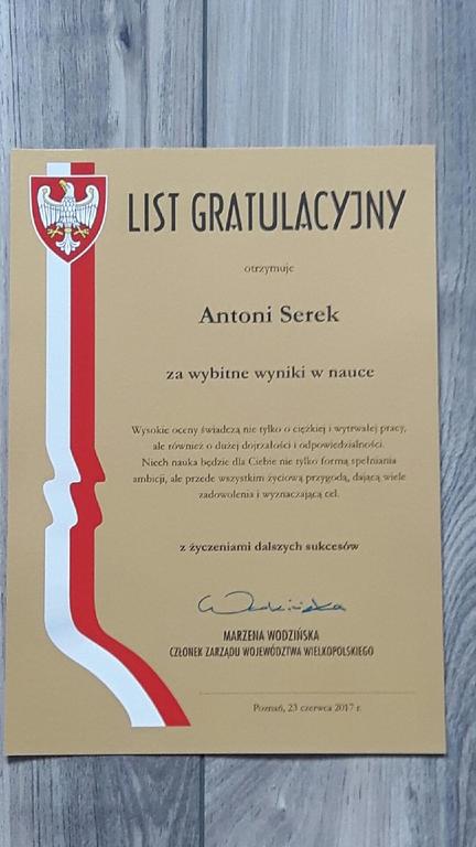 Miło nam poinformować, że trzech uczniów naszej placówki; Antoni Serek, Sebastian Kurkowiak i Mikołaj Drewniak otrzymali listy gratulacyjne z Zarządu Województwa Wielkopolskiego za wybitne wyniki w nauce. Serdecznie gratulujemy.