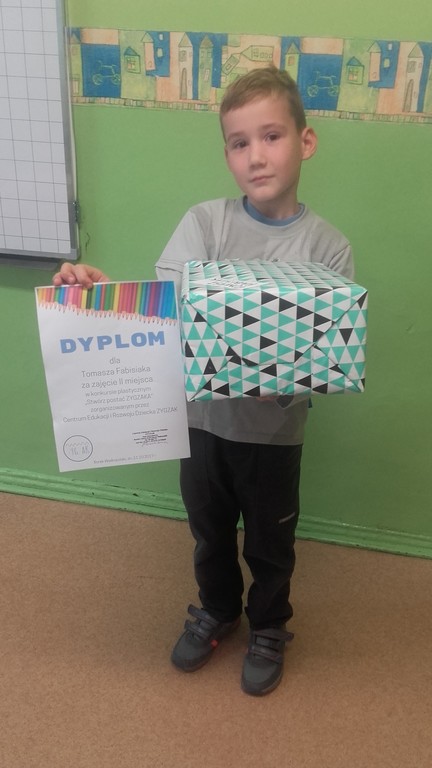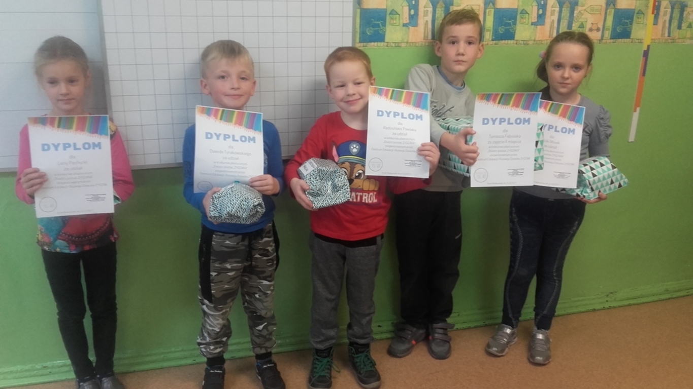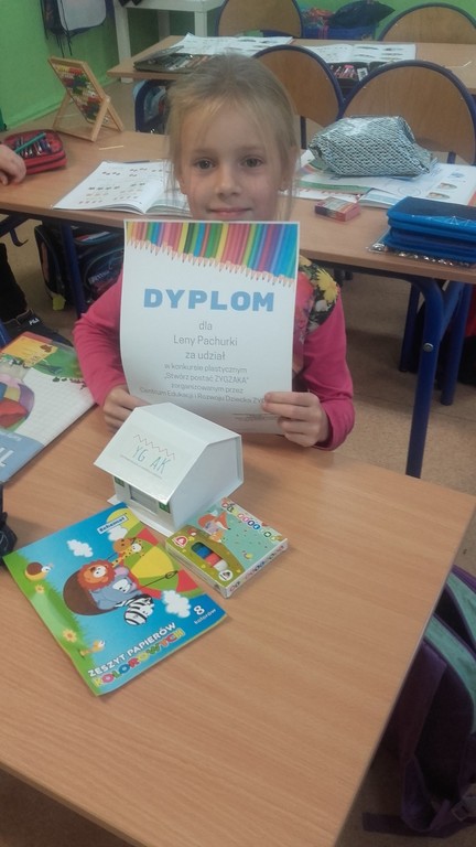 Dzieci z klasy I i oddziałów przedszkolnych wzięły udział w konkursie „STWÓRZ POSTAĆ ZYGZAKA” zorganizowanym przez Centrum Edukacji i Rozwoju dziecka Zygzak. Zadaniem uczniów było stworzenie postaci Zygzaka dowolną techniką plastyczną. Dzieci wykazały się dużą kreatywnością i powstało wiele wspaniałych prac. Wszystkie dzieci, które brały udział w konkursie otrzymały pamiątkowe dyplomy oraz drobne upominki. Oto zwycięzcy: