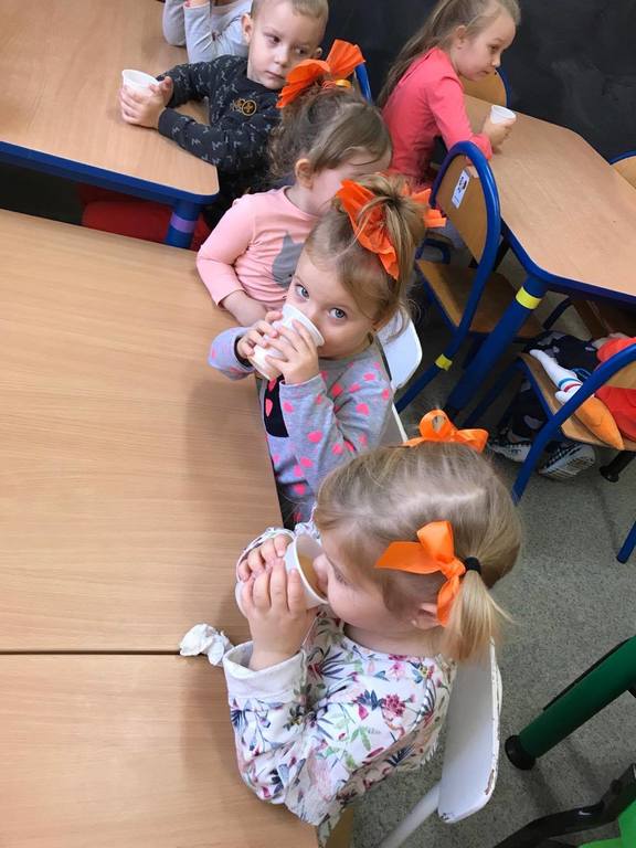 Dnia 24 listopada w naszym przedszkolu zorganizowano „Pomarańczowy dzień”. W tym dniu pojawiły się same pomarańczowe przedszkolaki i nie tylko one! Panie również dołączyły do wspólnej zabawy. Dzień był pełen niespodzianek. Dzieci uczestniczyły w zabawach ruchowych, odgadywały zagadki, śpiewały piosenki oraz tańczyły. Z wielką ochotą wypiły zdrowy sok pomarańczowo-marchwiowy, który przygotowała Pani Kucharka-dziękujemy! Przedszkolaki z niecierpliwością czekają na następny „KOLOROWY DZIEŃ” w przedszkolu.