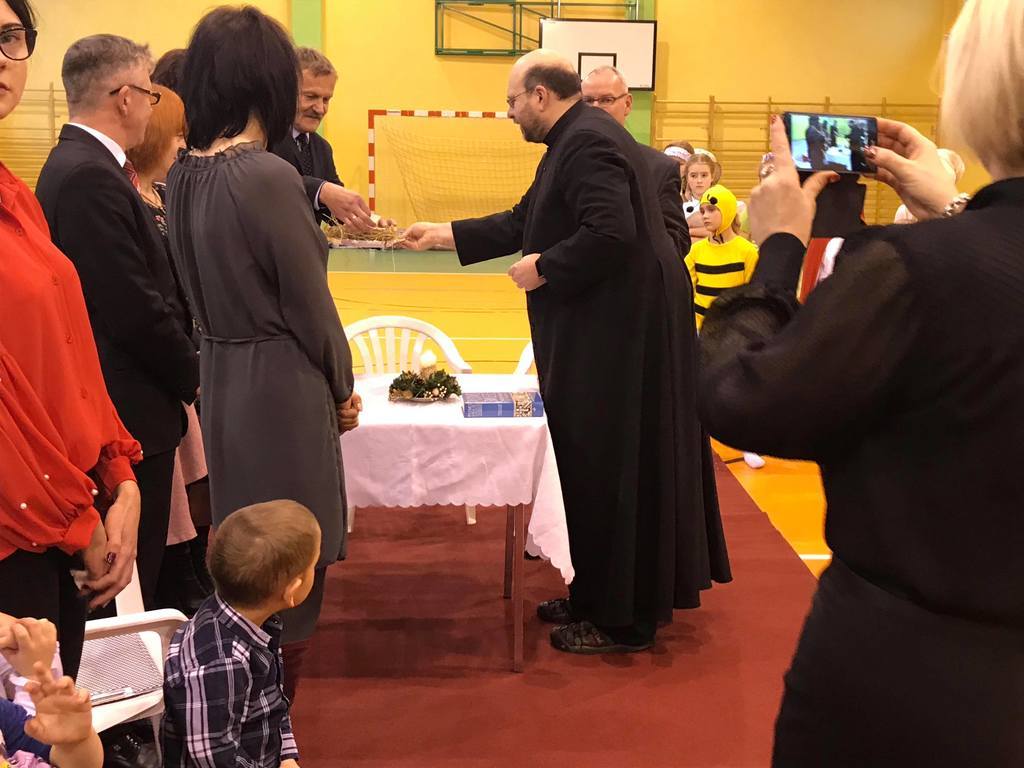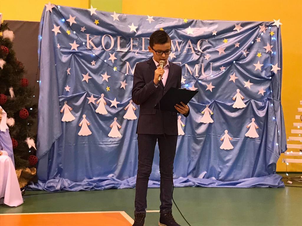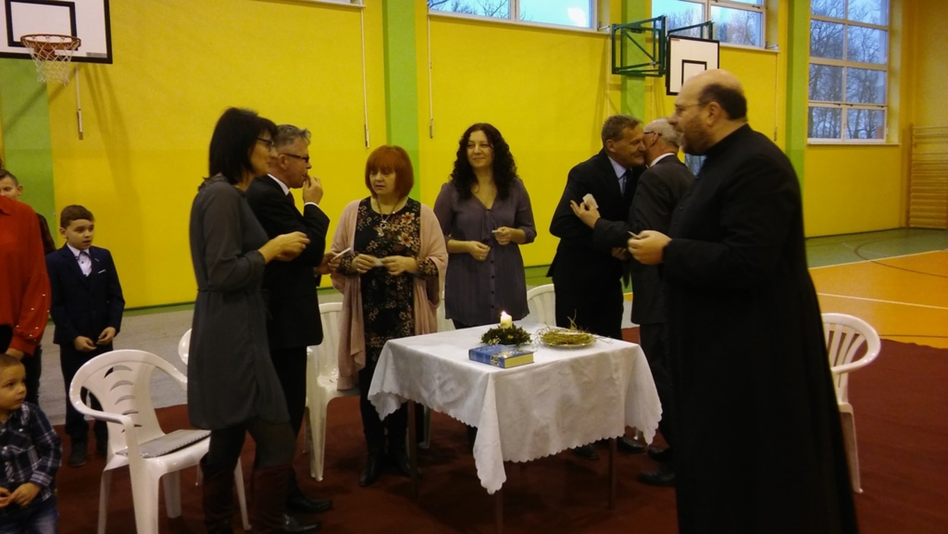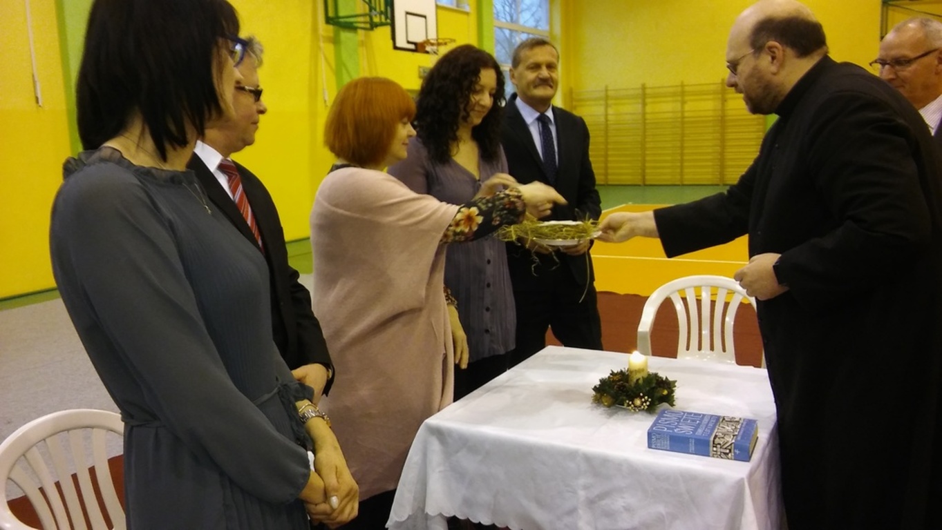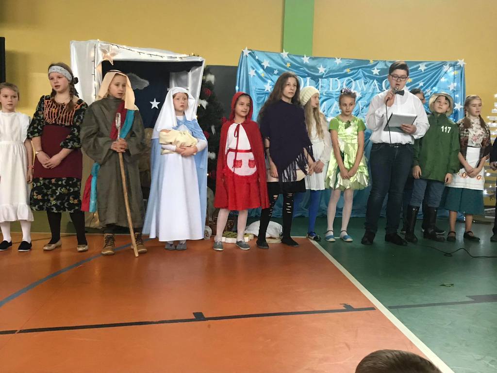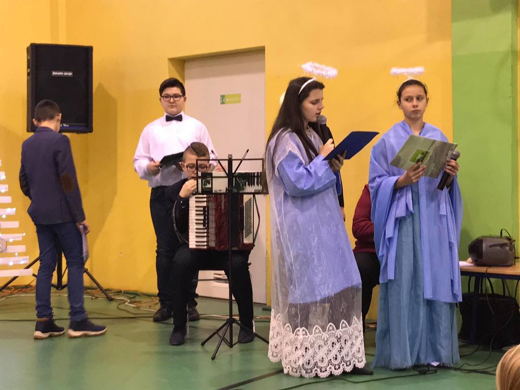 Szczególny czas oczekiwania na Boże Narodzenie, to czas, który skłania zawsze do refleksji. Nauczyciele, uczniowie jak co roku spotkali się 22 grudnia na wspólnym świątecznym apelu. O godz. 8.30 wraz z naszymi zaproszonymi gośćmi zebraliśmy się na sali gimnastycznej, aby obejrzeć część artystyczną w wykonaniu naszych uczniów. Gościliśmy w tym dniu ks. Proboszcza Macieja Krulaka, który rozpoczął naszą uroczystość przeczytaniem fragmentu z Pisma św. mówiącego o narodzeniu się Pana Jezusa. Uczniowie zaprezentowali inscenizację, przypominającą bożonarodzeniowe tradycje oraz wiersze, w których przesłaniem były: miłość, radość, pokój, zgoda i przebaczenie. Na scenie tradycyjnie nie zabrakło żłóbka, choinki, a na stole znalazł się opłatek. Na zakończenie spotkania Pani Dyrektor złożyła wszystkim obecnym i ich rodzinom z serca płynące świąteczne życzenia.
