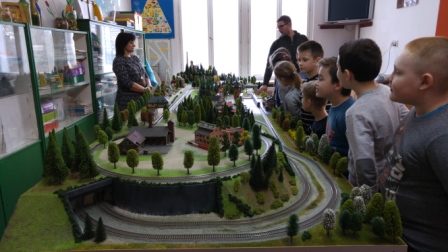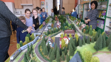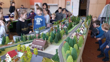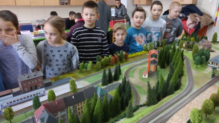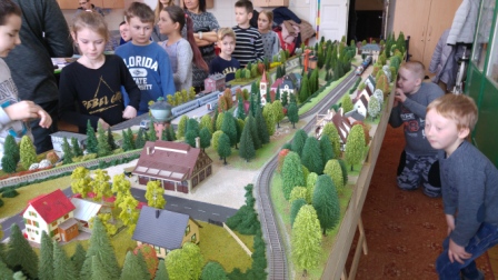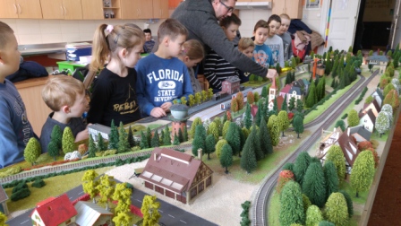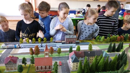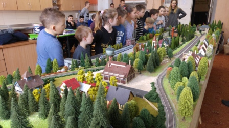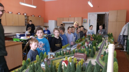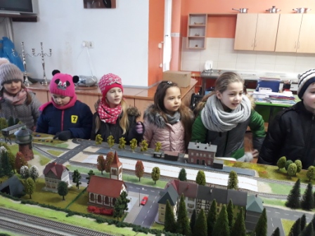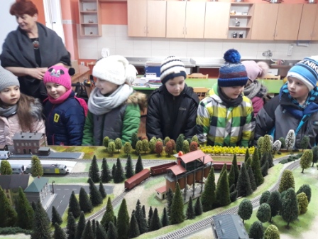 Dzieci z wielkim zainteresowaniem przyglądały się miniaturze. Pan, który uruchamiał kolejki – (pracownik SOSW )pokazał uczniom symulację zderzenia dwóch pociągów. W trakcie instruktażowego pokazu dzieci doskonale się bawiły. Podczas zabawy w kontrolera ruchu, uczniowie wciskając kolejne przyciski, wprawiali w ruch pociągi pasażerskie i towarowe.
