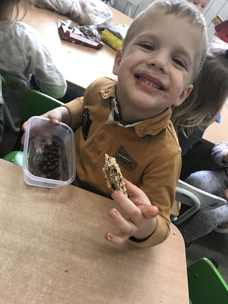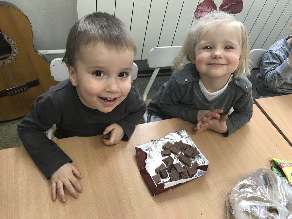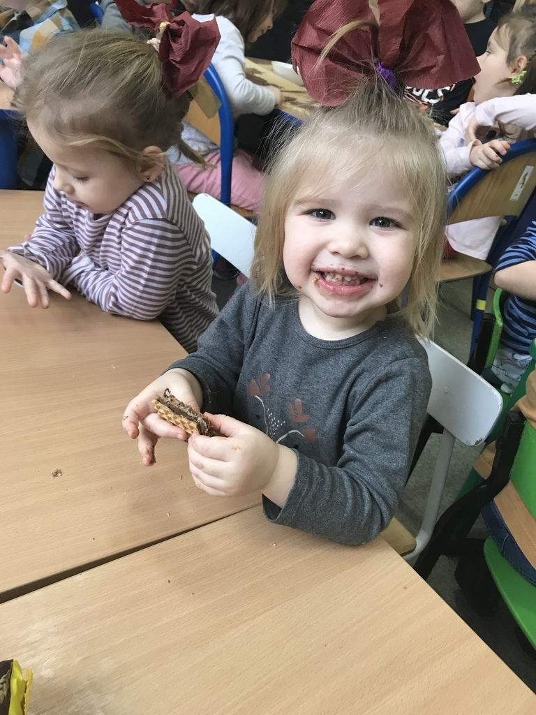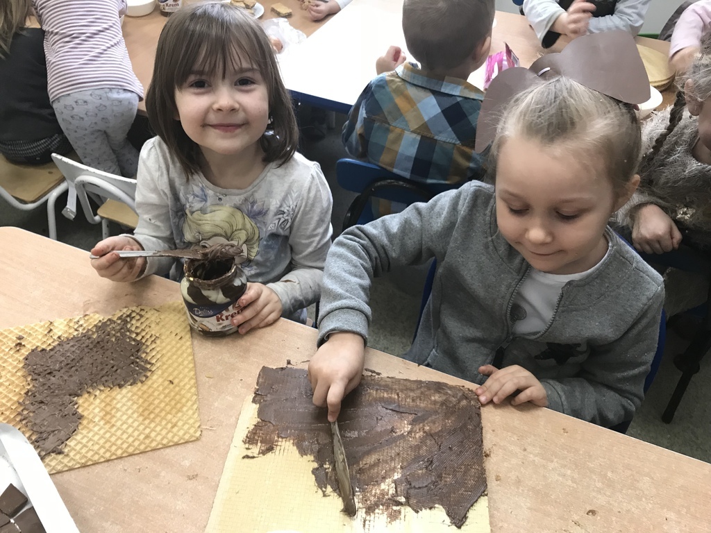 Kolejny kolorowy dzień w Przedszkolu za nami. Tym razem dominował kolor brązowy. Tego dnia Rodzice ubrali swoje pociechy w całą gamę odcieni brązu. Dzieci przyniosły swoje ulubione maskotki, oczywiście takie, które miały chociażby brązową małą łatkę, ucho czy ogonek. Po śniadaniu przedszkolaki obejrzały i spróbowały różnych produktów spożywczych: kawa, ziemniaki, kiwi, orzechy, płatki. Następnie dzieci posmarowały wafle czekoladową nutellą, którymi częstowały swoich rówieśników. Dzień brązowy minął w radosnej i słodkiej atmosferze. Już czekamy na następny kolorowy dzień w przedszkolu, a będzie nim kolor czerwony.