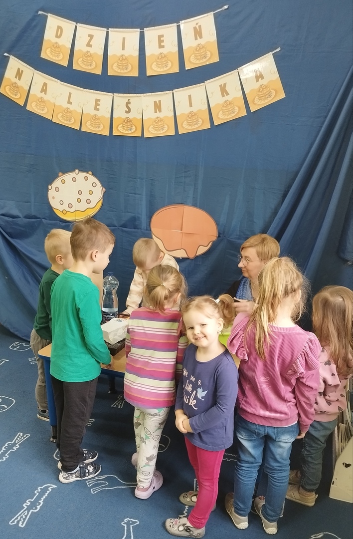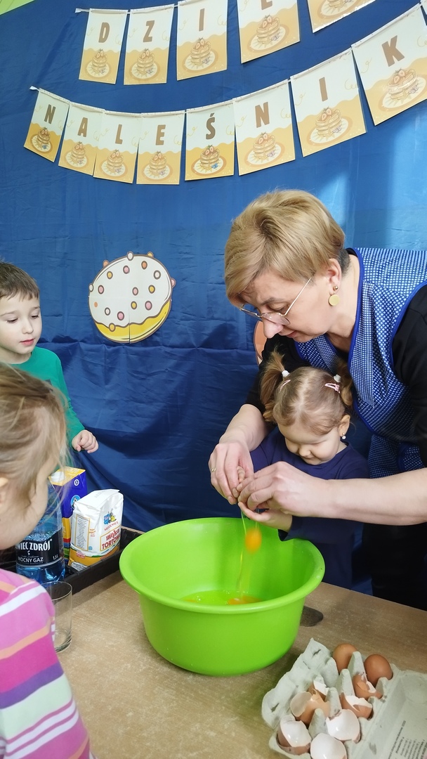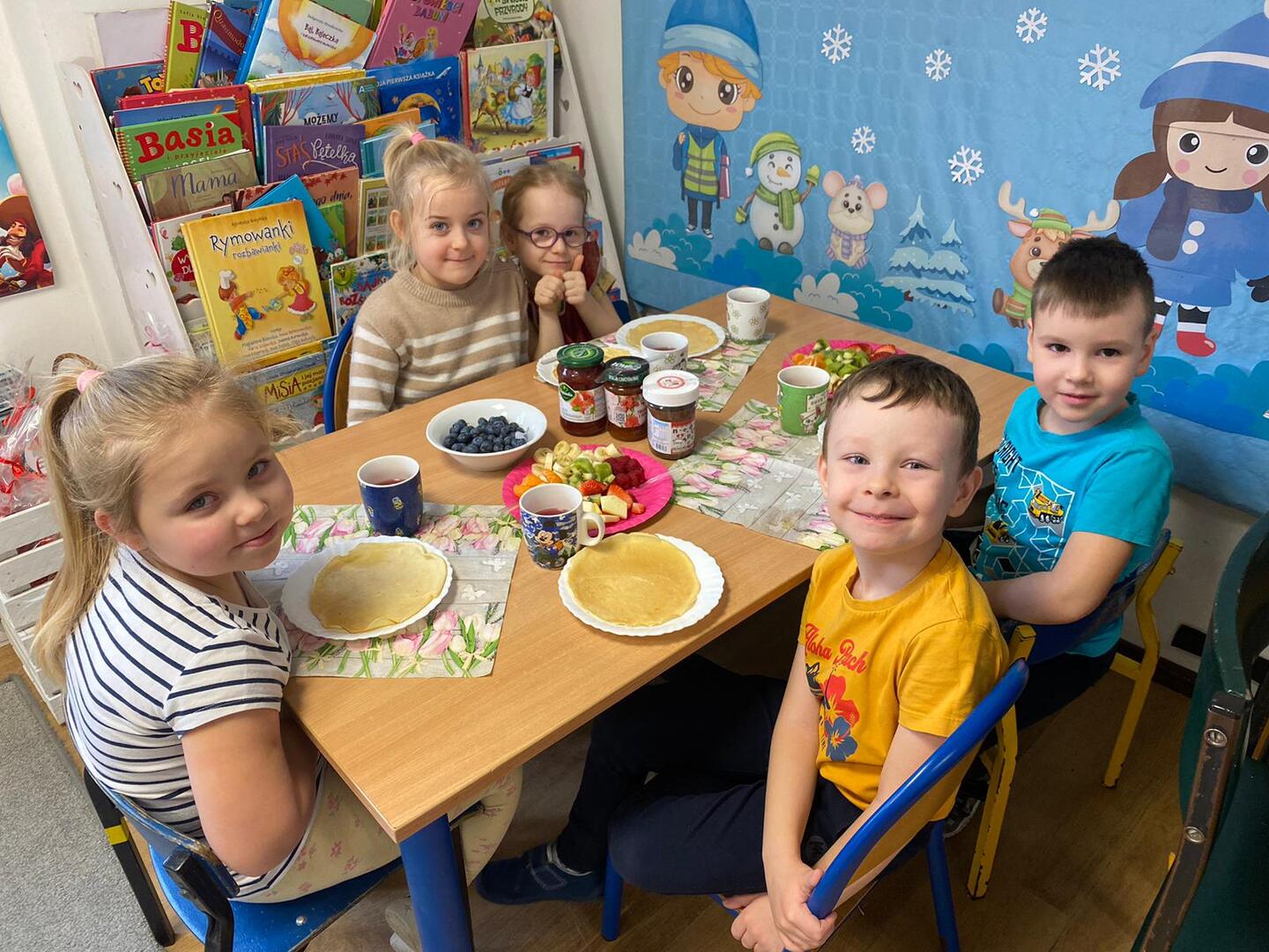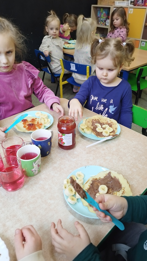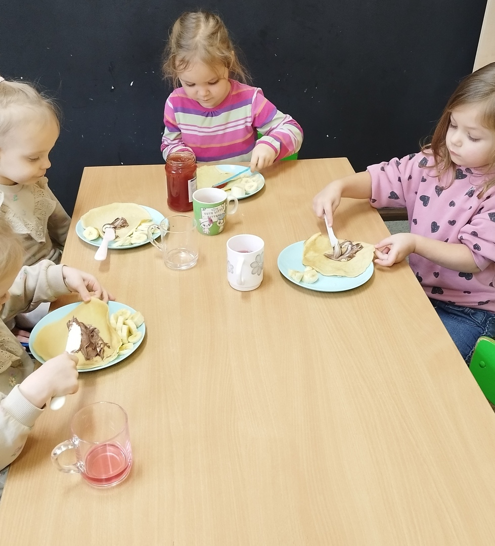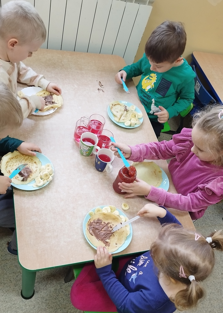 Obchodzony w tym roku 2 lutego Dzień Naleśnika był doskonałą okazją do zorganizowania w naszym przedszkolu zajęć i zabaw z jego wykorzystaniem. Tego dnia nie mogło zabraknąć także akcentów kulinarnych. Dzieci poznały przepis na to danie oraz doskonaliły umiejetność matematyczne. Dzieci miały również okazję wykazać się własną inwencją podczas przygotowywania deseru w postaci naleśników z ulubionymi dodatkami. Zdecydowanie najprzyjemniejszym i najbardziej wyczekiwanym momentem całego dnia była degustacja samodzielnie skomponowanego deseru.