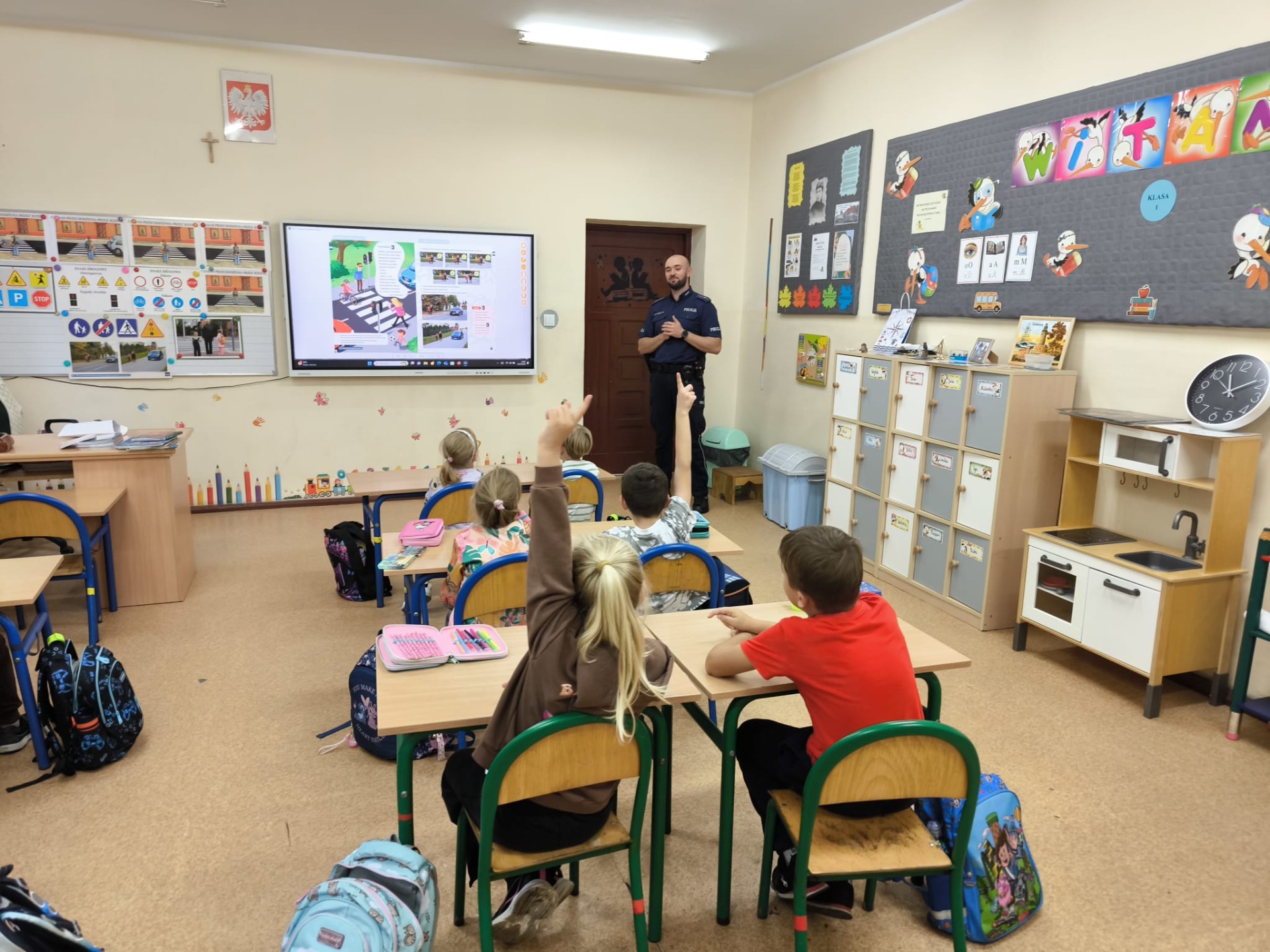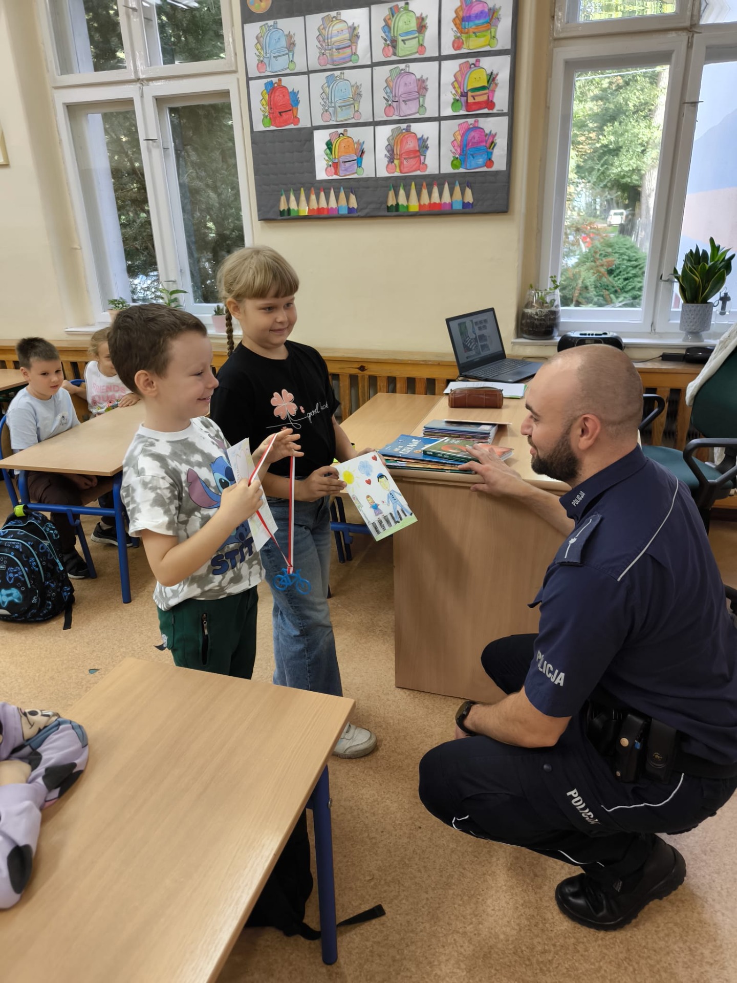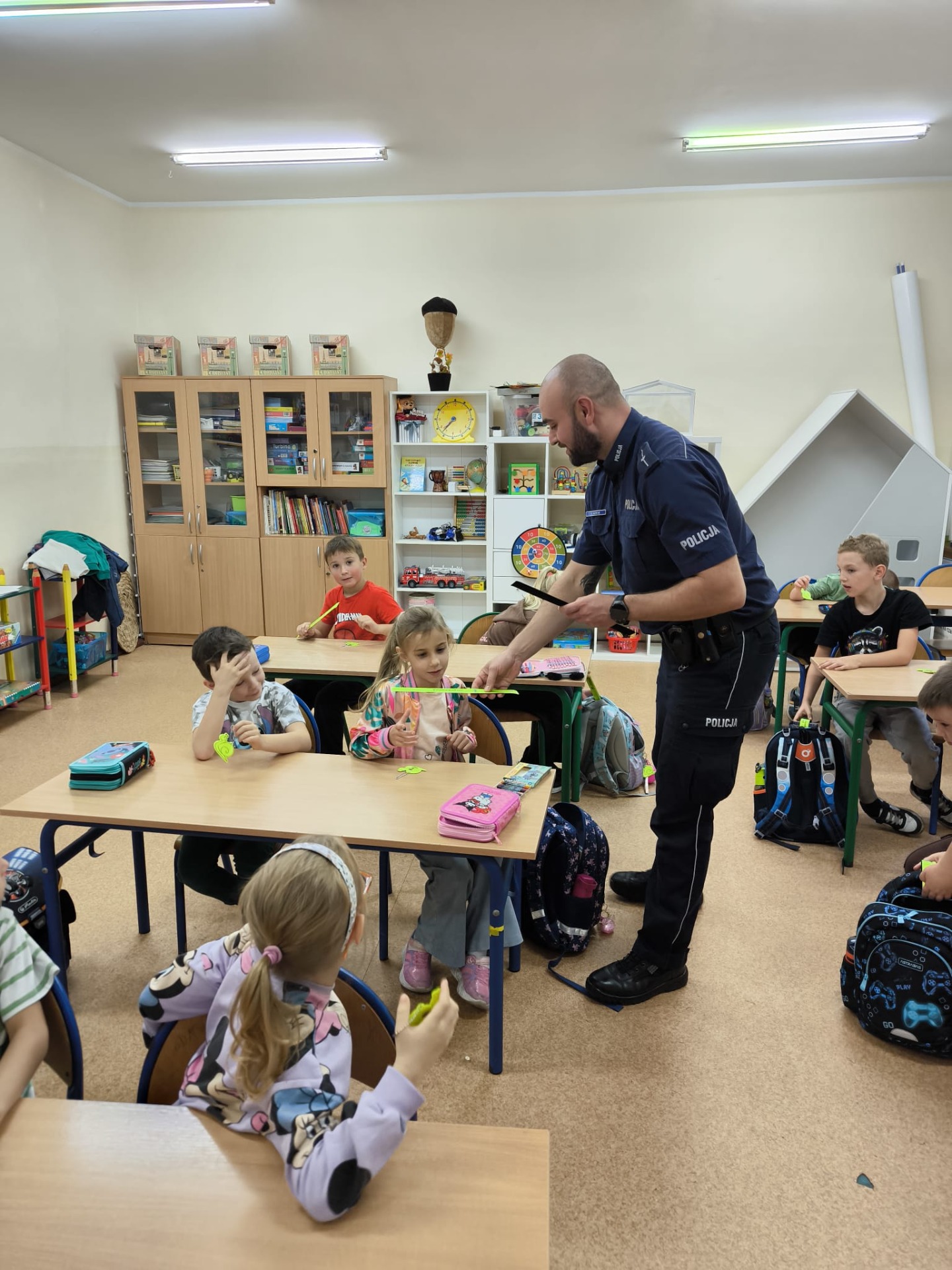 Dziś w naszej klasie gościliśmy wyjątkowego gościa – policjanta, na którego dzieci czekały już od rana z ogromną niecierpliwością. 😊Pan policjant przypomniał nam, jak prawidłowo przechodzić przez jezdnię, na co zwracać uwagę przy znakach drogowych oraz jak zachować się w sytuacjach niebezpiecznych na drodze. 🚸 Na koniec każde dziecko otrzymało odblask ✨, a w podziękowaniu wręczyliśmy naszemu gościowi kolorowe laurki ❤🎨.