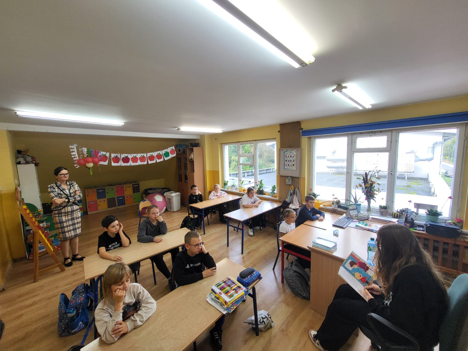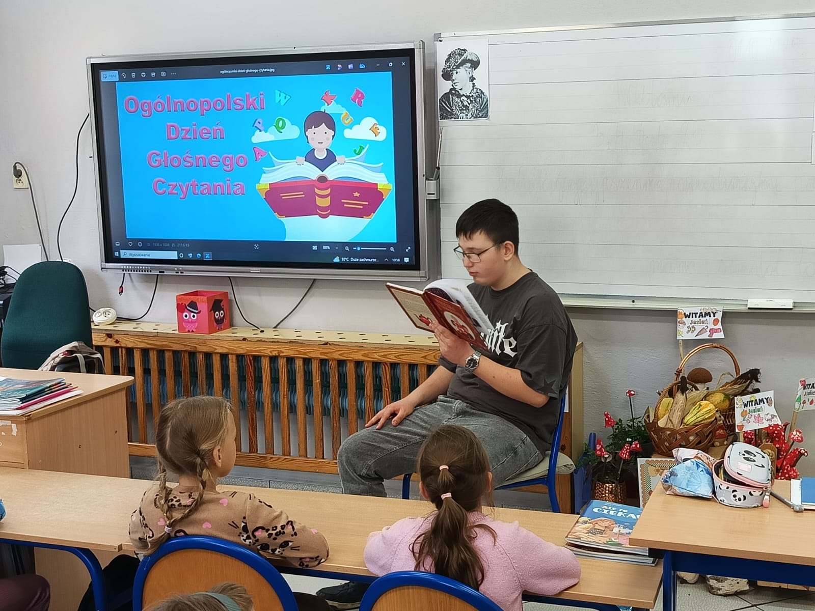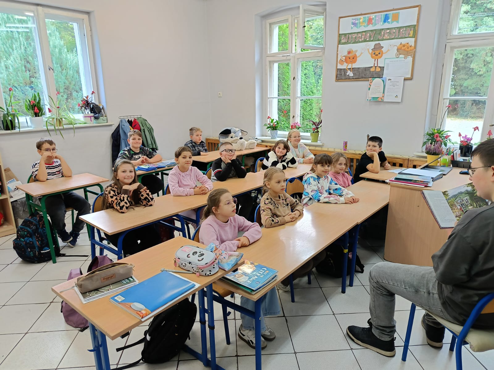 Dnia 01.10 w szkole oraz w przedszkolu została przeprowadzona akcja czytelnicza "Starszy czyta młodszym" . Chętni uczniowie z klasy VII ( Borys, Paweł, Helena, Marika, Damian, Jasiu, Szymon), oraz Basia z klasy VIII i p. Milena z dużym zaangażowaniem przeczytali dedykowane dla dzieci ciekawe historie, promując tym samym, głośne czytanie i korzystanie z bogatych zasobów szkolnej biblioteki. Słuchacze byli szczerze zainteresowani i z uwagą wysłuchali czytanych opowieści.