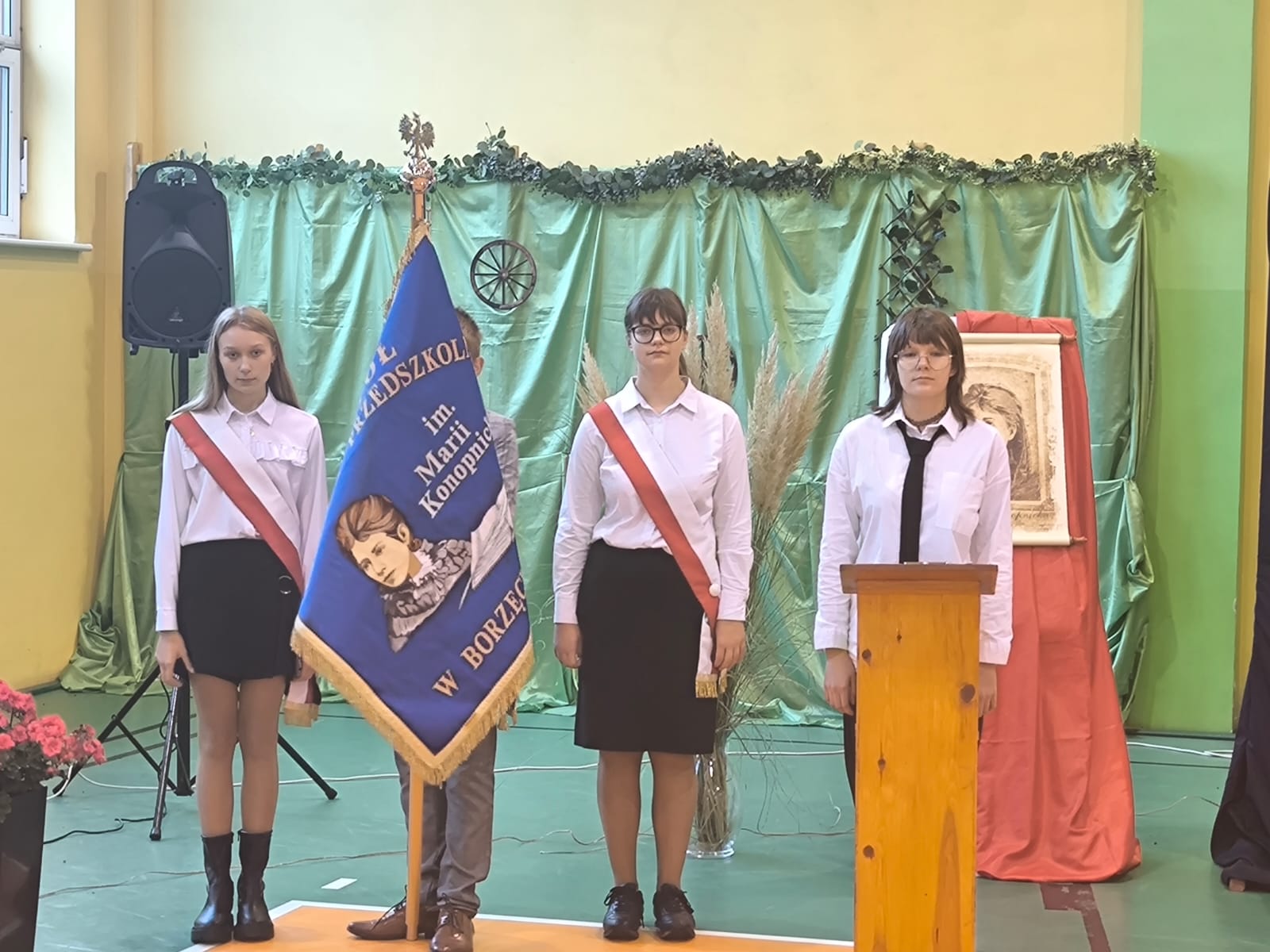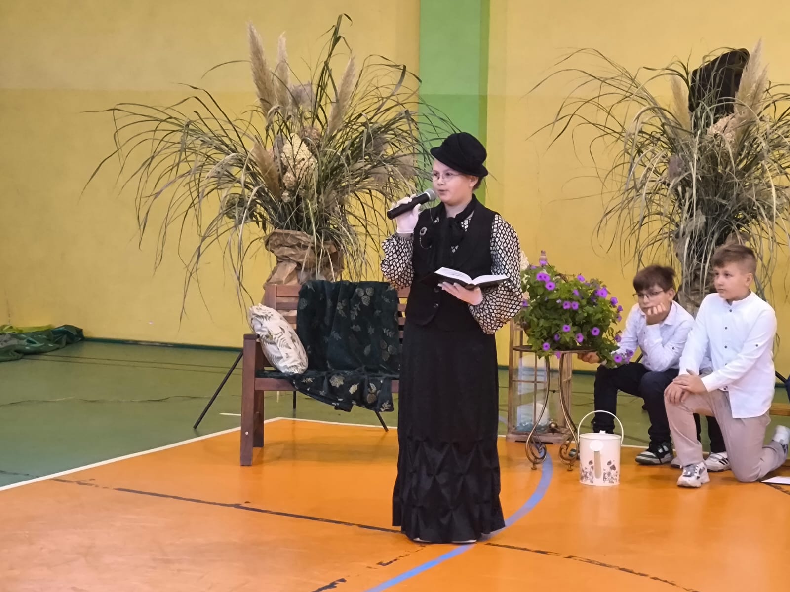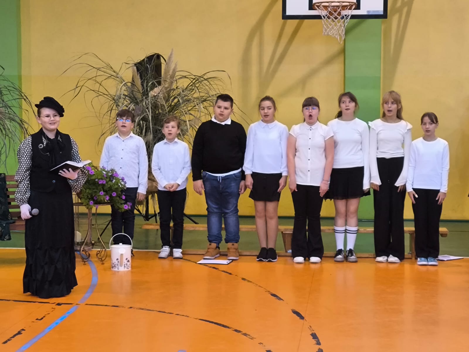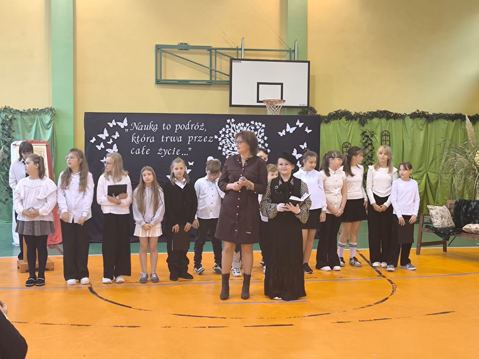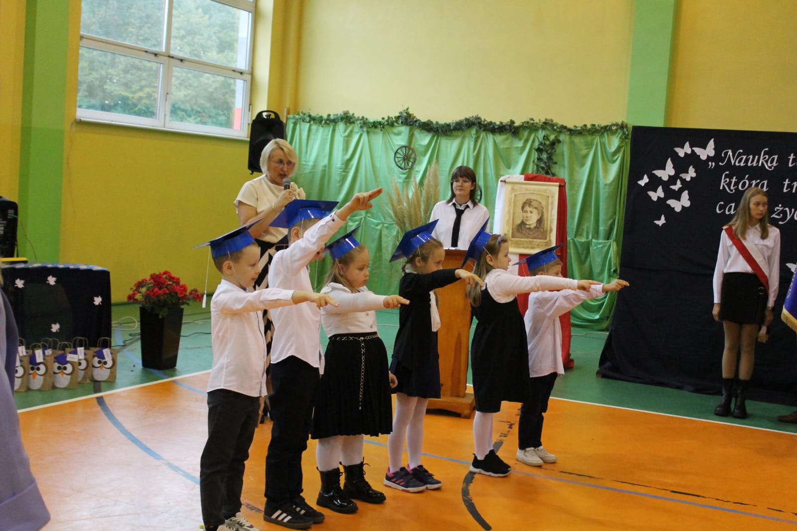 Nie zabrakło również części artystycznej. Uczniowie przygotowali inscenizację dialogową, podczas której spotkali się z patronką szkoły, Marią Konopnicką. Poetka, w tej niezwykłej rozmowie, skierowała do uczniów i nauczycieli pełne ciepła słowa o wartościach, które są najważniejsze: o nauce, pracy, szacunku i miłości do ojczyzny.