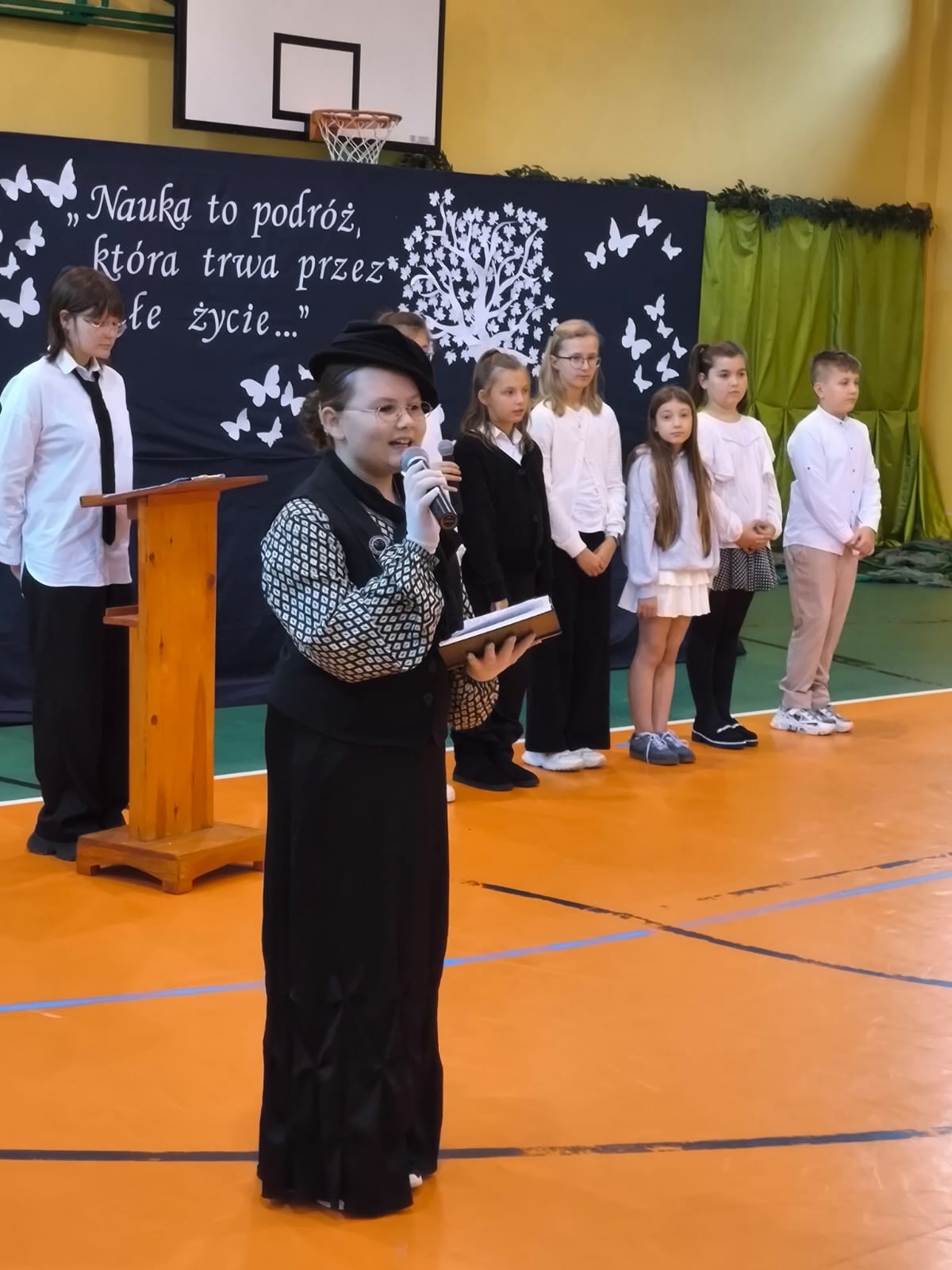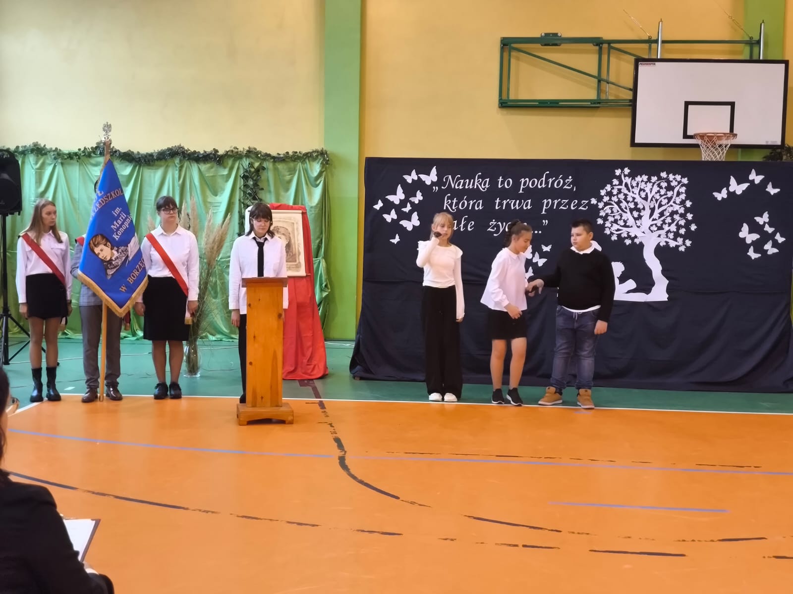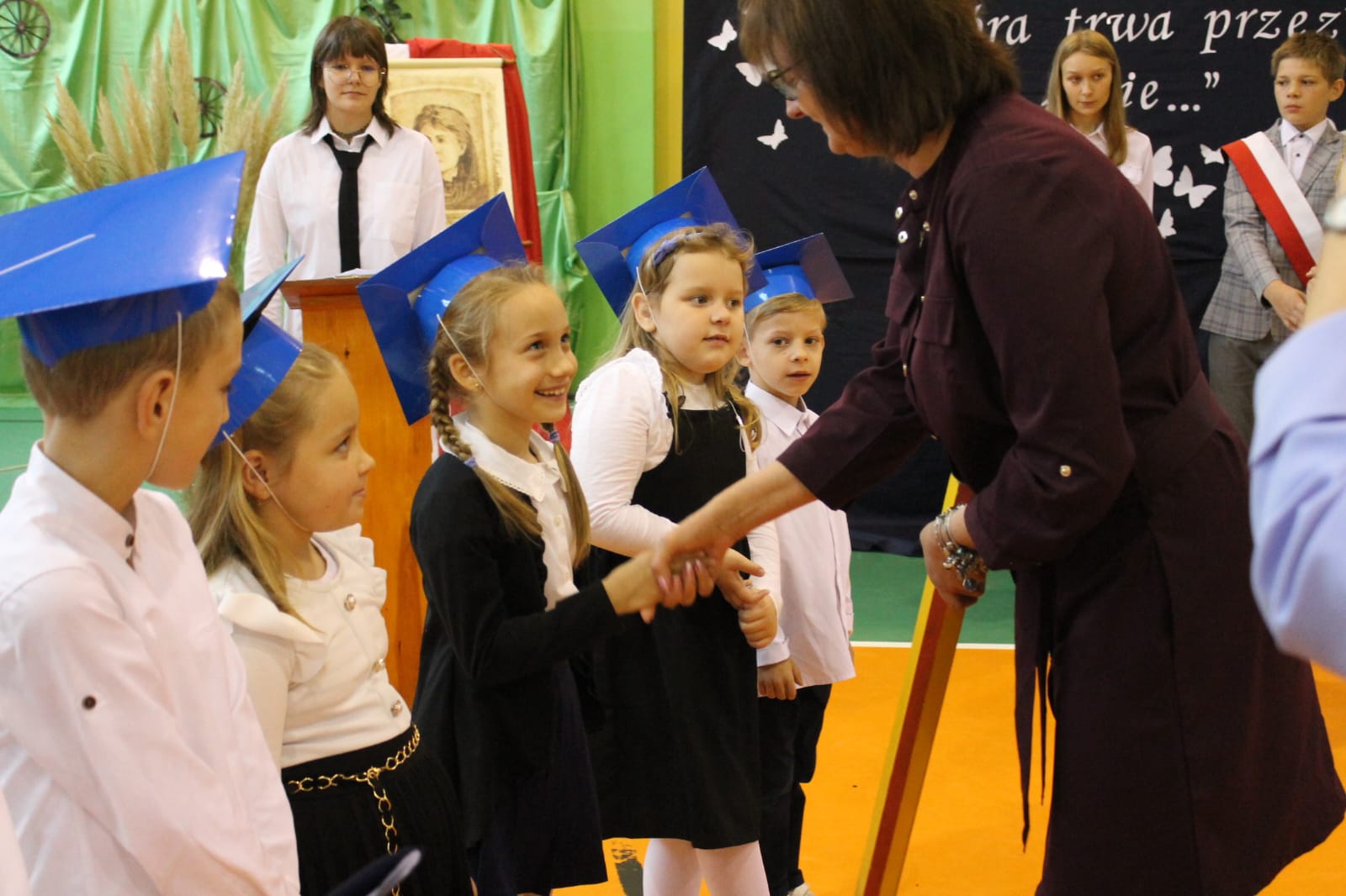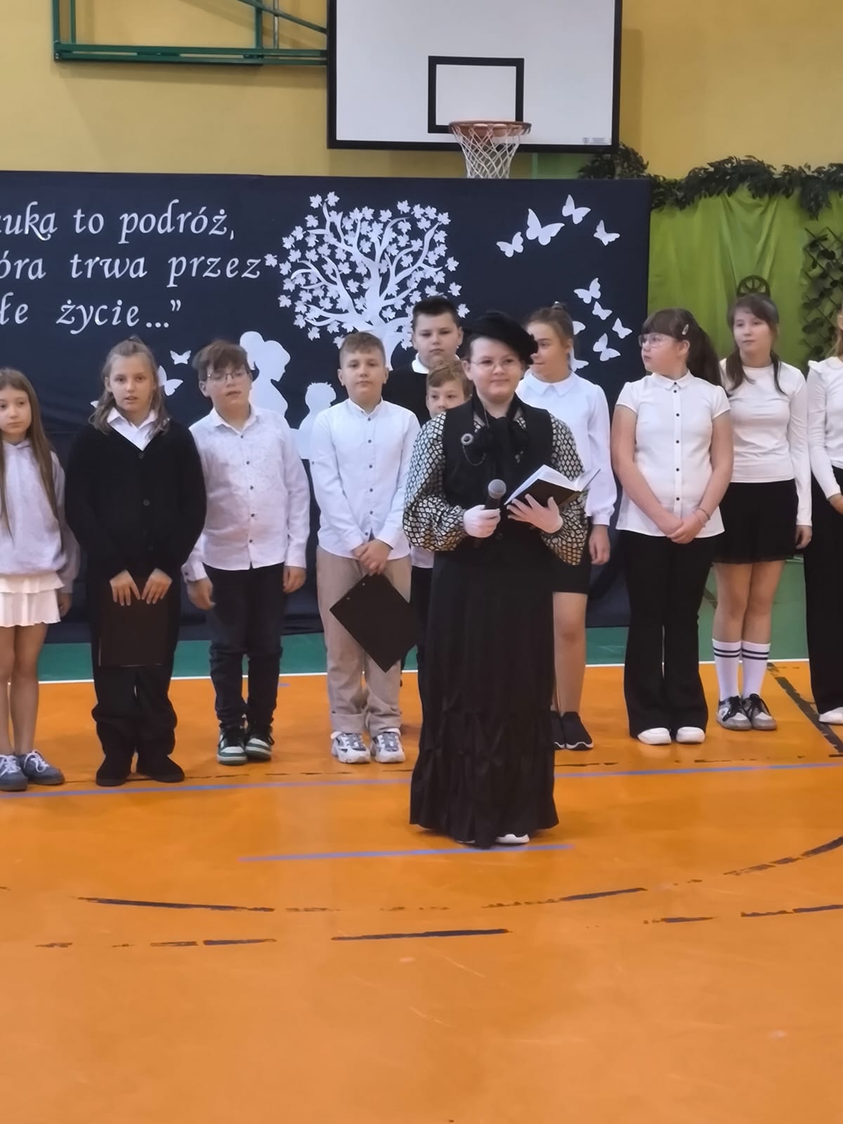 Nie zabrakło również części artystycznej. Uczniowie przygotowali inscenizację dialogową, podczas której spotkali się z patronką szkoły, Marią Konopnicką. Poetka, w tej niezwykłej rozmowie, skierowała do uczniów i nauczycieli pełne ciepła słowa o wartościach, które są najważniejsze: o nauce, pracy, szacunku i miłości do ojczyzny.