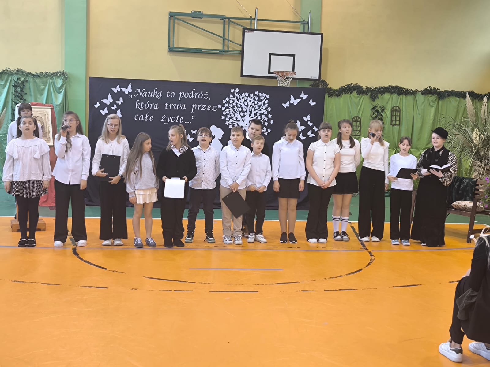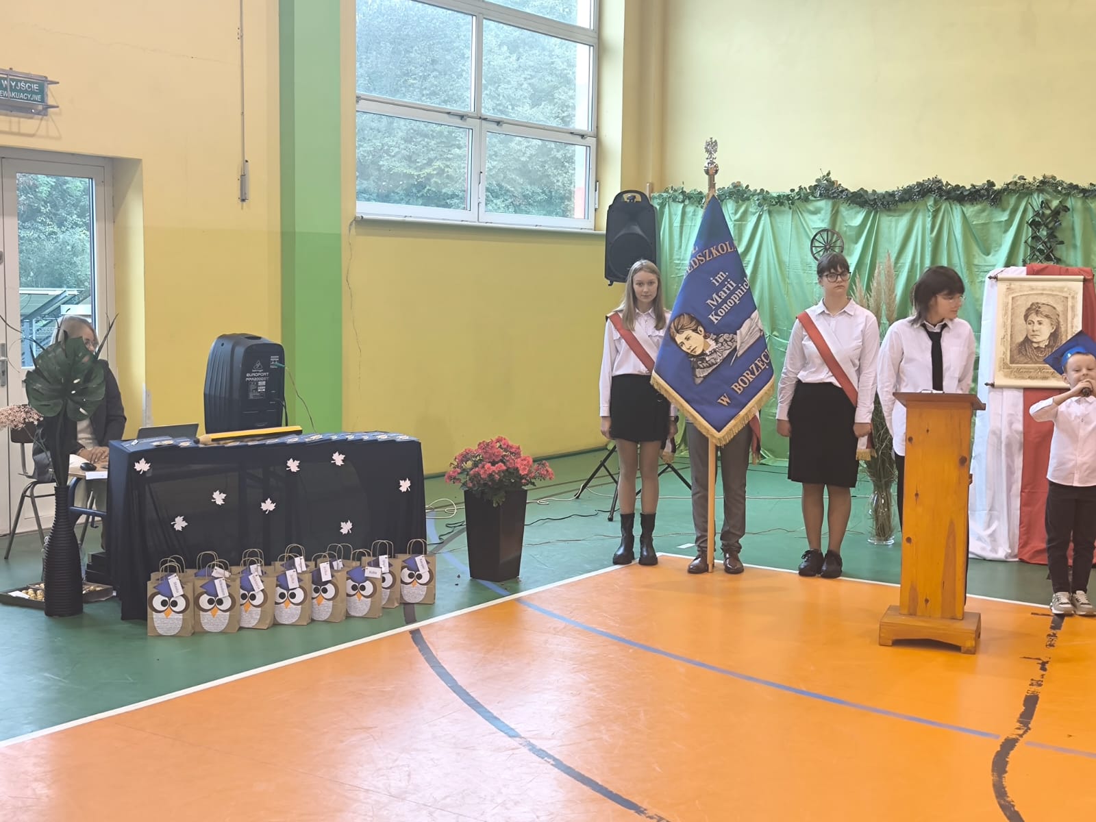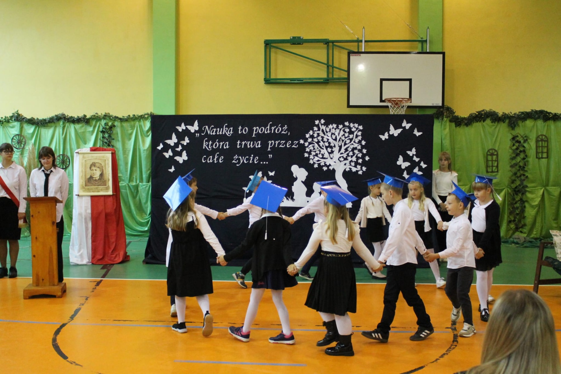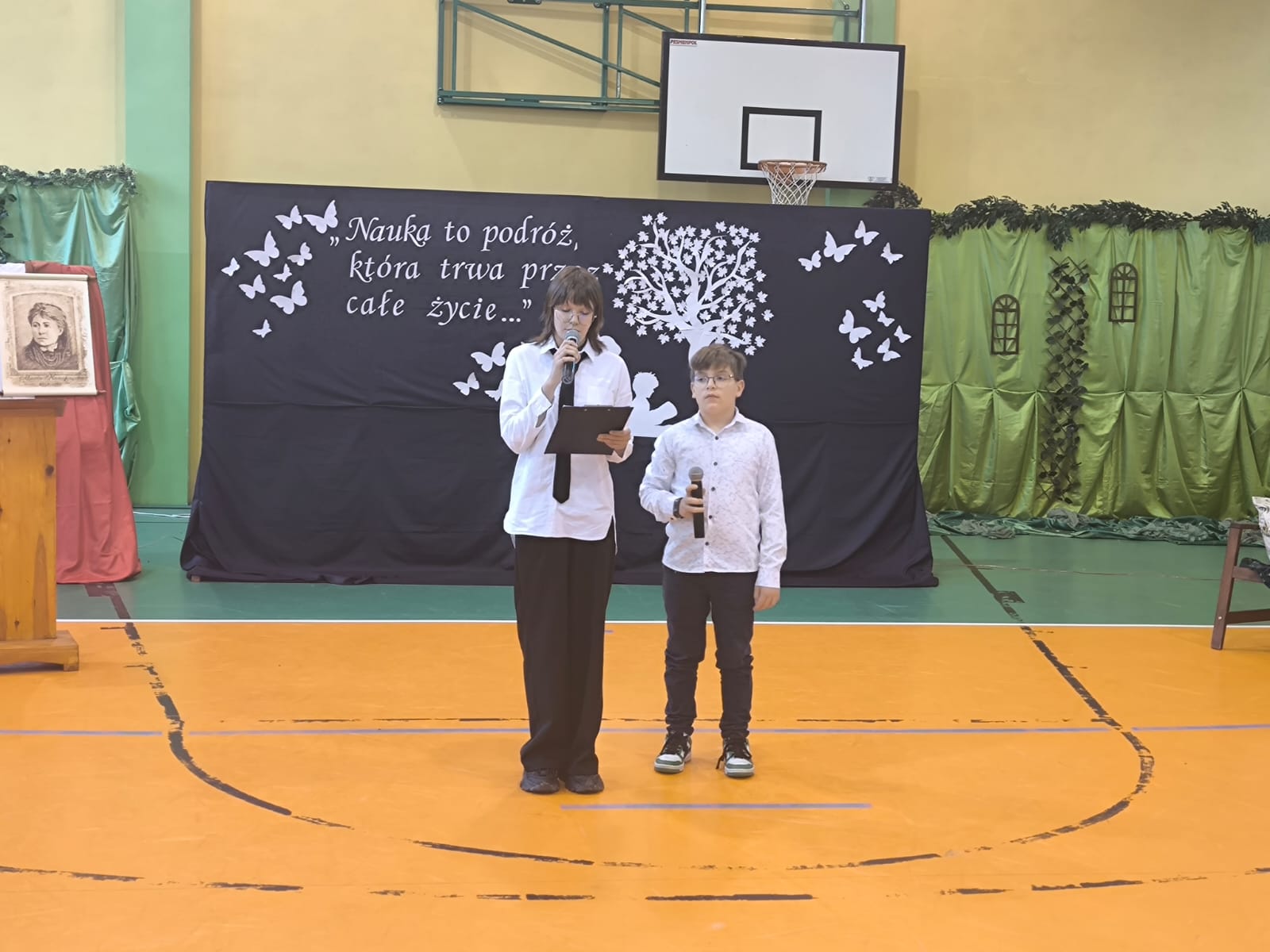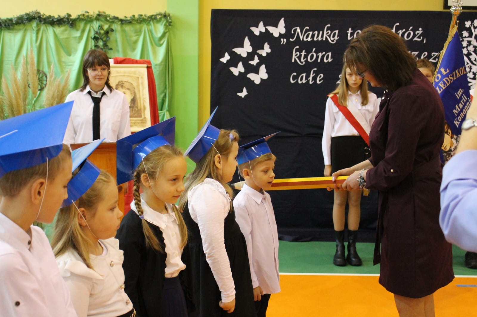 Nie zabrakło również części artystycznej. Uczniowie przygotowali inscenizację dialogową, podczas której spotkali się z patronką szkoły, Marią Konopnicką. Poetka, w tej niezwykłej rozmowie, skierowała do uczniów i nauczycieli pełne ciepła słowa o wartościach, które są najważniejsze: o nauce, pracy, szacunku i miłości do ojczyzny.