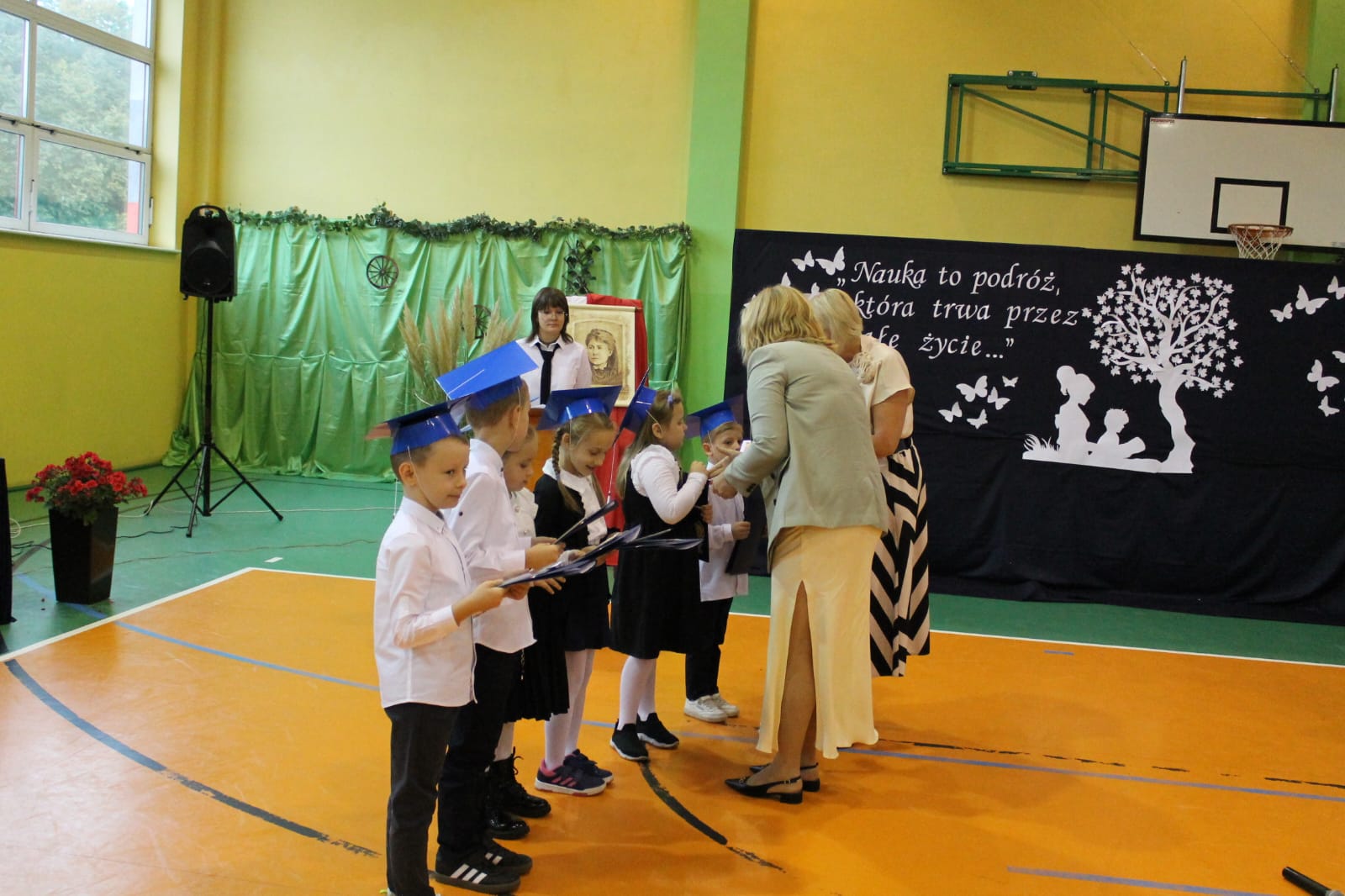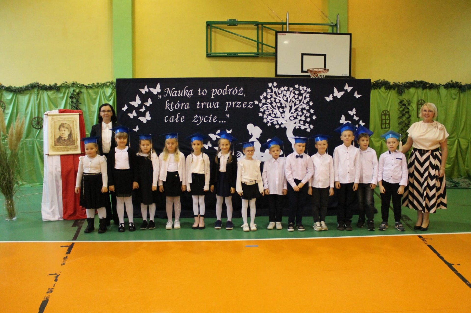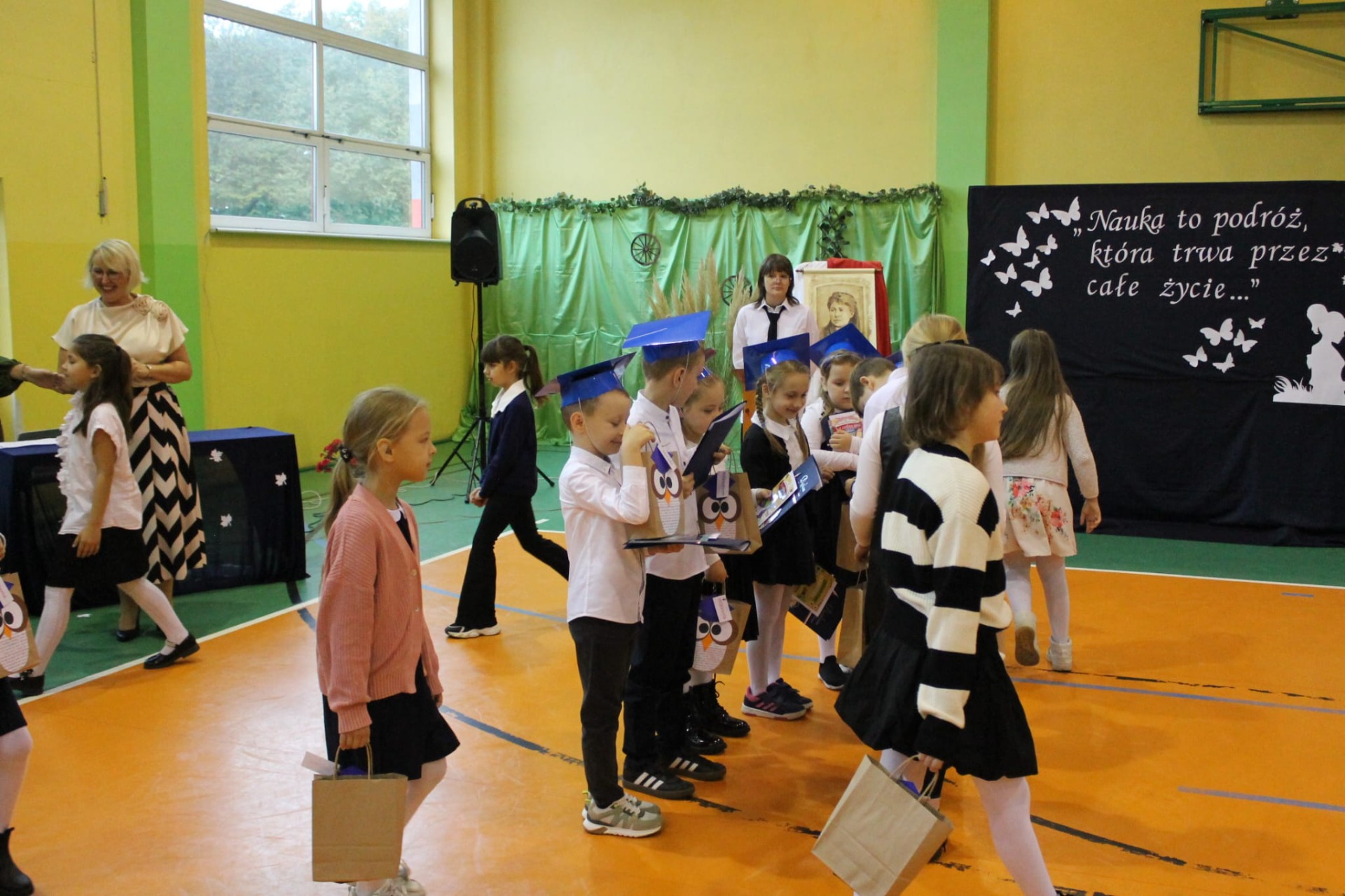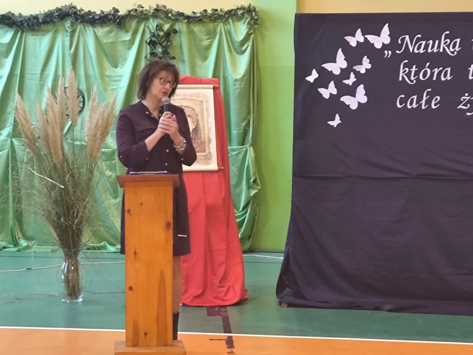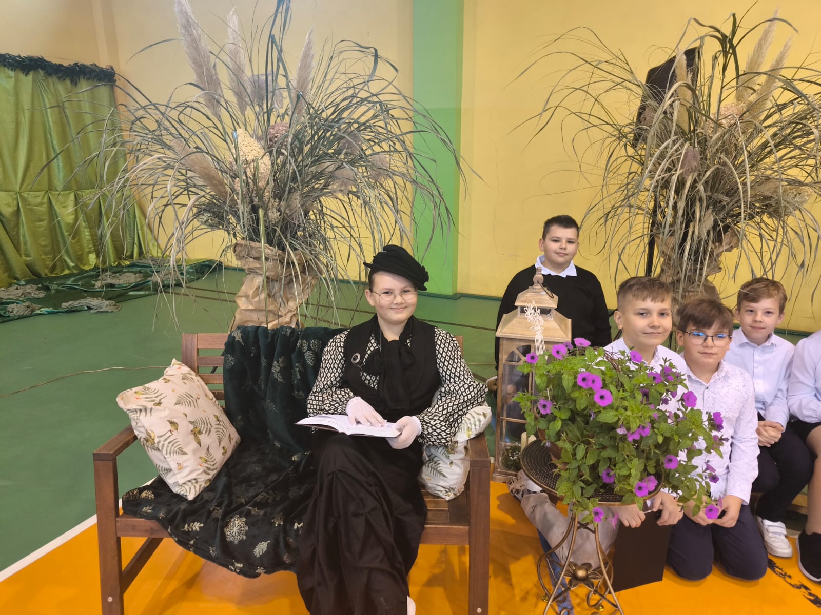 Nie zabrakło również części artystycznej. Uczniowie przygotowali inscenizację dialogową, podczas której spotkali się z patronką szkoły, Marią Konopnicką. Poetka, w tej niezwykłej rozmowie, skierowała do uczniów i nauczycieli pełne ciepła słowa o wartościach, które są najważniejsze: o nauce, pracy, szacunku i miłości do ojczyzny.