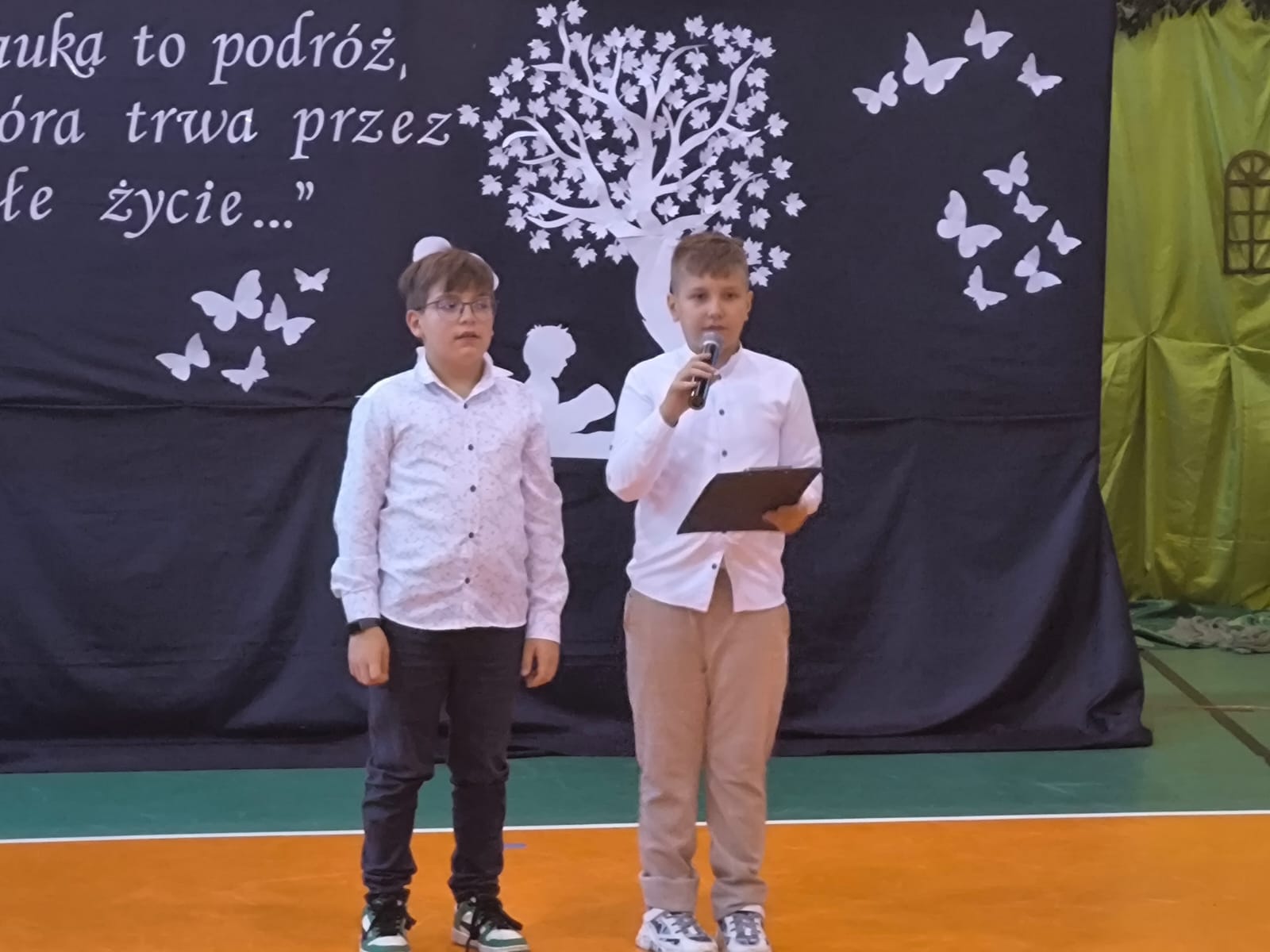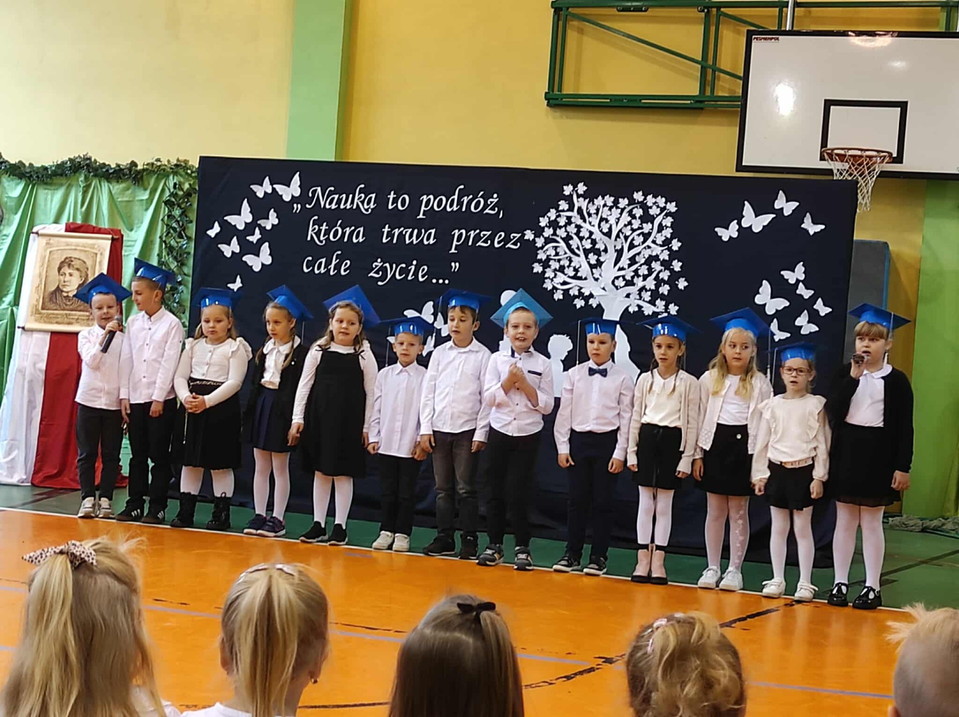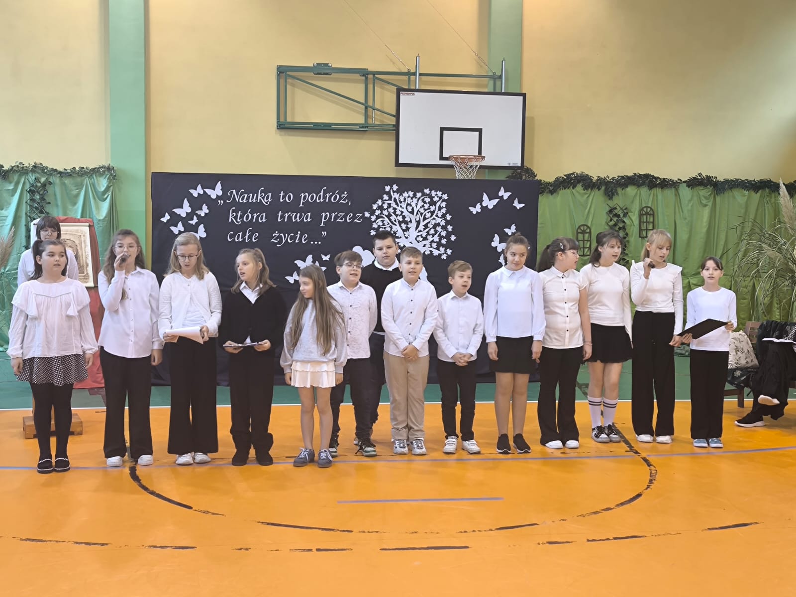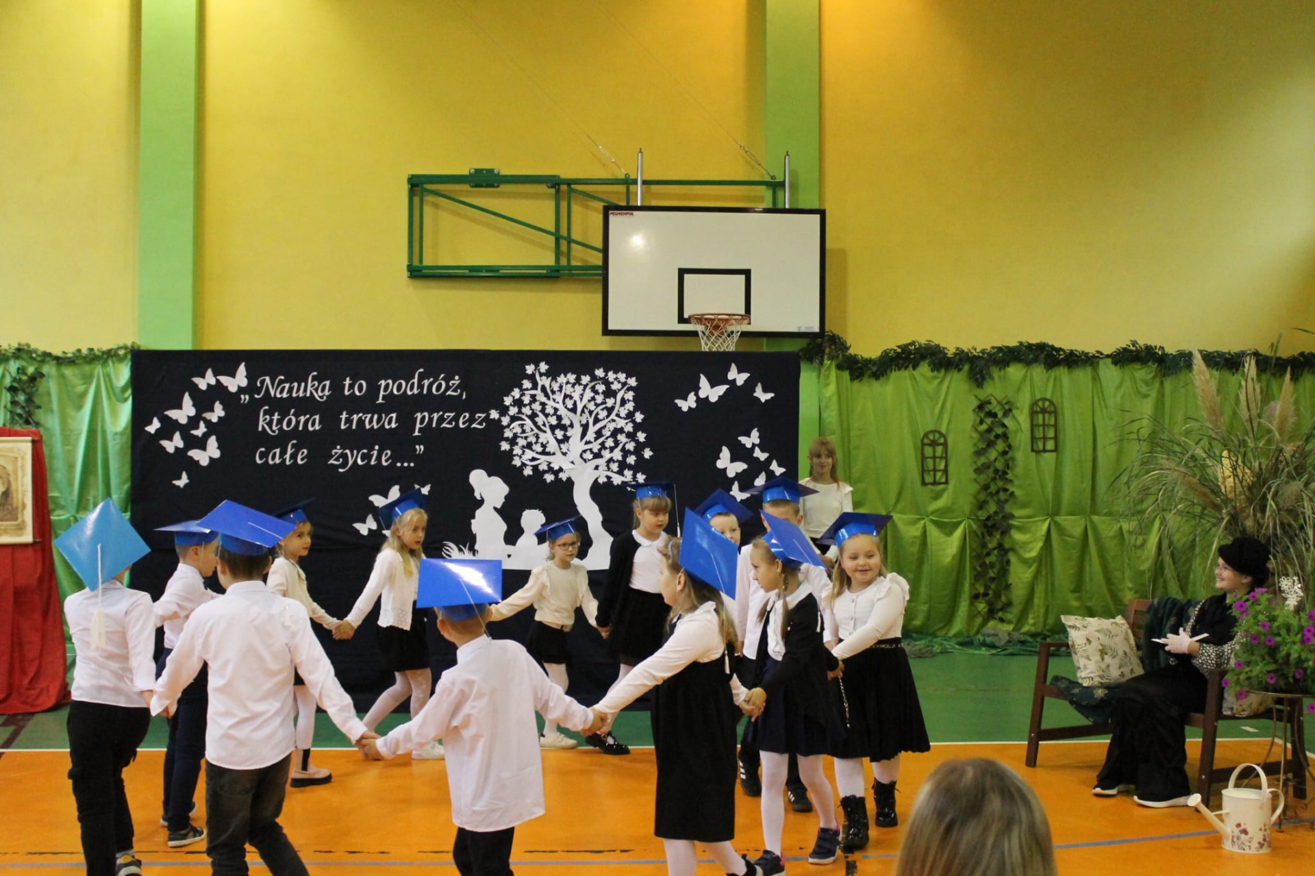 Nie zabrakło również części artystycznej. Uczniowie przygotowali inscenizację dialogową, podczas której spotkali się z patronką szkoły, Marią Konopnicką. Poetka, w tej niezwykłej rozmowie, skierowała do uczniów i nauczycieli pełne ciepła słowa o wartościach, które są najważniejsze: o nauce, pracy, szacunku i miłości do ojczyzny.