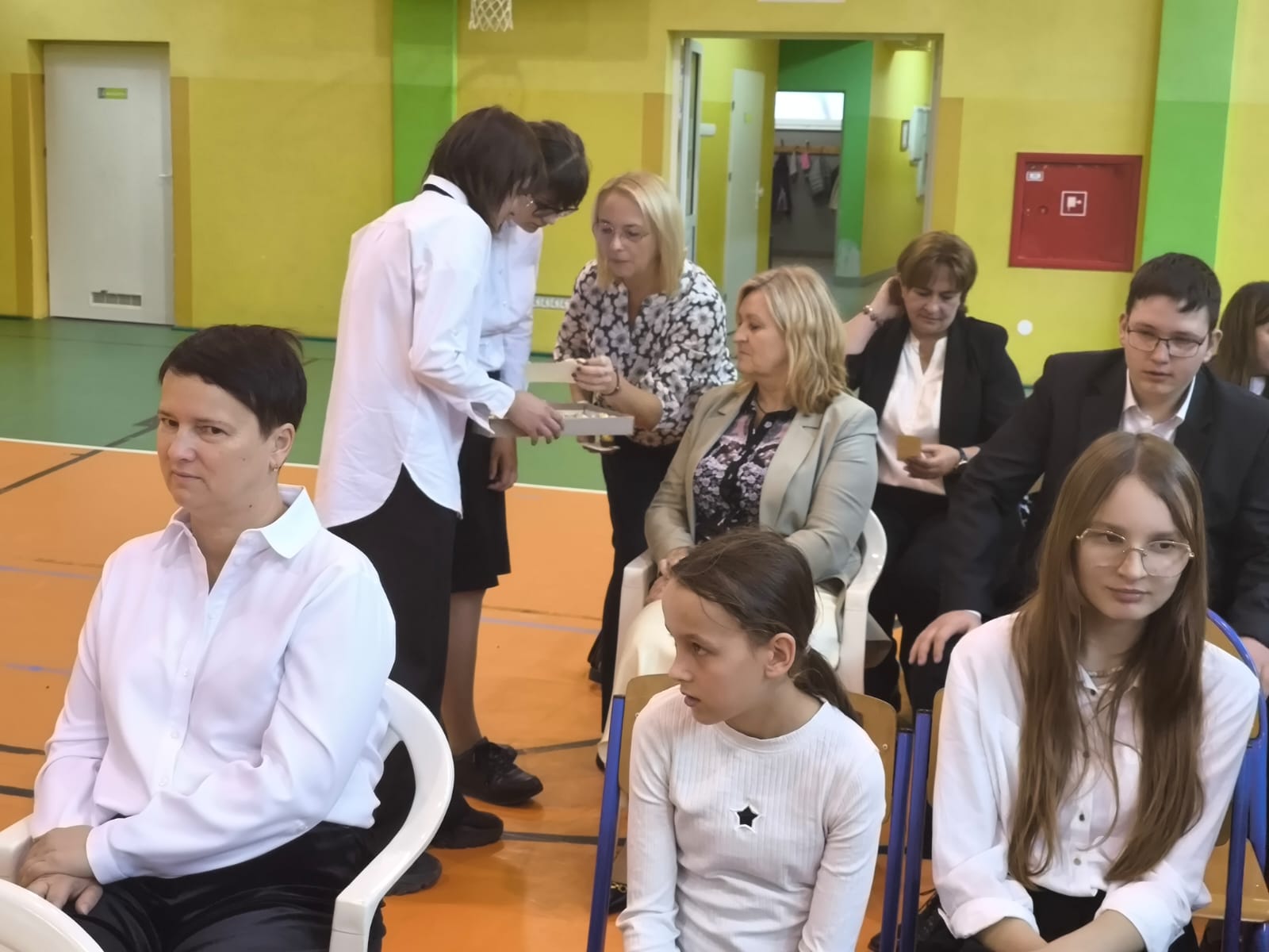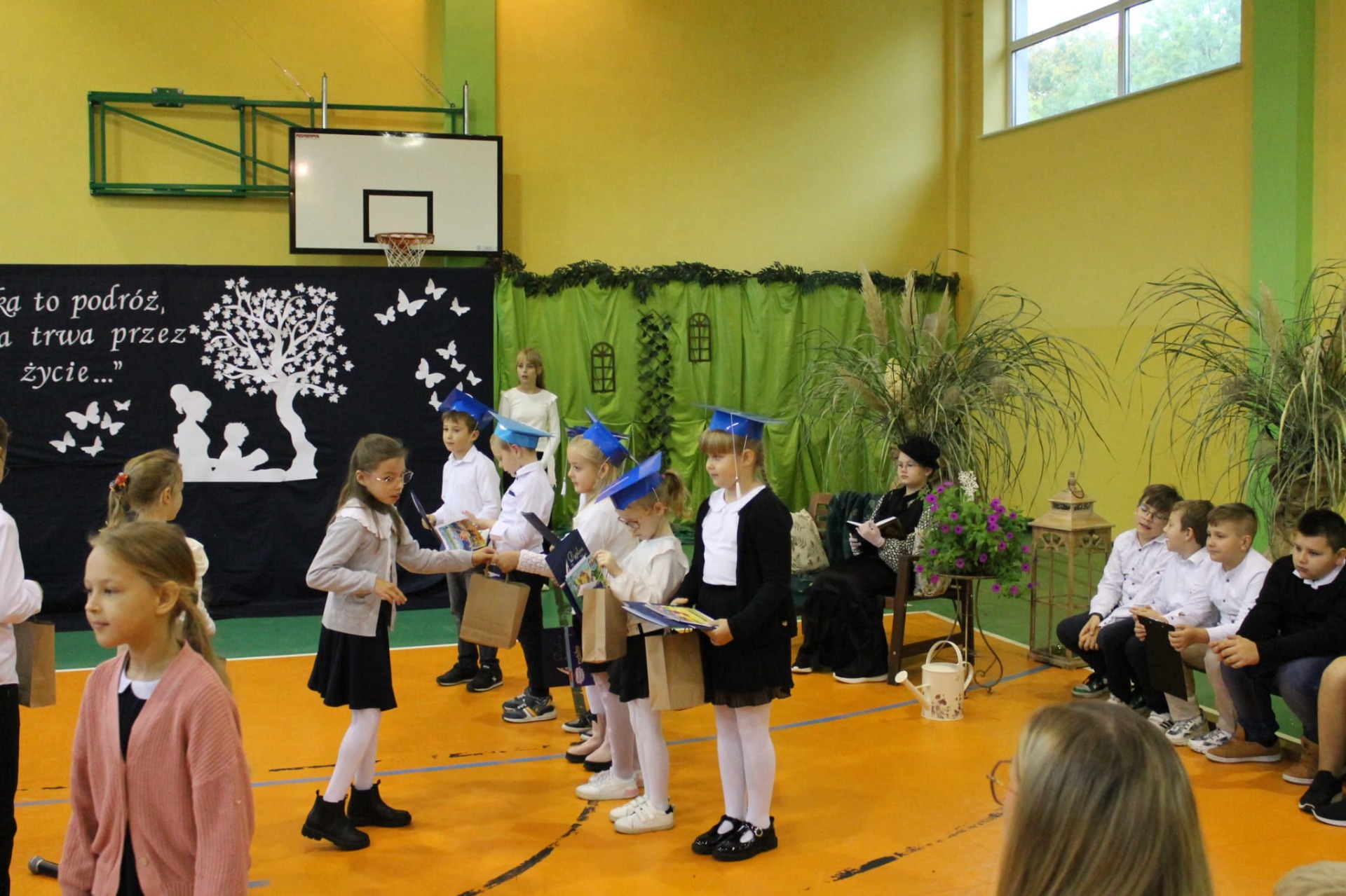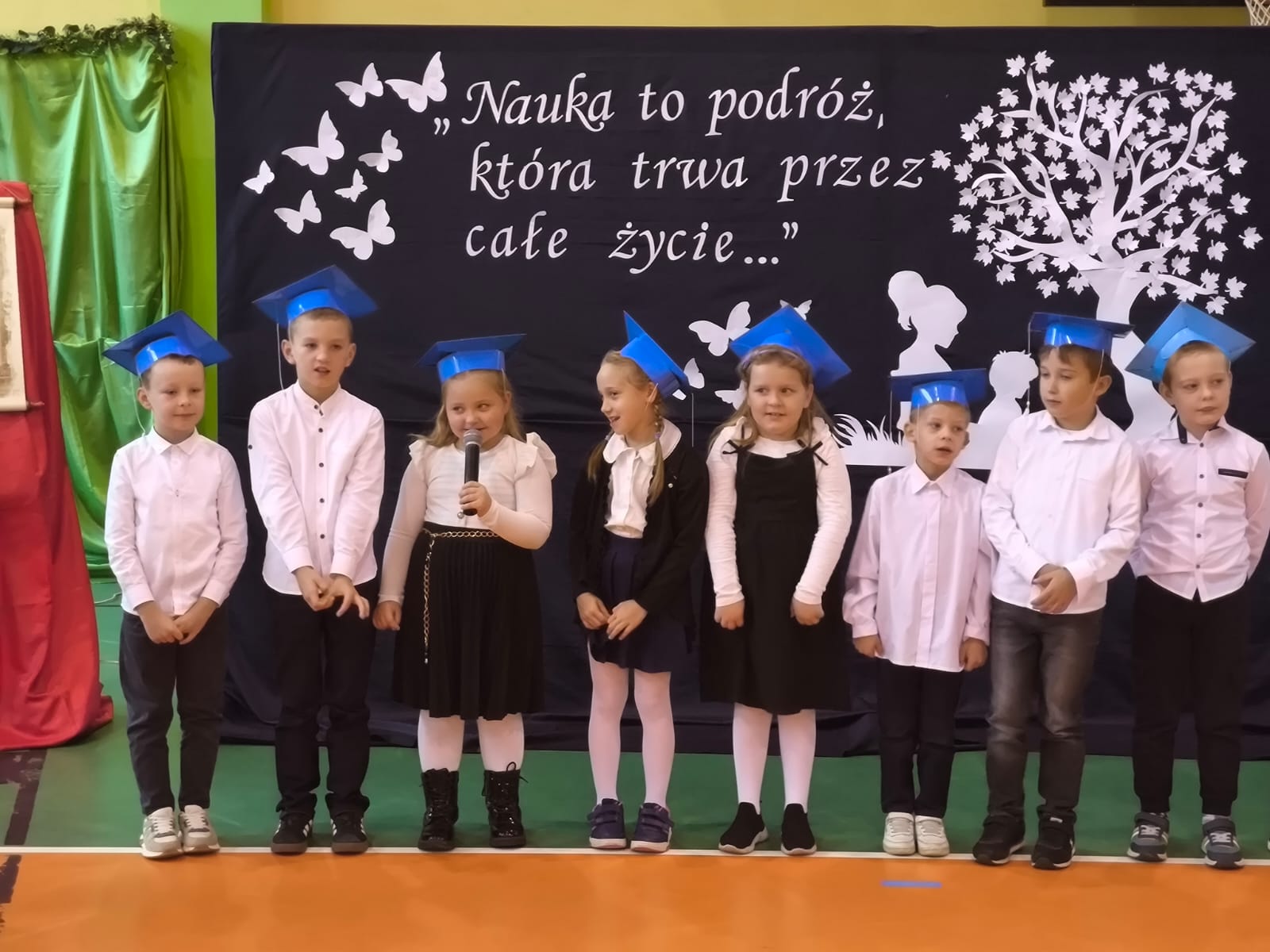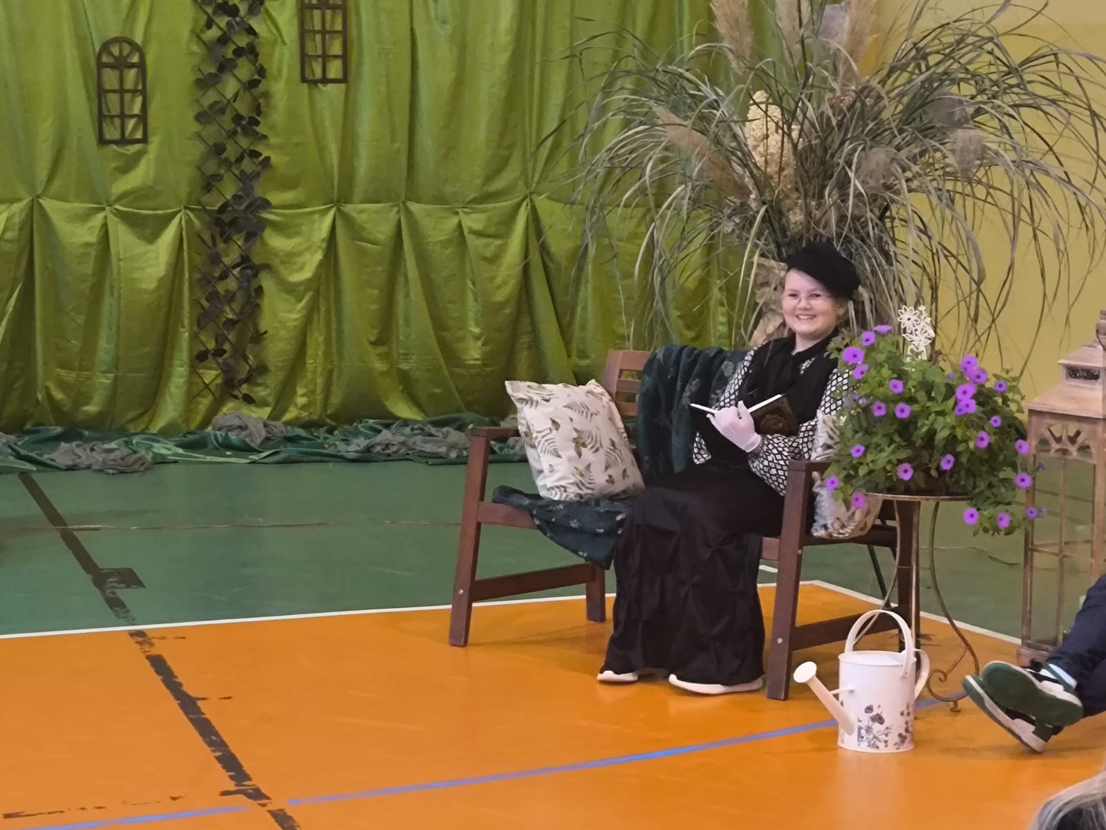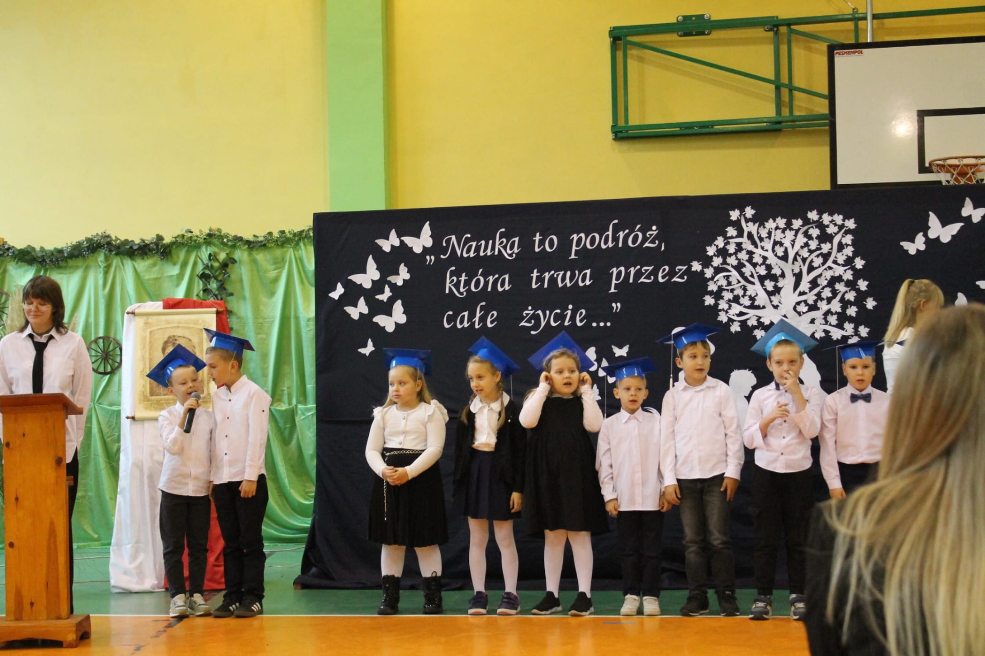 Nie zabrakło również części artystycznej. Uczniowie przygotowali inscenizację dialogową, podczas której spotkali się z patronką szkoły, Marią Konopnicką. Poetka, w tej niezwykłej rozmowie, skierowała do uczniów i nauczycieli pełne ciepła słowa o wartościach, które są najważniejsze: o nauce, pracy, szacunku i miłości do ojczyzny.