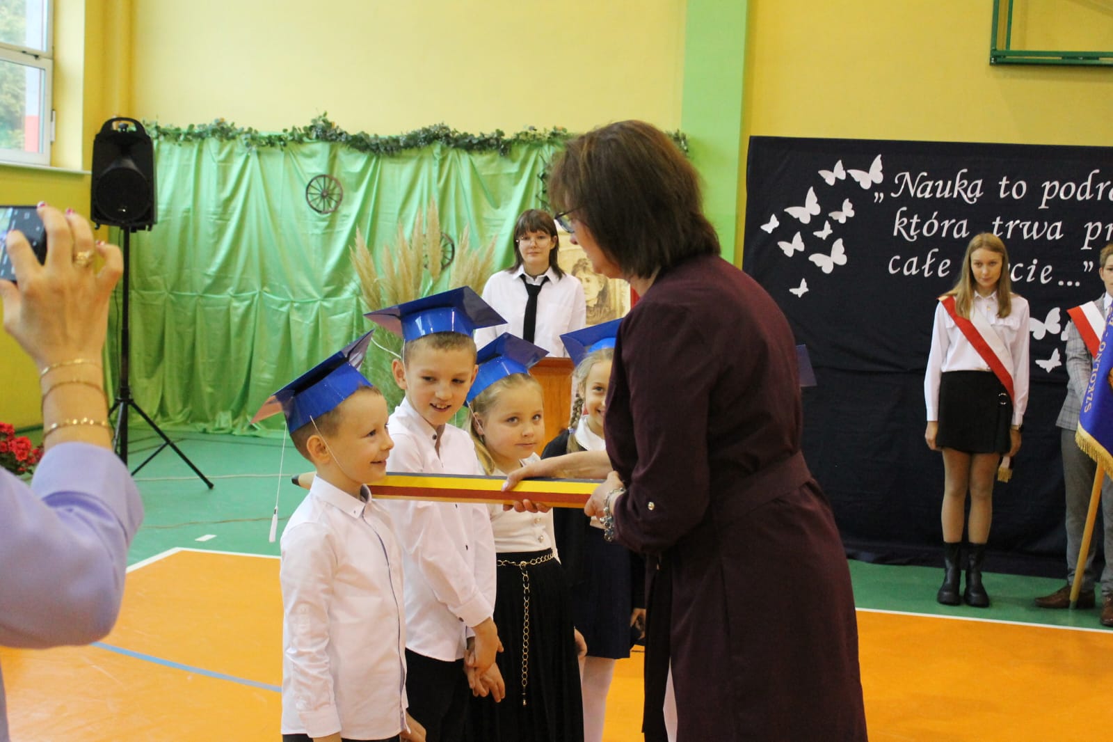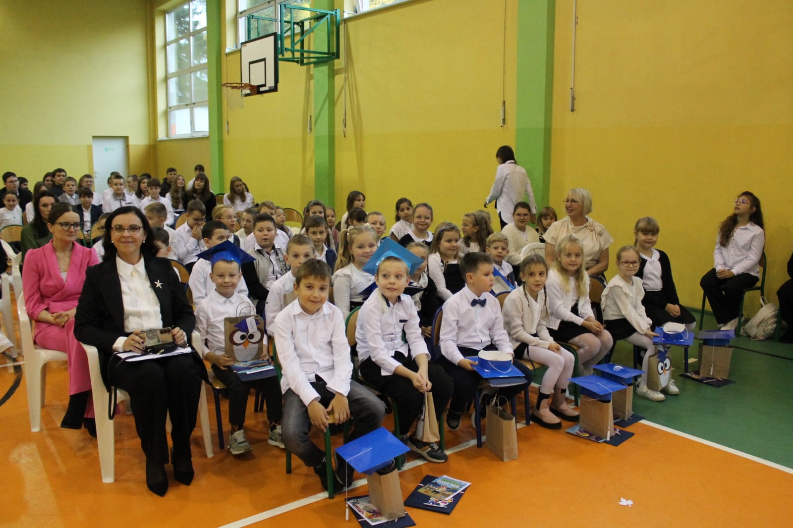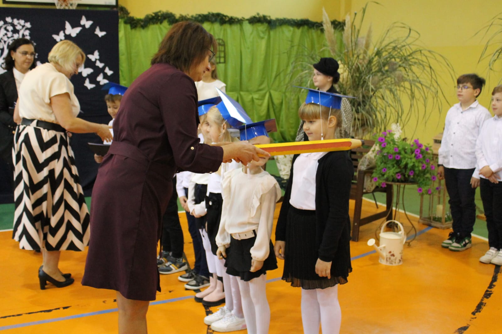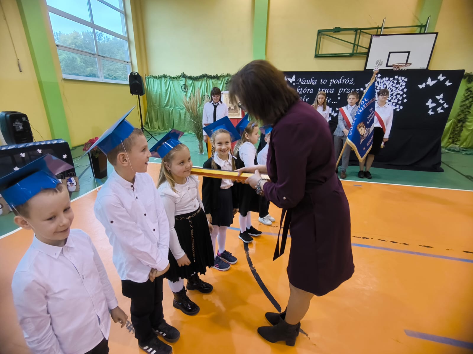 Najważniejszym momentem tego dnia było ślubowanie pierwszoklasistów. Zanim jednak zostali przyjęci do grona uczniów, musieli przejść kilka prób przygotowanych przez starszych kolegów. Każda z nich miała sprawdzić ich wiedzę, odwagę i gotowość do szkolnych obowiązków. Dzieci poradziły sobie znakomicie, a ich uśmiechy mówiły wszystko! Wreszcie nadszedł moment pasowania symbolicznym ołówkiem przez panią dyrektor Agnieszkę Misiak – i od tej chwili nasi najmłodsi oficjalnie stali się uczniami naszej szkoły.