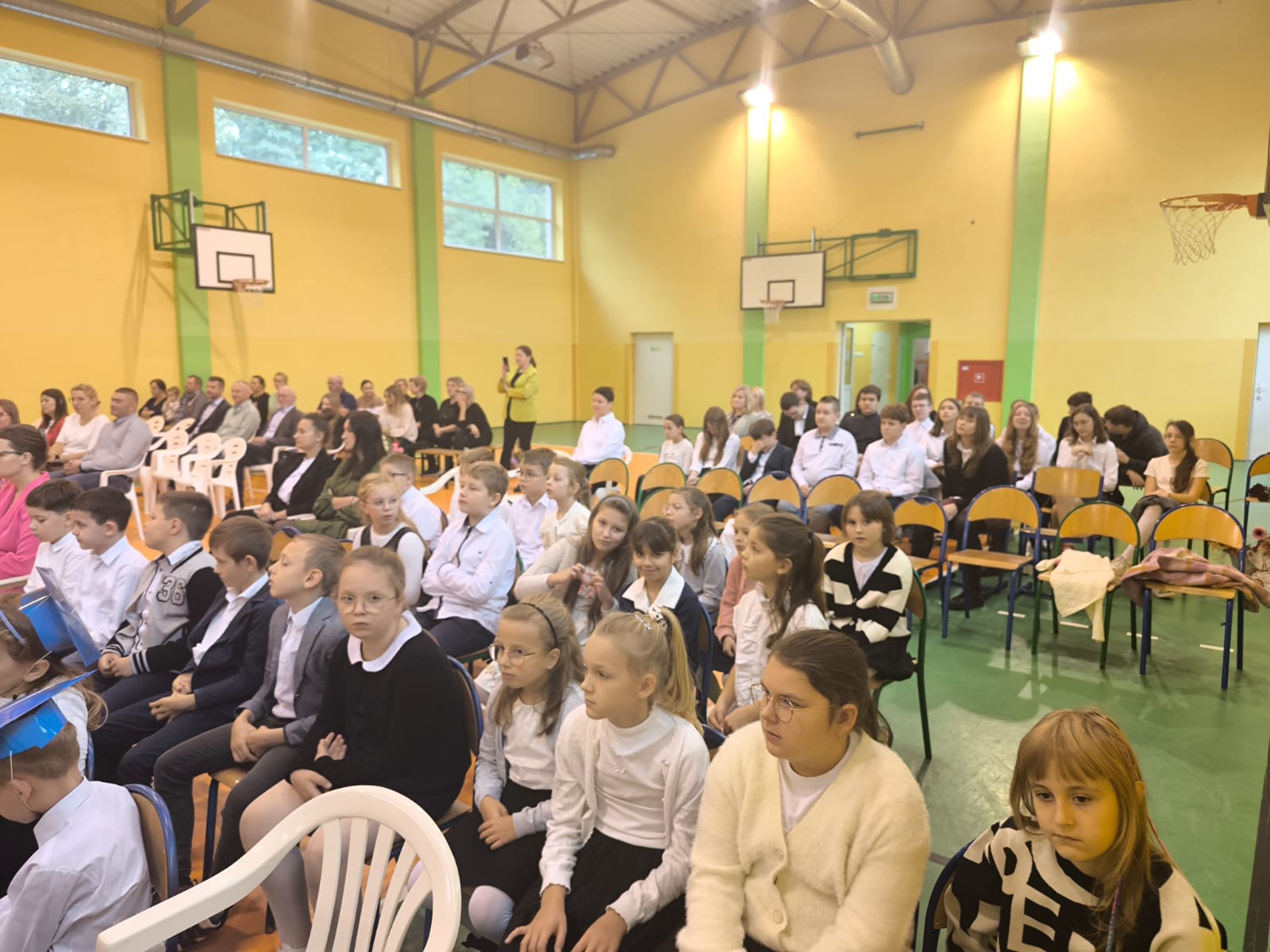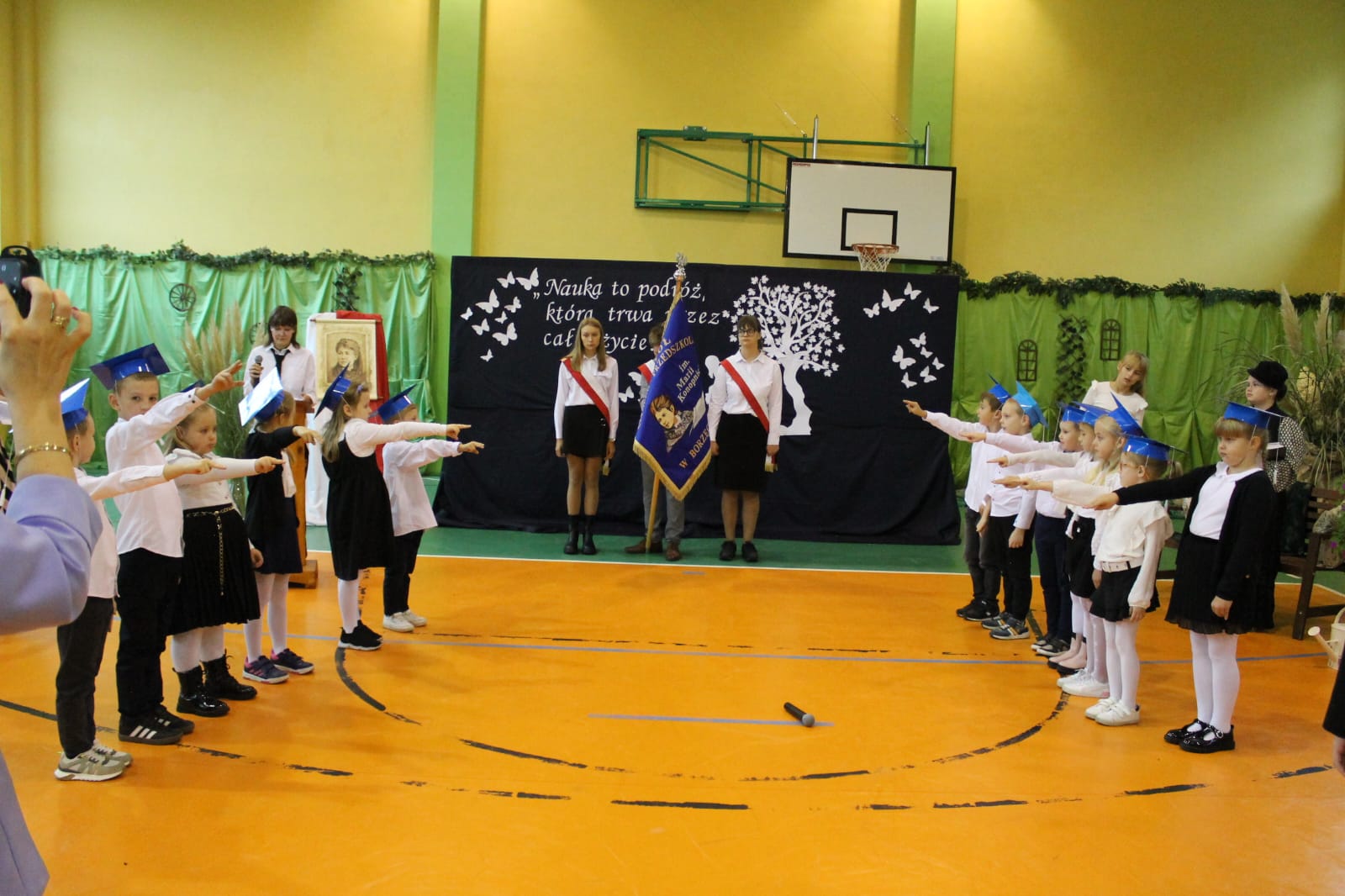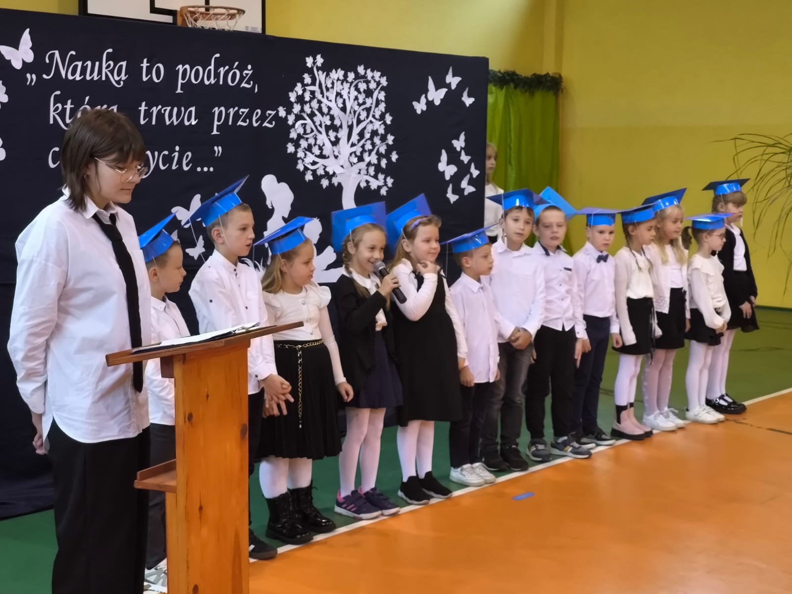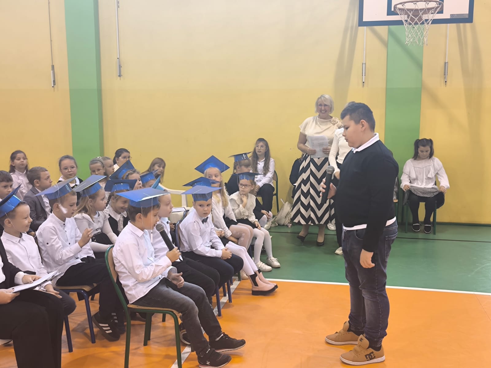 Najważniejszym momentem tego dnia było ślubowanie pierwszoklasistów. Zanim jednak zostali przyjęci do grona uczniów, musieli przejść kilka prób przygotowanych przez starszych kolegów. Każda z nich miała sprawdzić ich wiedzę, odwagę i gotowość do szkolnych obowiązków. Dzieci poradziły sobie znakomicie, a ich uśmiechy mówiły wszystko! Wreszcie nadszedł moment pasowania symbolicznym ołówkiem przez panią dyrektor Agnieszkę Misiak – i od tej chwili nasi najmłodsi oficjalnie stali się uczniami naszej szkoły.
