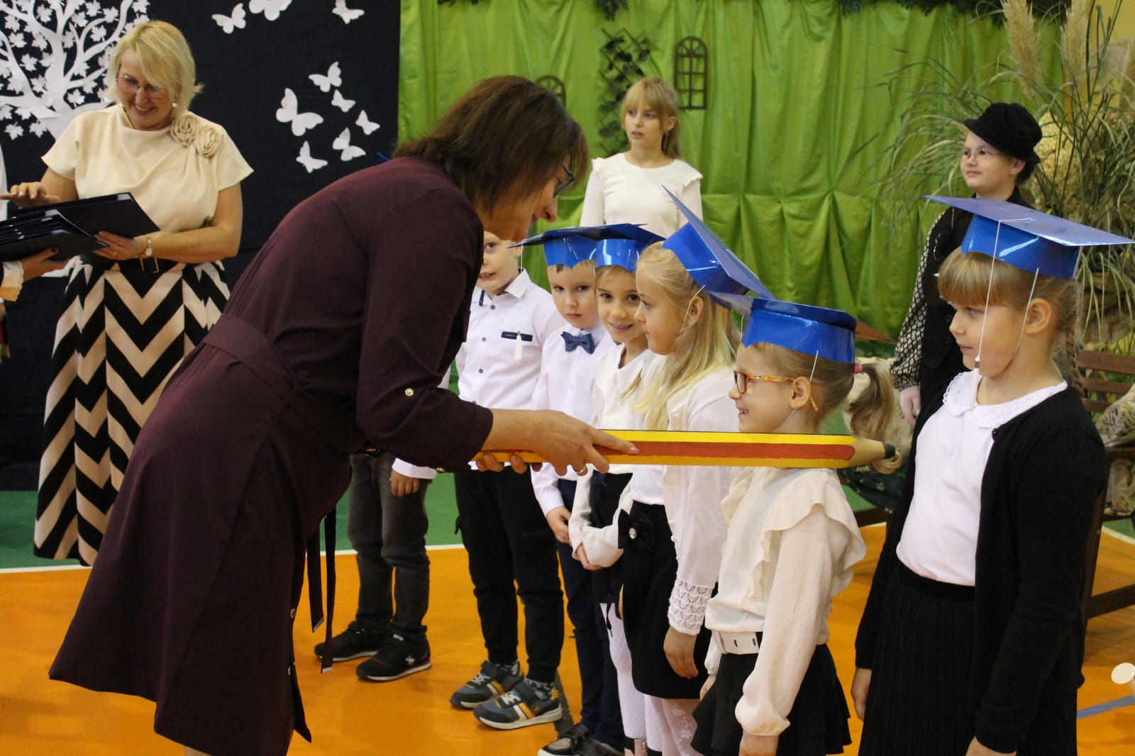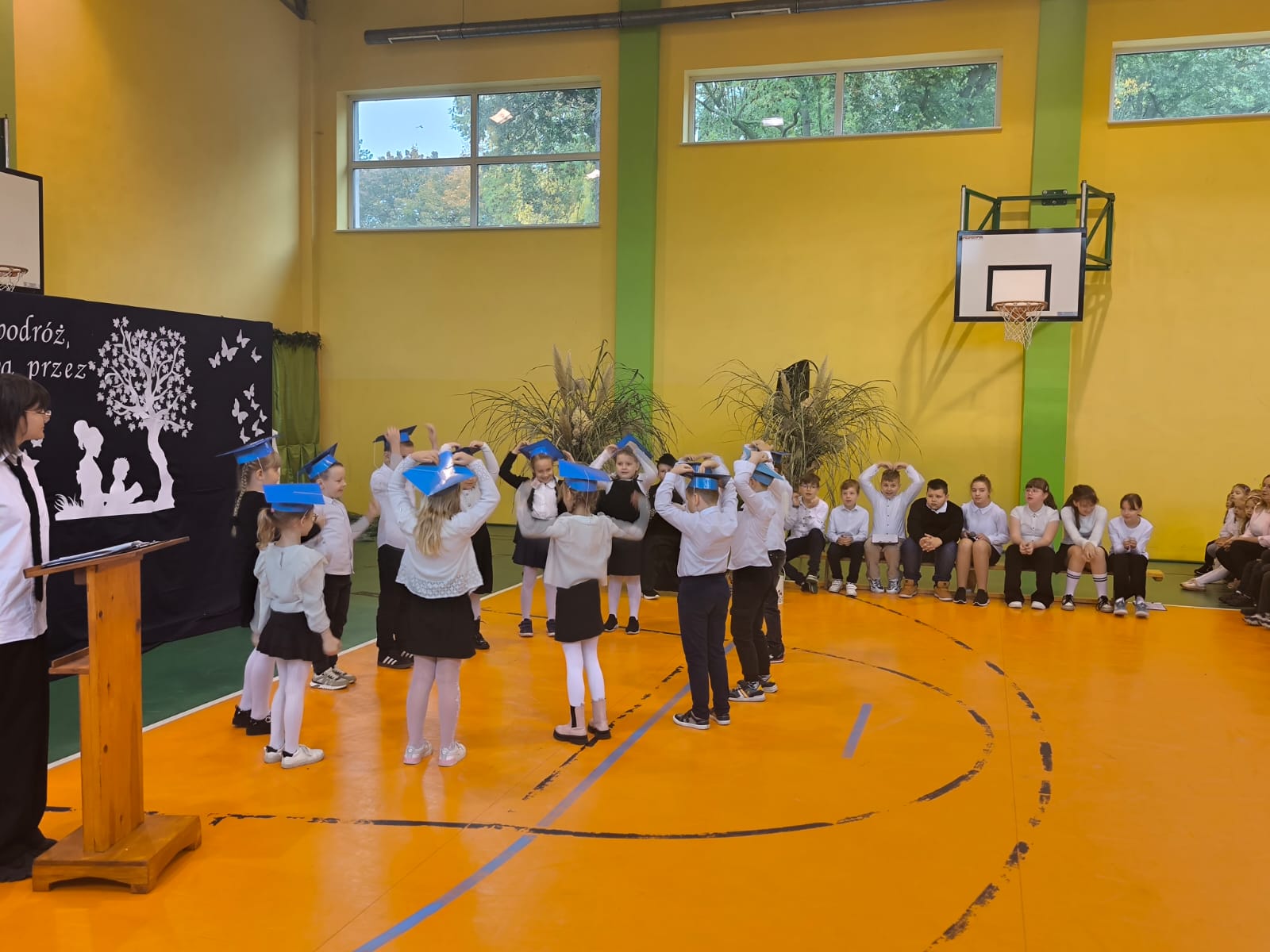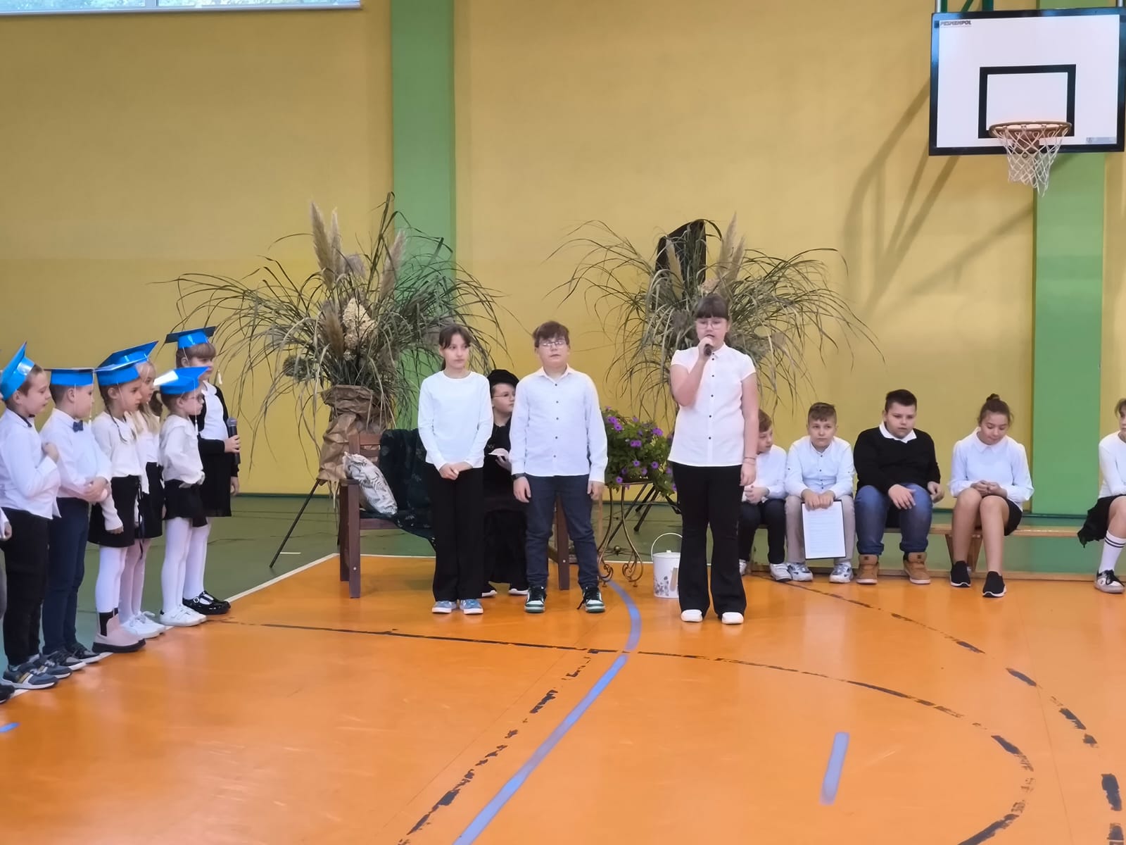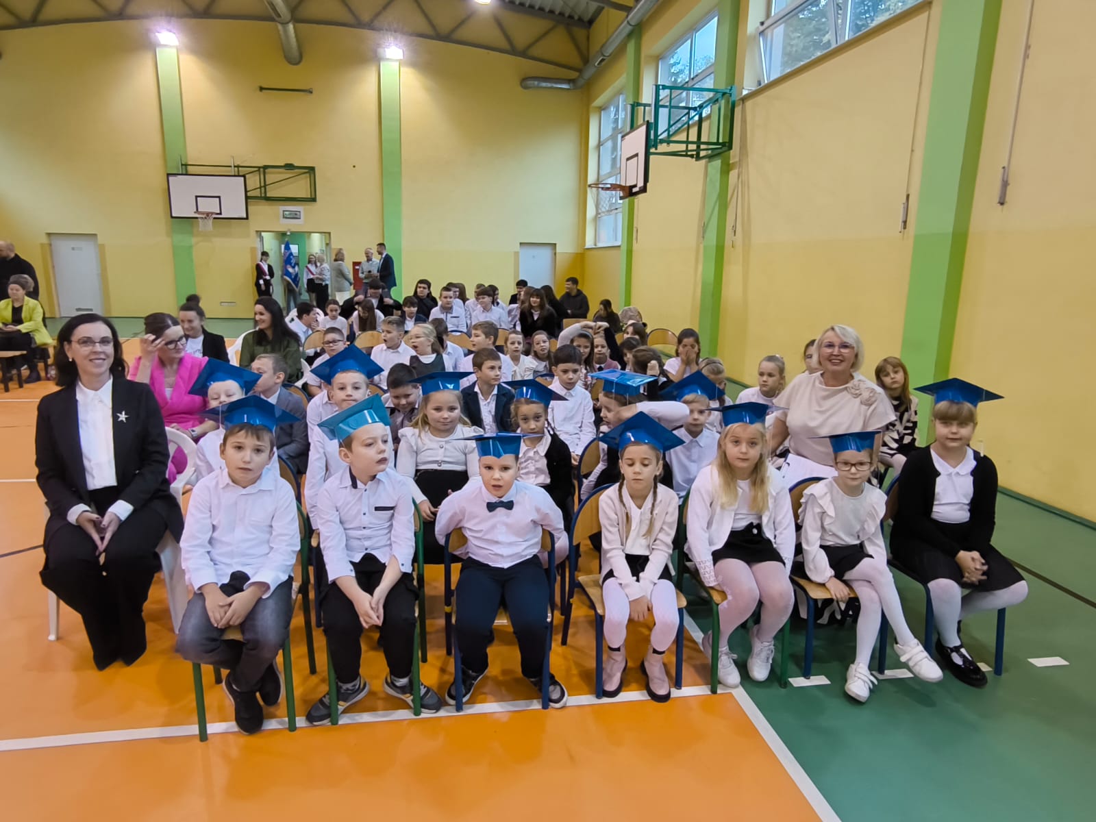 Najważniejszym momentem tego dnia było ślubowanie pierwszoklasistów. Zanim jednak zostali przyjęci do grona uczniów, musieli przejść kilka prób przygotowanych przez starszych kolegów. Każda z nich miała sprawdzić ich wiedzę, odwagę i gotowość do szkolnych obowiązków. Dzieci poradziły sobie znakomicie, a ich uśmiechy mówiły wszystko! Wreszcie nadszedł moment pasowania symbolicznym ołówkiem przez panią dyrektor Agnieszkę Misiak – i od tej chwili nasi najmłodsi oficjalnie stali się uczniami naszej szkoły.