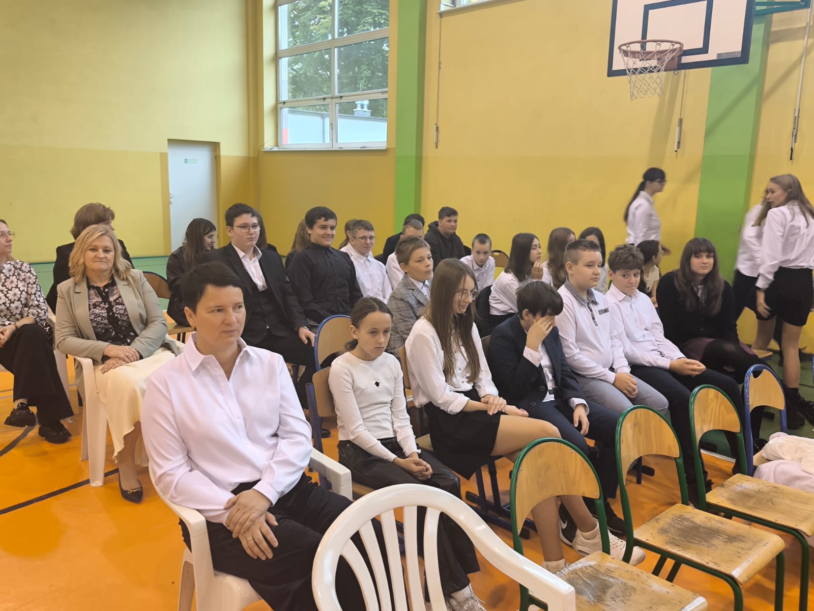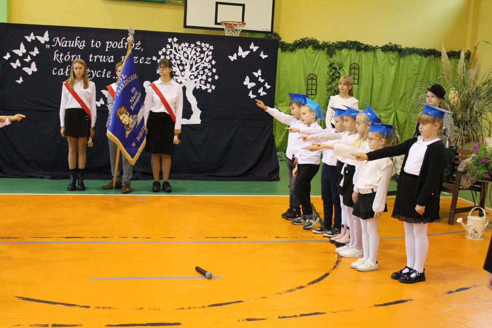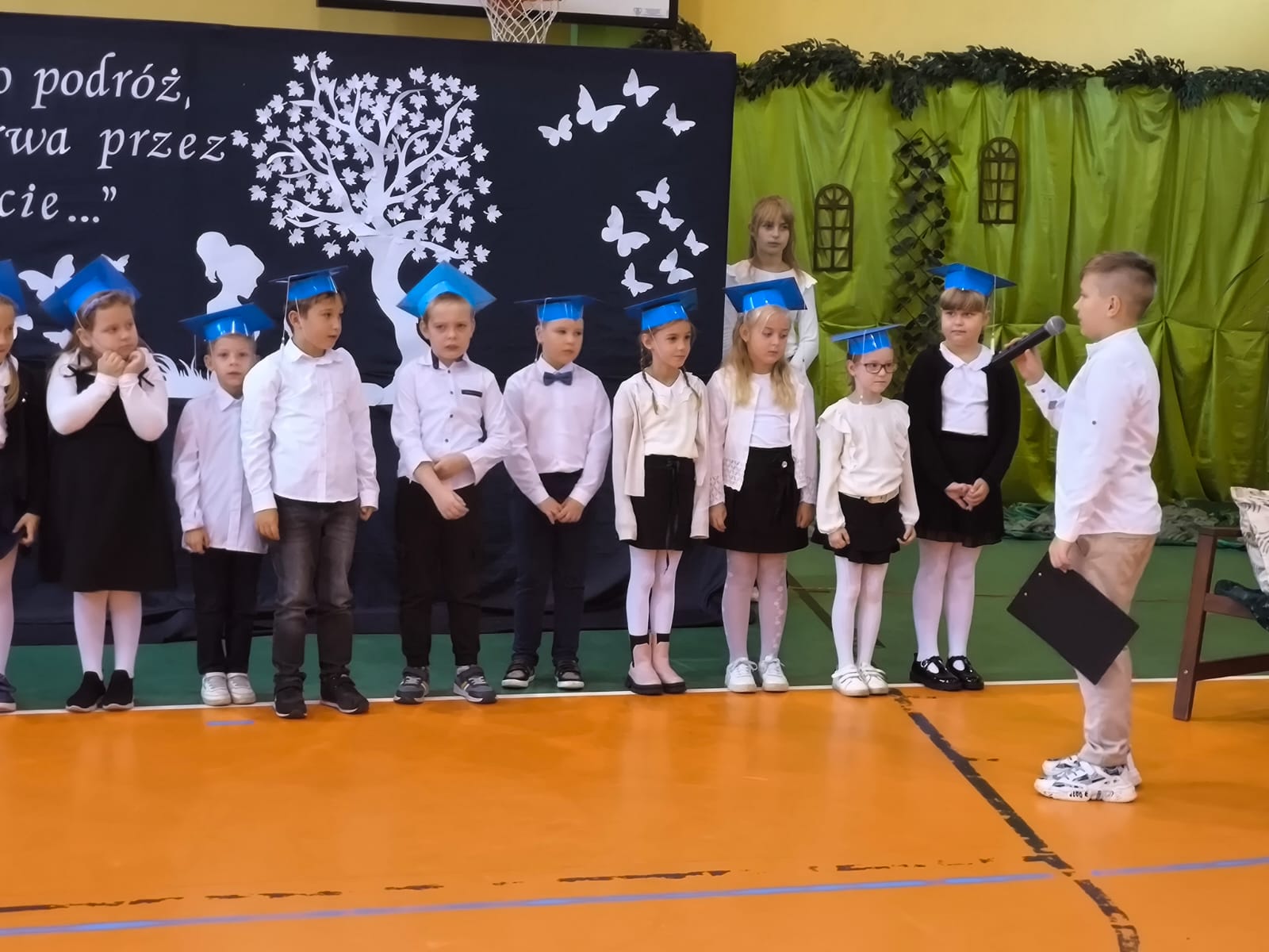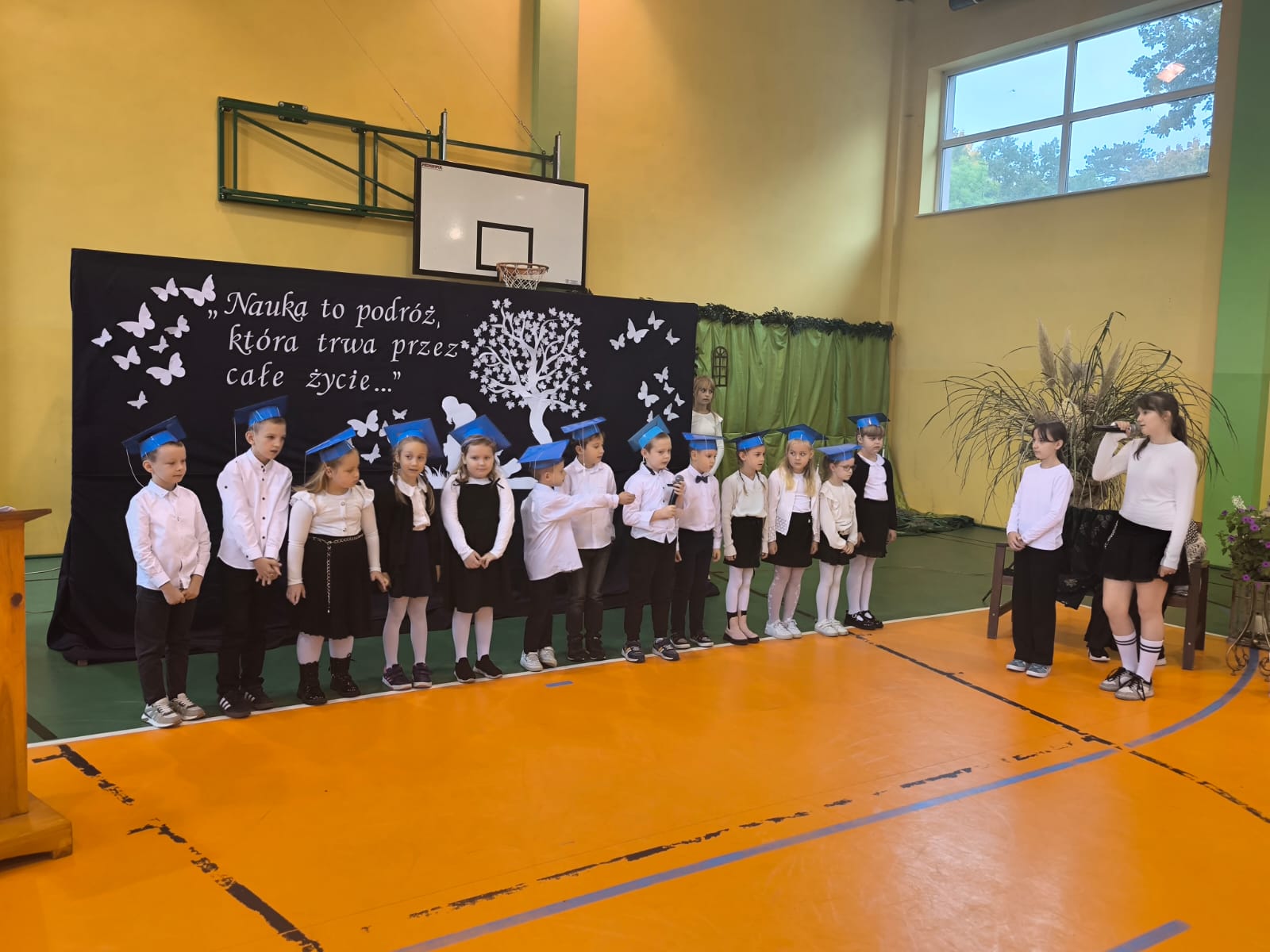 Najważniejszym momentem tego dnia było ślubowanie pierwszoklasistów. Zanim jednak zostali przyjęci do grona uczniów, musieli przejść kilka prób przygotowanych przez starszych kolegów. Każda z nich miała sprawdzić ich wiedzę, odwagę i gotowość do szkolnych obowiązków. Dzieci poradziły sobie znakomicie, a ich uśmiechy mówiły wszystko! Wreszcie nadszedł moment pasowania symbolicznym ołówkiem przez panią dyrektor Agnieszkę Misiak – i od tej chwili nasi najmłodsi oficjalnie stali się uczniami naszej szkoły.