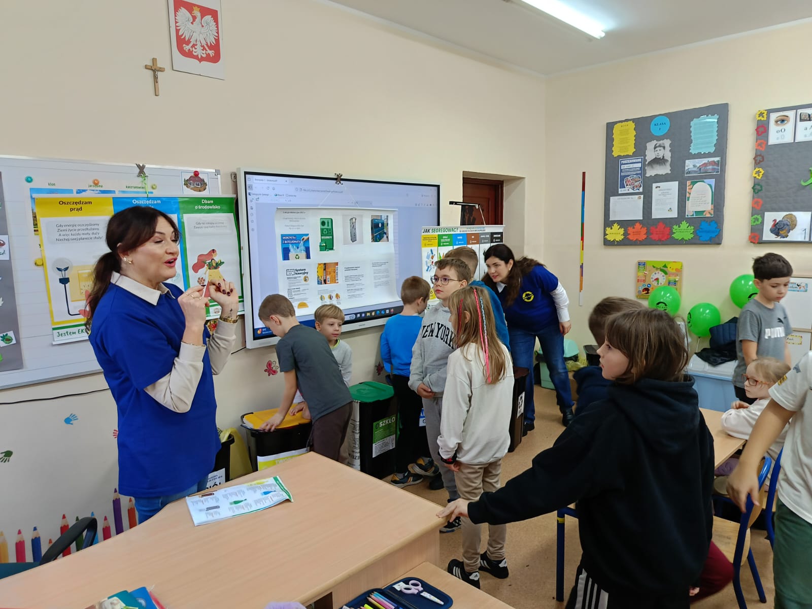 Uczniowie doskonale poradzili sobie z przyporządkowaniem określonych odpadów do właściwych koszy/ worków. Zostali nagrodzeni balonikami oraz workami sportowymi z logo firmy.
