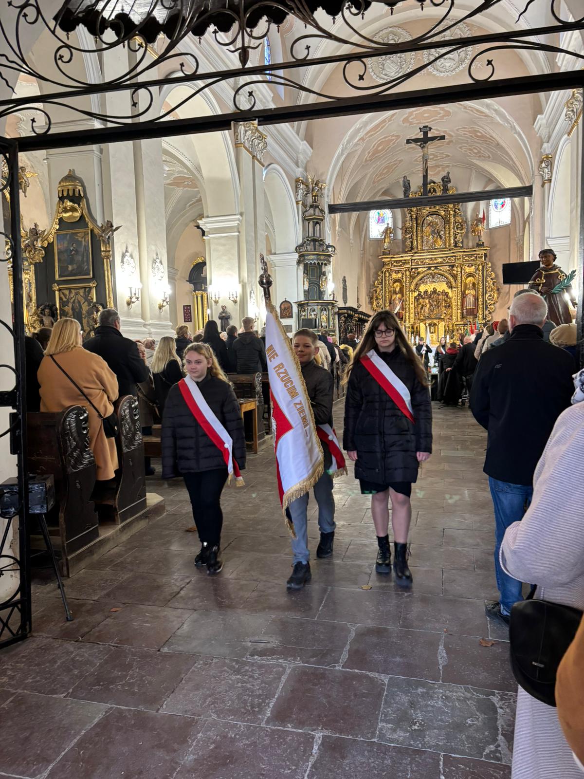 We wtorek, 11.11.2025r. poczet sztandarowy naszej szkoły uczestniczył w gminnych obchodach Narodowego Święta Niepodległości w Koźminie Wielkopolskim. O godzinie 10:00 została odprawiona msza św. w kościele farnym, a po mszy św. uczestnicy uroczystości wyruszyli pod Pomnik Wolności, gdzie odśpiewano hymn państwowy.