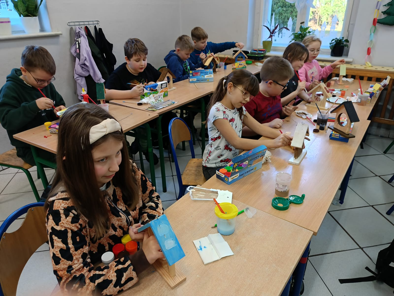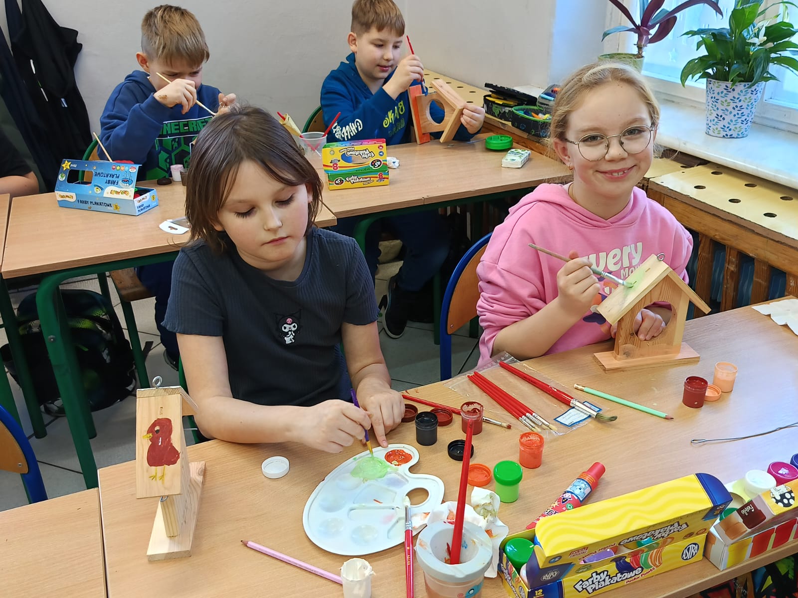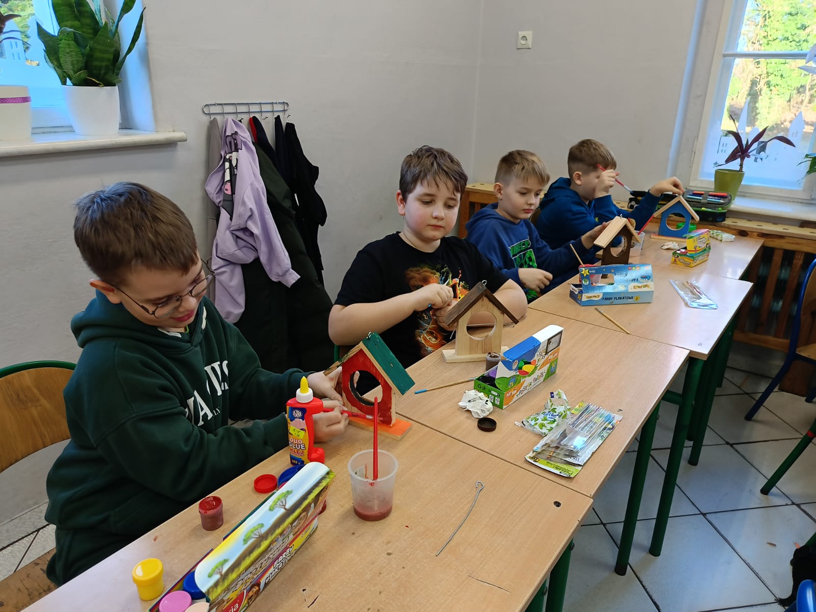 Uczniowie klasy III w ramach projektu „Z darami natury świat nie jest ponury” wykonali „Ekodomki dla ptaków”. Przygotowali ptasią stołówkę, którą umieszczono na drzewie w pobliżu szkoły oraz pomalowali własne drewniane karmniki, które zabrali do domów. Dzięki temu uczniowie mogę obserwować ptaki oraz dbać o ich regularne dokarmianie również poza szkołą. Realizacja zadania była nie tylko ciekawą formą nauki poprzez działanie, ale także doskonałą okazją do rozwijania kreatywności, wrażliwości ekologicznej oraz odpowiedzialności za środowisko naturalne.