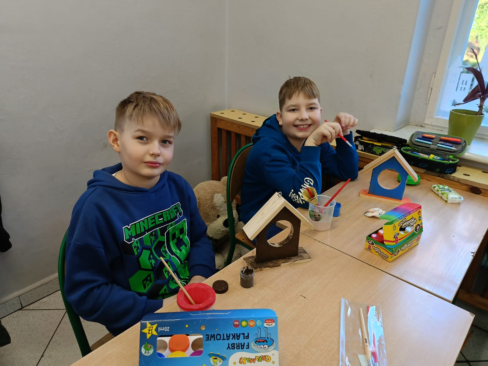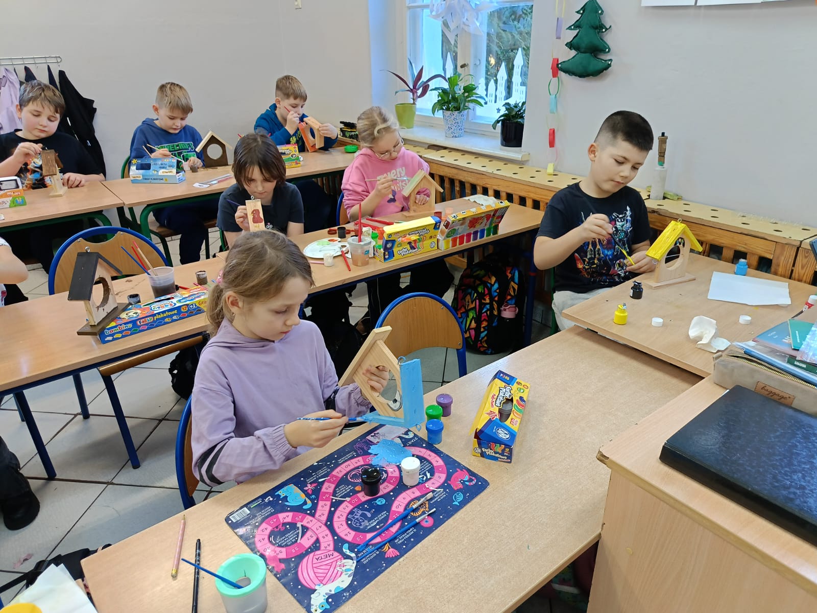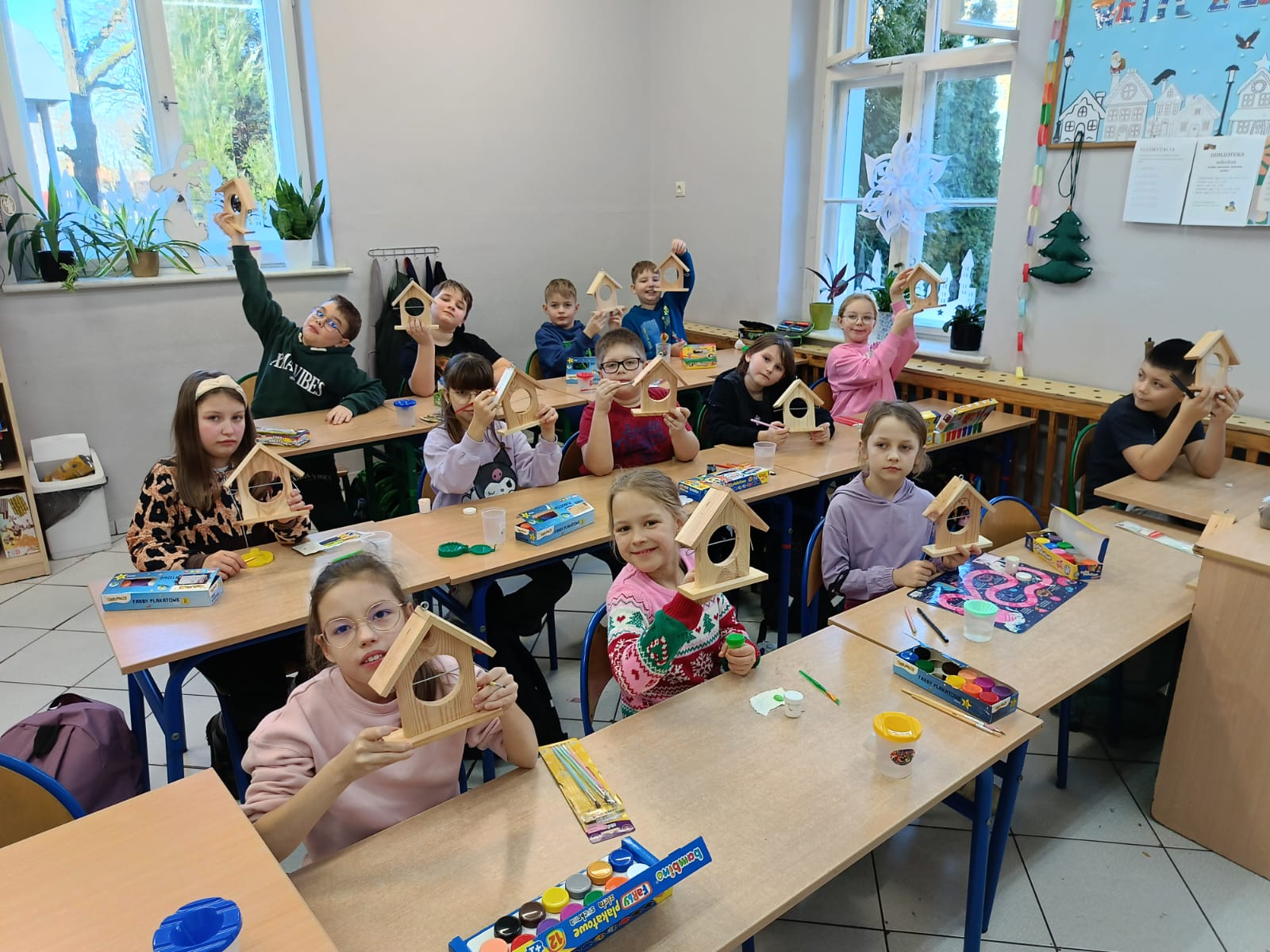 Uczniowie klasy III w ramach projektu „Z darami natury świat nie jest ponury” wykonali „Ekodomki dla ptaków”. Przygotowali ptasią stołówkę, którą umieszczono na drzewie w pobliżu szkoły oraz pomalowali własne drewniane karmniki, które zabrali do domów. Dzięki temu uczniowie mogę obserwować ptaki oraz dbać o ich regularne dokarmianie również poza szkołą. Realizacja zadania była nie tylko ciekawą formą nauki poprzez działanie, ale także doskonałą okazją do rozwijania kreatywności, wrażliwości ekologicznej oraz odpowiedzialności za środowisko naturalne.