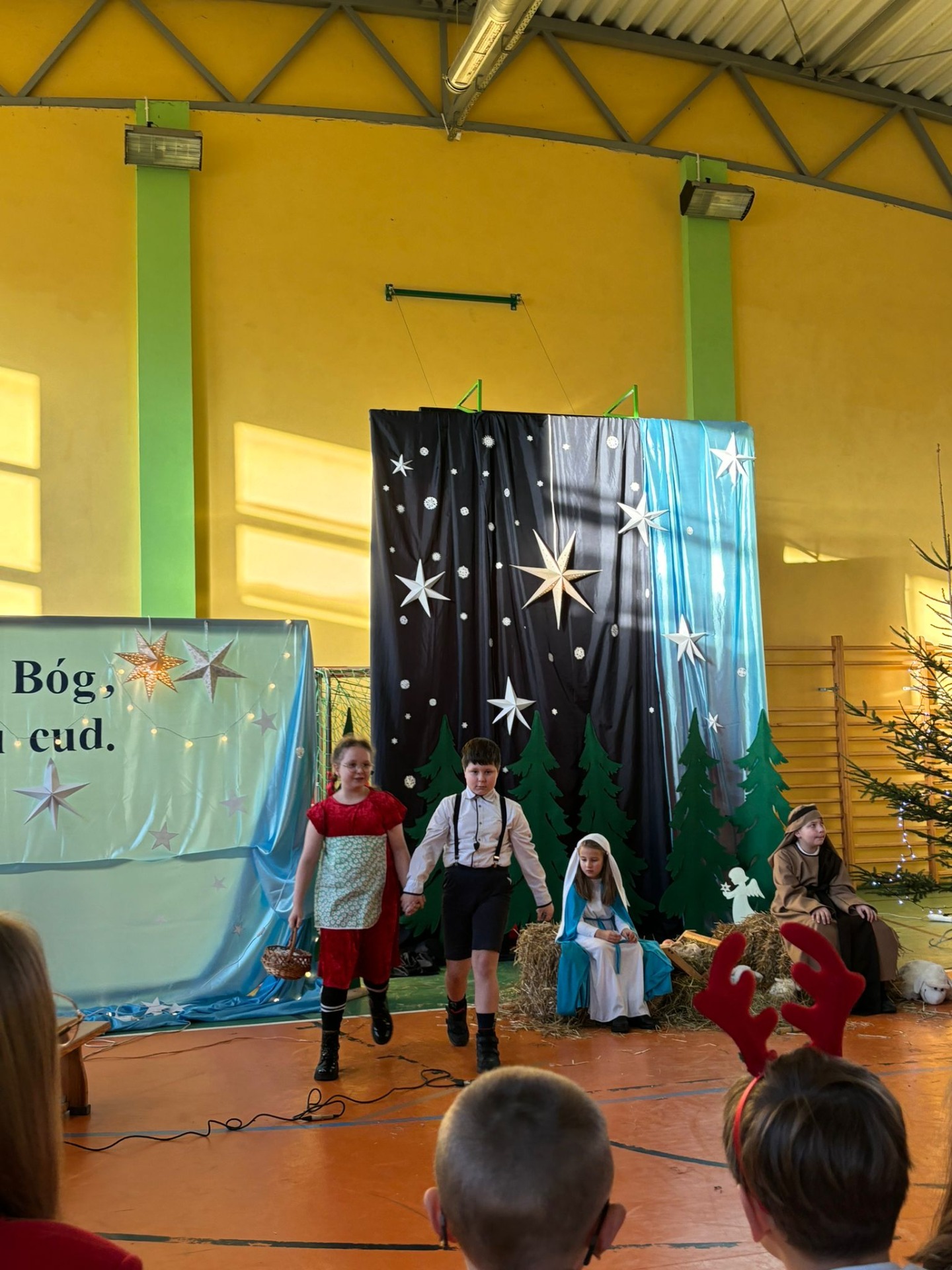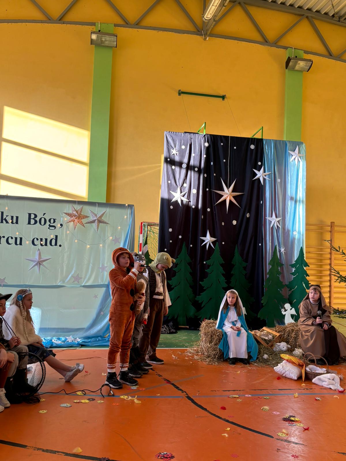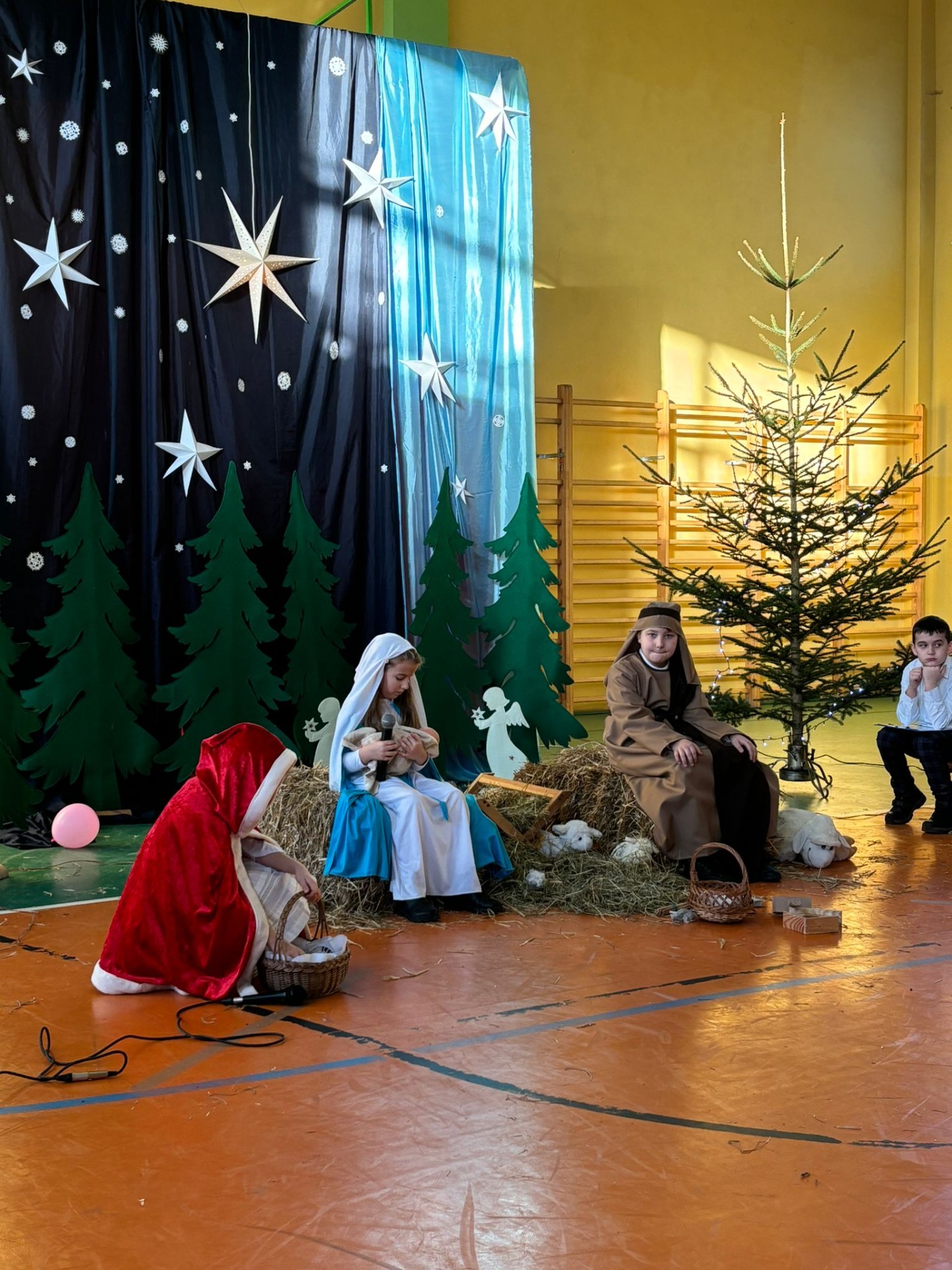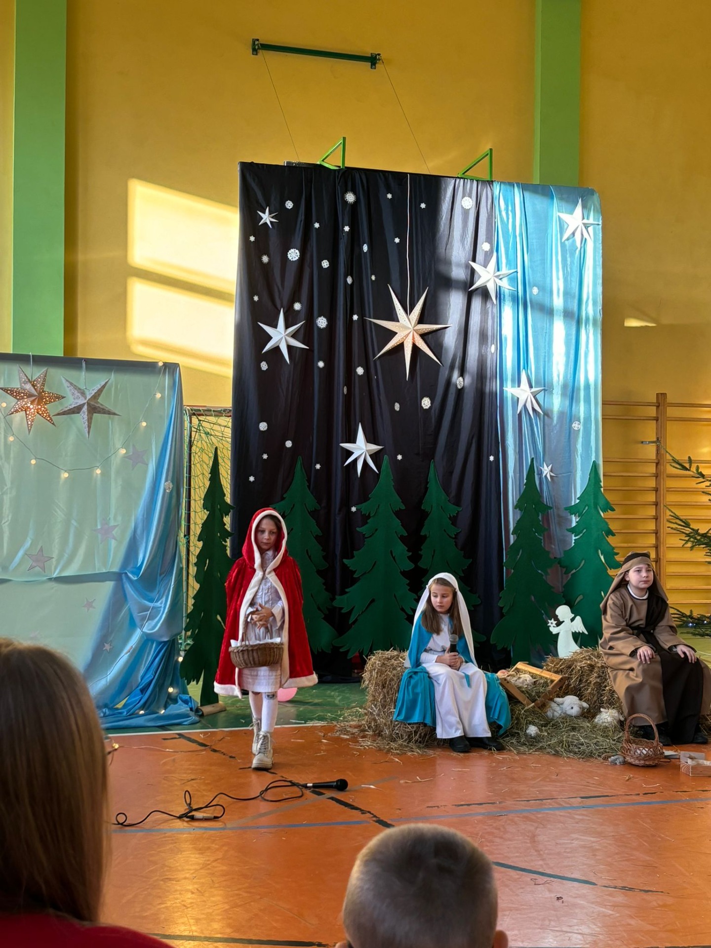 Następnie przenieśliśmy się w niezwykły świat, gdzie bajkowe postacie przybywały do stajenki, by oddać pokłon oraz złożyć dary NOWONARODZONEMU DZIECIĄTKU. Każdy ofiarował to co najpiękniejsze czyli dar serca, czasem złoty pantofelek a innym razem tylko zapałki. Zaangażowanie dzieci i piękne stroje pozwoliły z łatwością rozpoznać Dziewczynkę z zapałkami, Czerwonego Kapturka, Calineczkę, Pinokia, Osła, Shreka, Ciastka, Jasia i Małgosię, Kopciuszka, Starego Rybaka, Sierotkę Marysię i Krasnoludki, Smerfetki, Klakiera, Królową Śniegu i Gerdę.