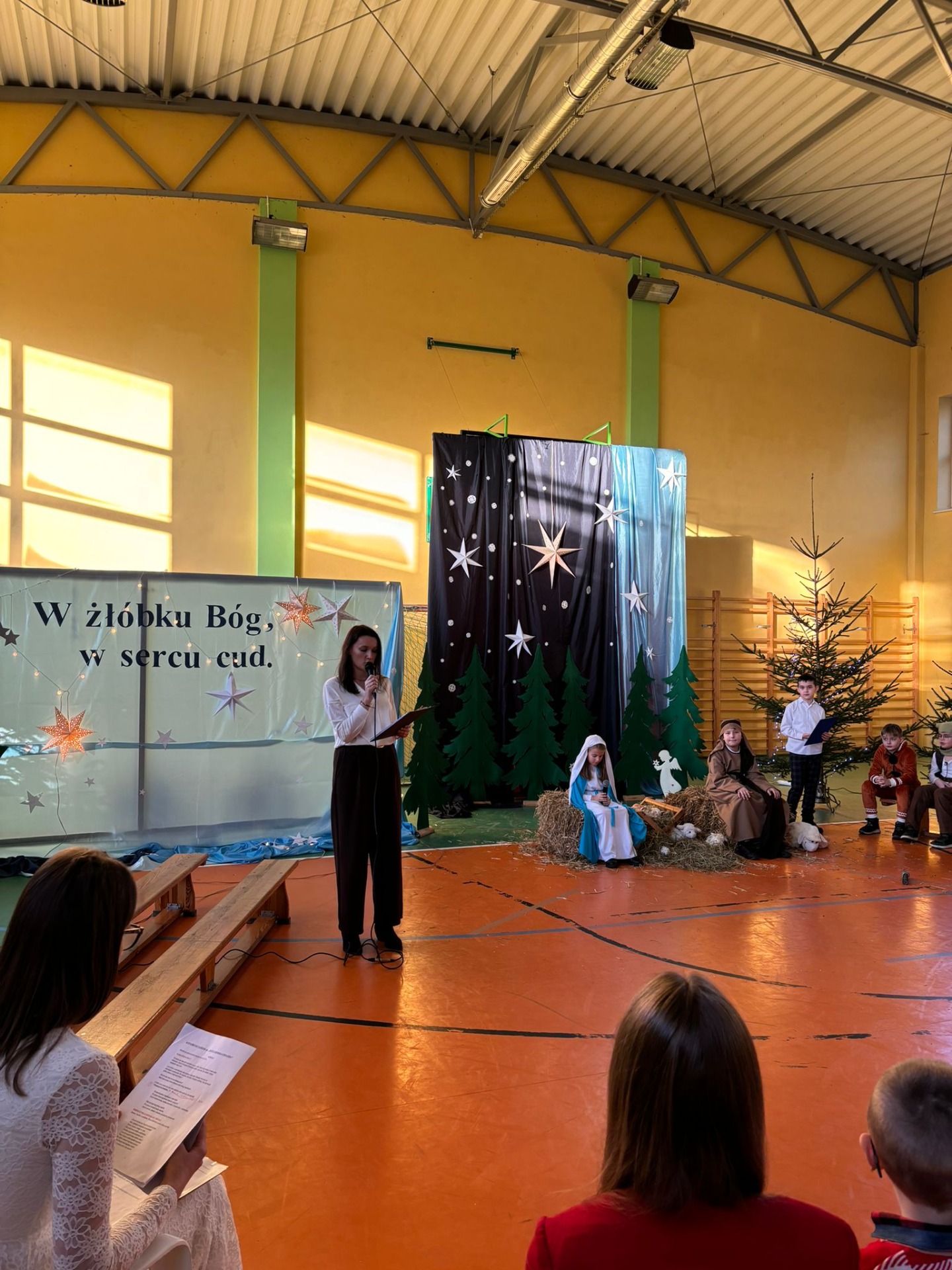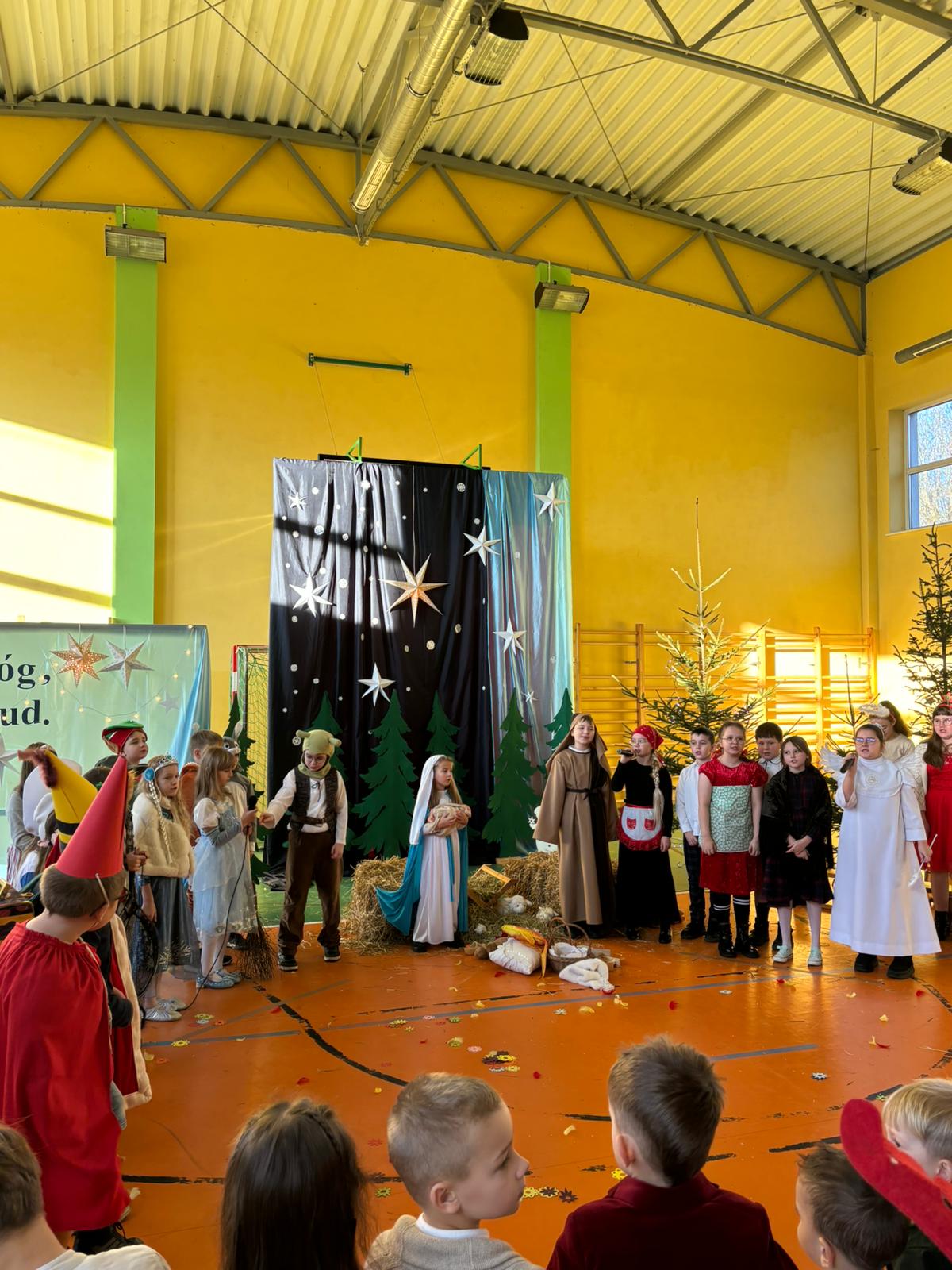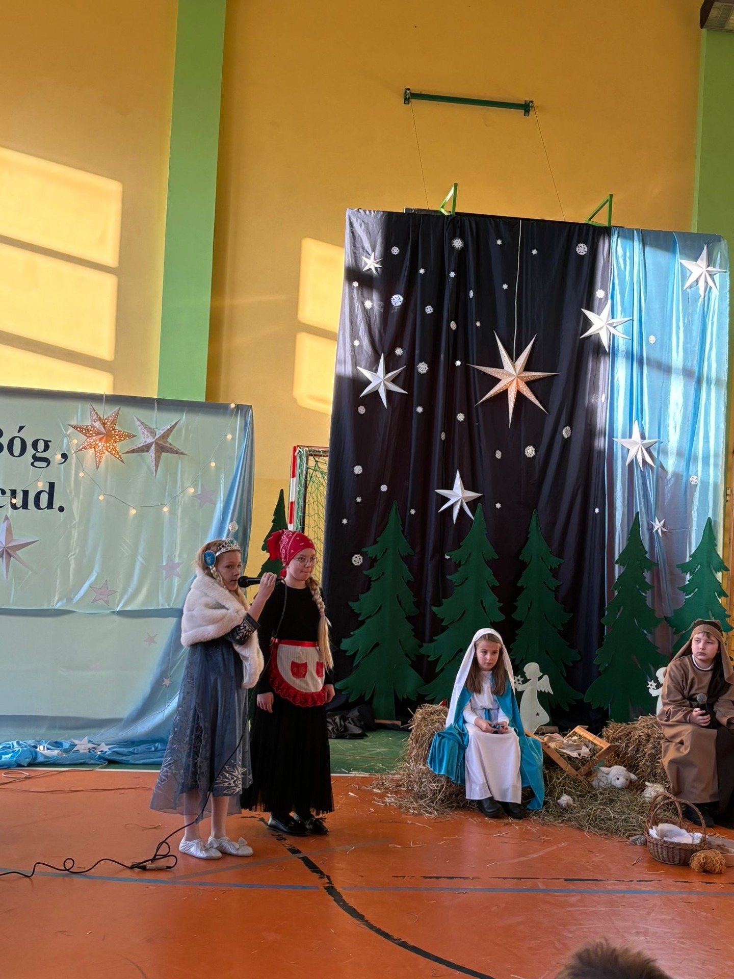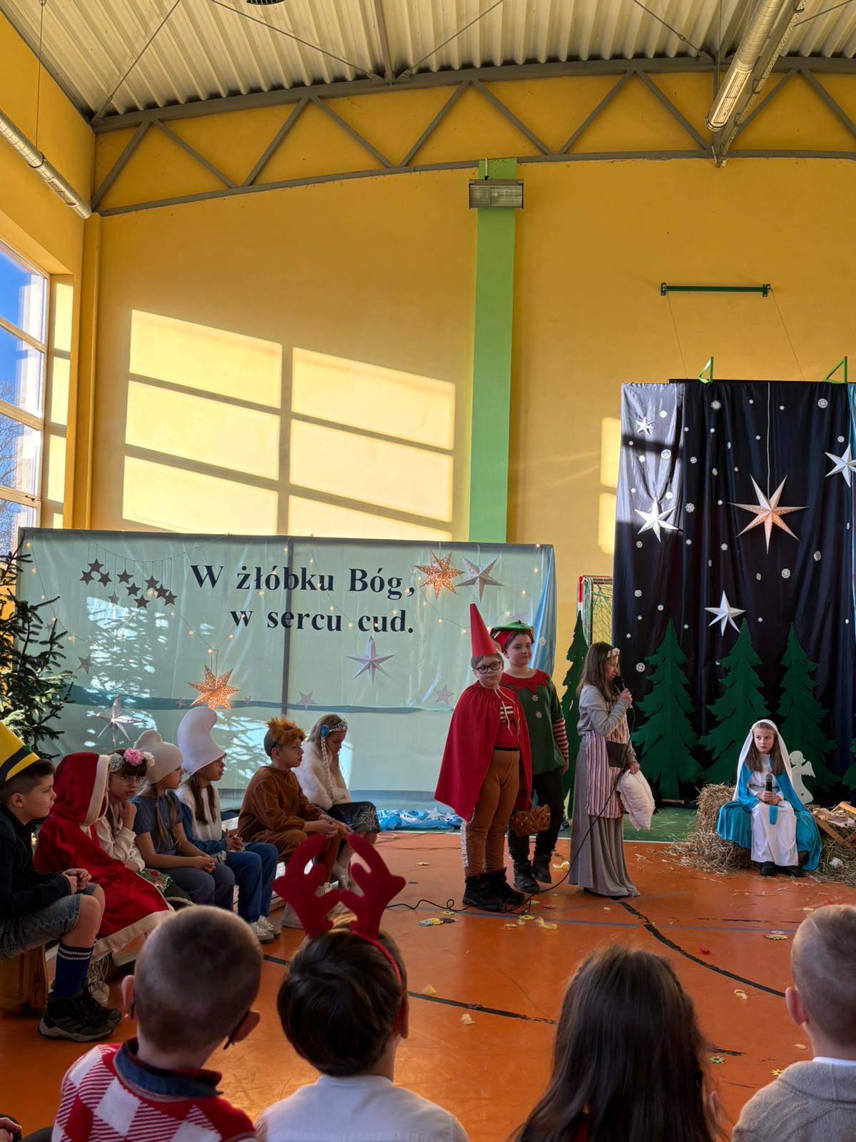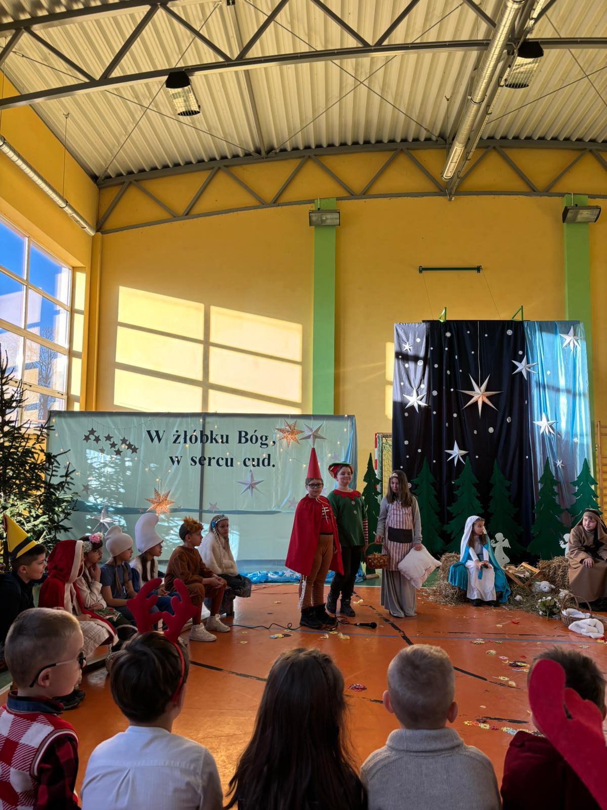 Następnie przenieśliśmy się w niezwykły świat, gdzie bajkowe postacie przybywały do stajenki, by oddać pokłon oraz złożyć dary NOWONARODZONEMU DZIECIĄTKU. Każdy ofiarował to co najpiękniejsze czyli dar serca, czasem złoty pantofelek a innym razem tylko zapałki. Zaangażowanie dzieci i piękne stroje pozwoliły z łatwością rozpoznać Dziewczynkę z zapałkami, Czerwonego Kapturka, Calineczkę, Pinokia, Osła, Shreka, Ciastka, Jasia i Małgosię, Kopciuszka, Starego Rybaka, Sierotkę Marysię i Krasnoludki, Smerfetki, Klakiera, Królową Śniegu i Gerdę.