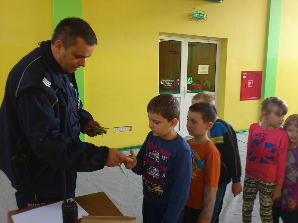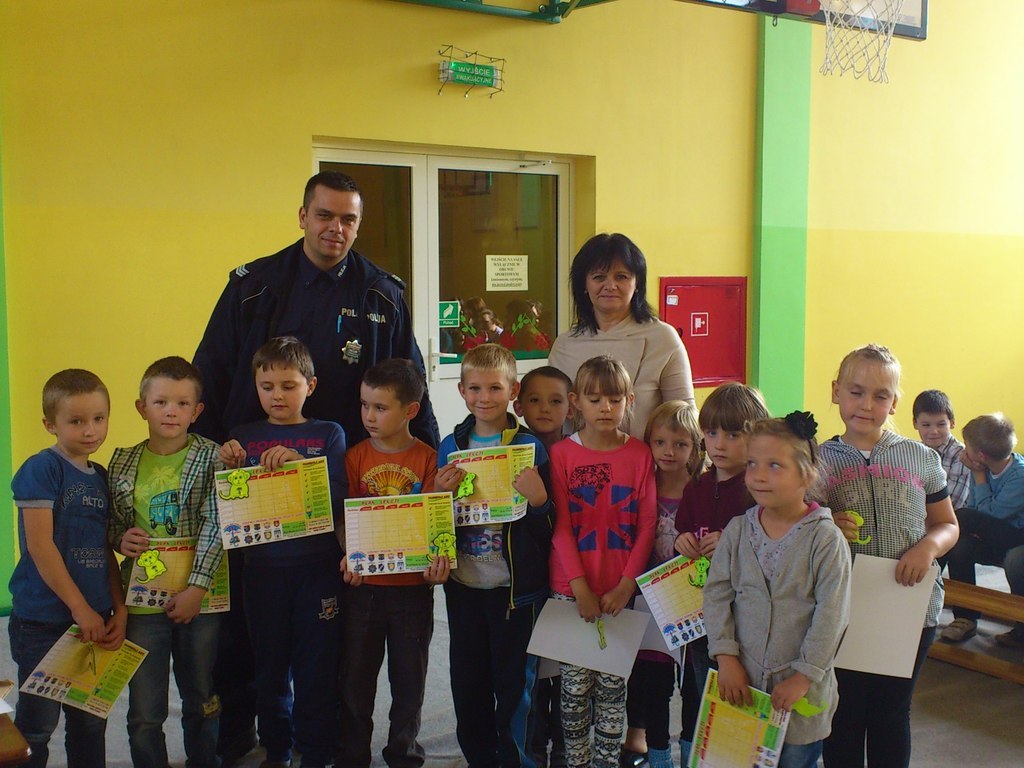 Jak co roku pierwszoklasiści dostali plany lekcji oraz odblaski, które uwidocznią ich na drodze. Na zakończenie pan policjant prosił uczniów by zawsze bezpiecznie i rozważnie poruszali się po drogach.
