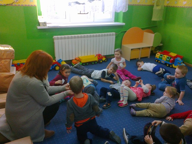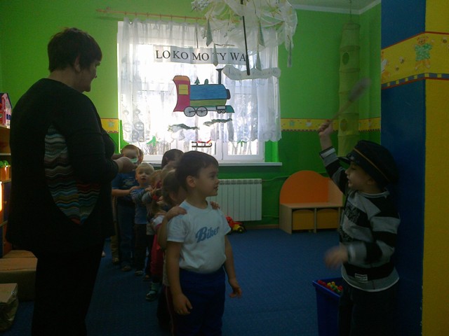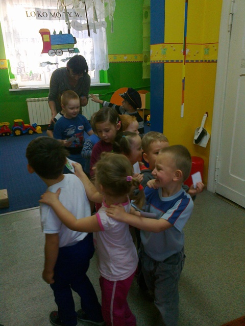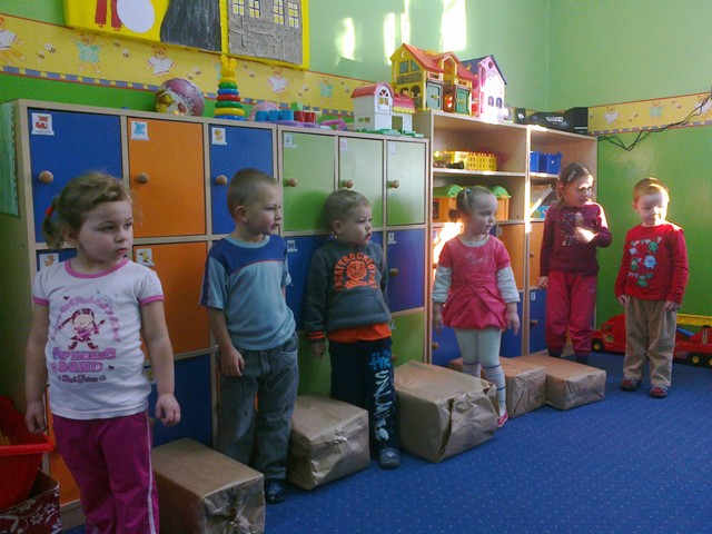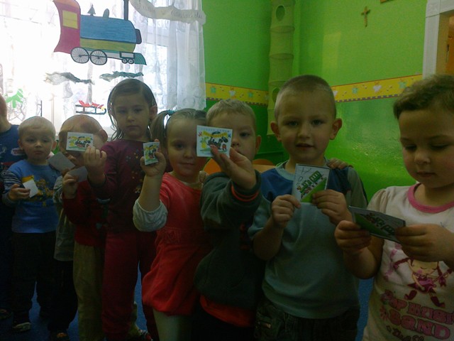 Dzieci obrazowo przedstawiły fragment wiersza „Lokomotywa”, następnie zaopatrzone w bilety wsiadły do przedszkolnego pociągu przy tym świetnie bawiąc się w rytmie muzyki. Kolejnym zadaniem było narysowanie na wagonikach, zawartość wagoników. Zdaniem przedszkolaków lokomotywa wiozła lizaki, parasolki, ciężarówki, balony, piłki