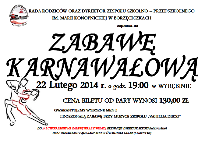 Zapisy u przewodniczącej Rady Rodziców, pani Moniki Golki i u Dyrektora Szkoły do 17 lutego 2014r.